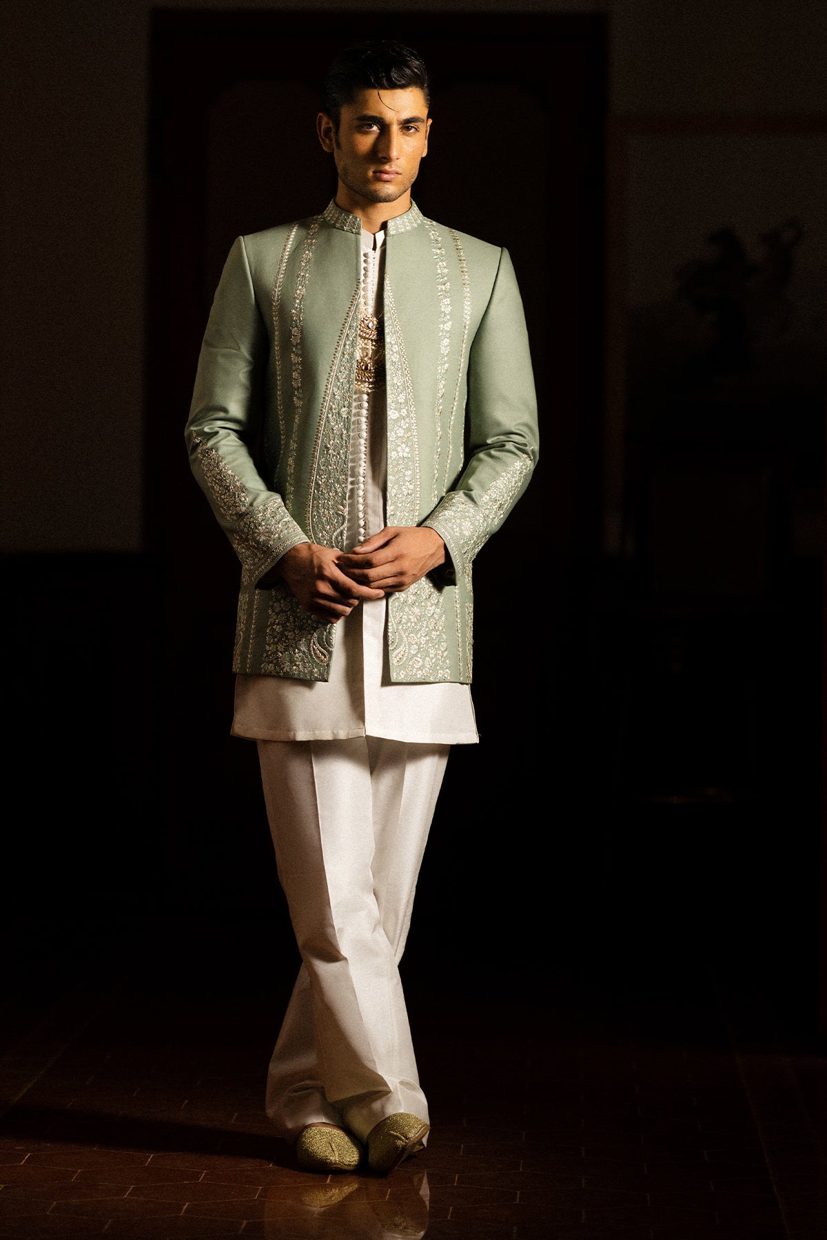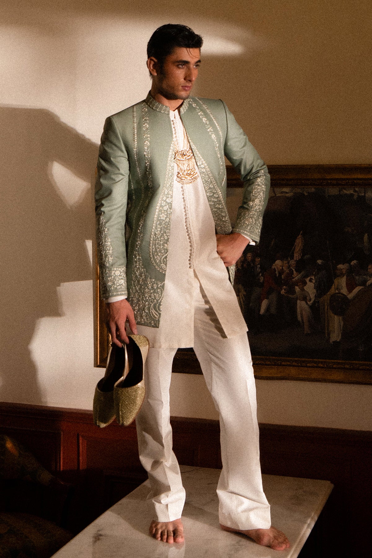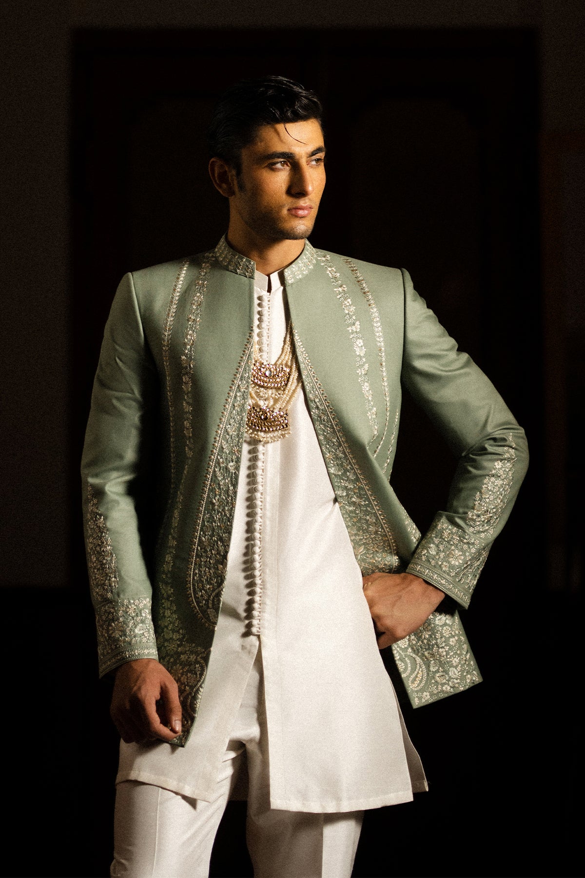 Make a statement this festive season with our turquoise embroidered jacket, featuring a unique pattern and distinctive design that exudes timeless charm. Paired with a raw silk open-style shirt and sleek pants, this ensemble is the perfect blend of sophistication and style — ideal for those who love to stand out effortlessly.