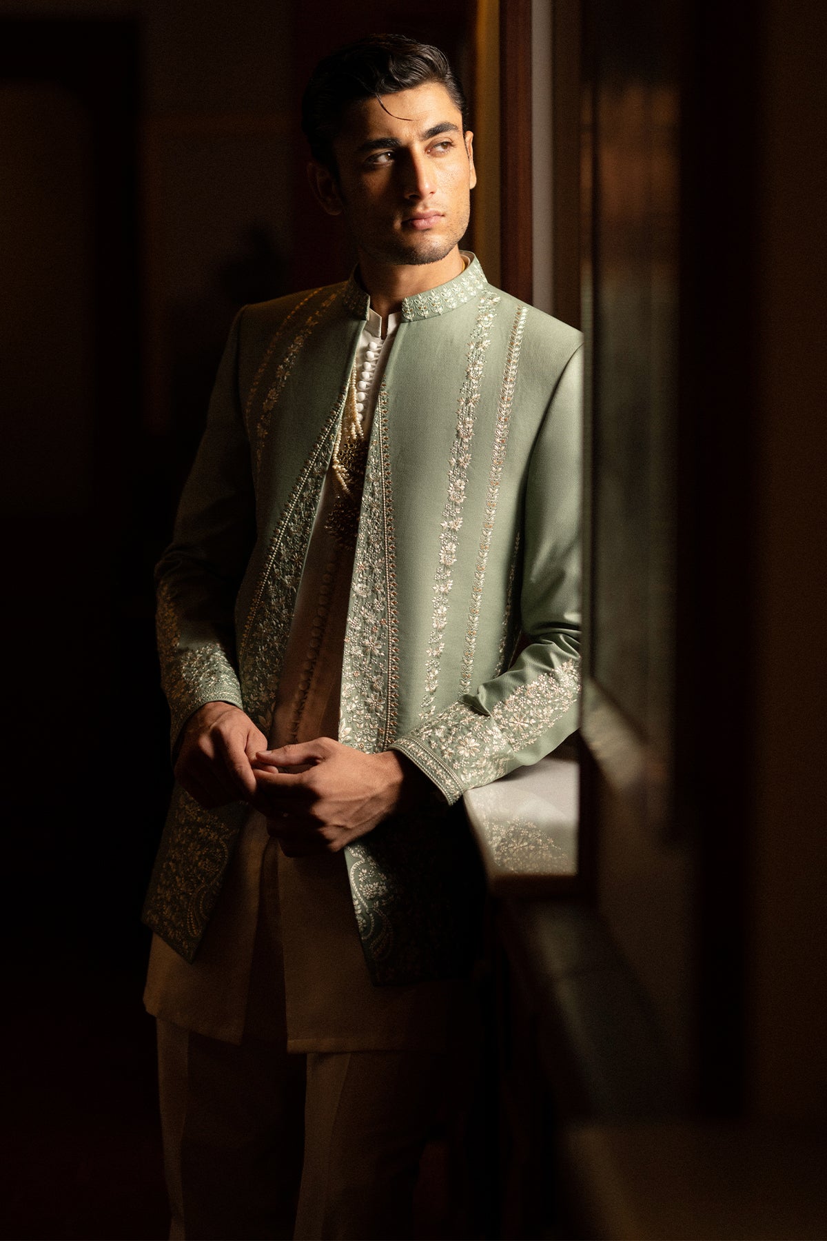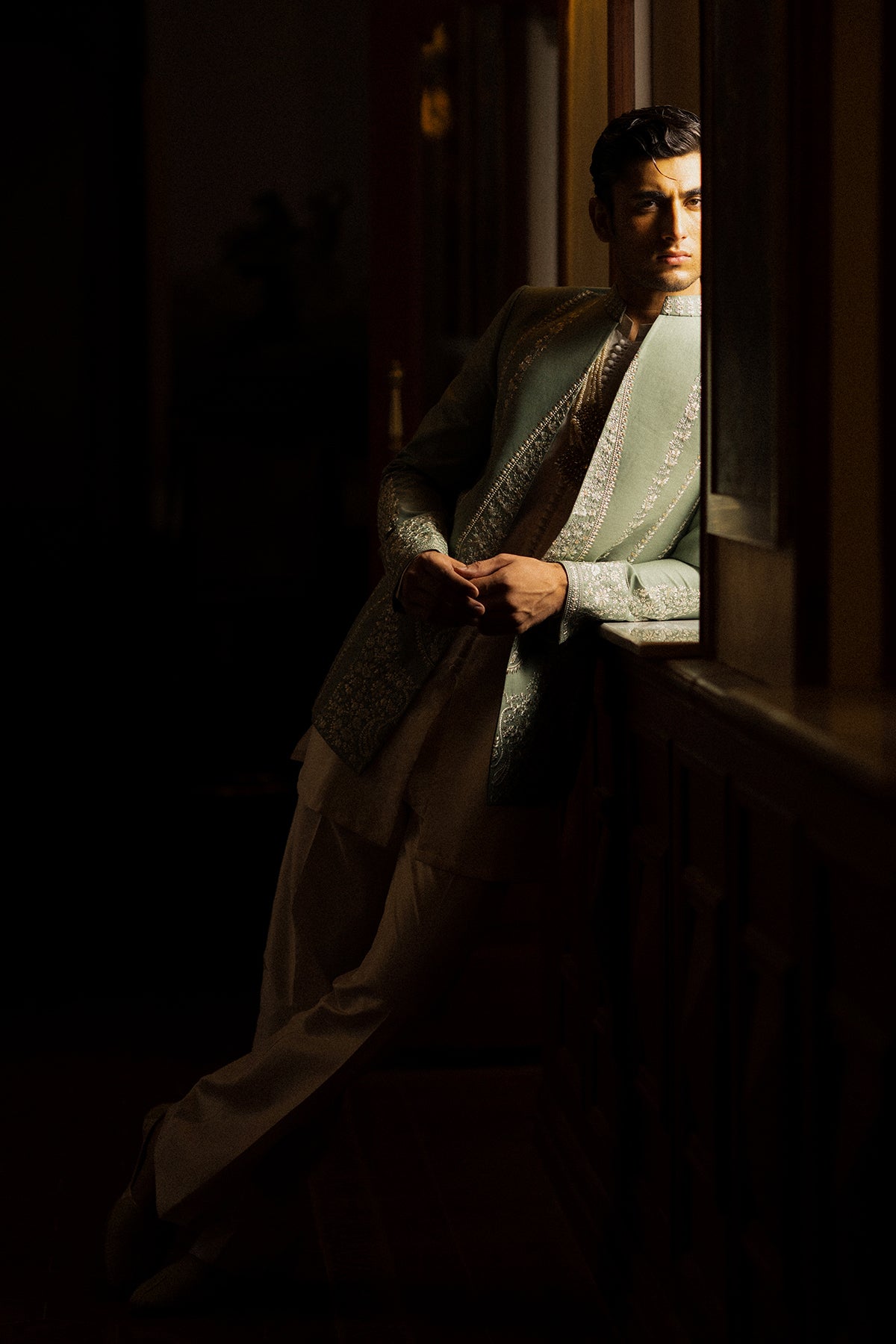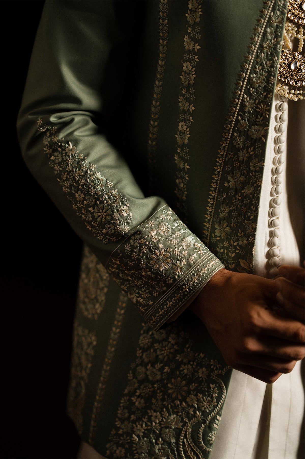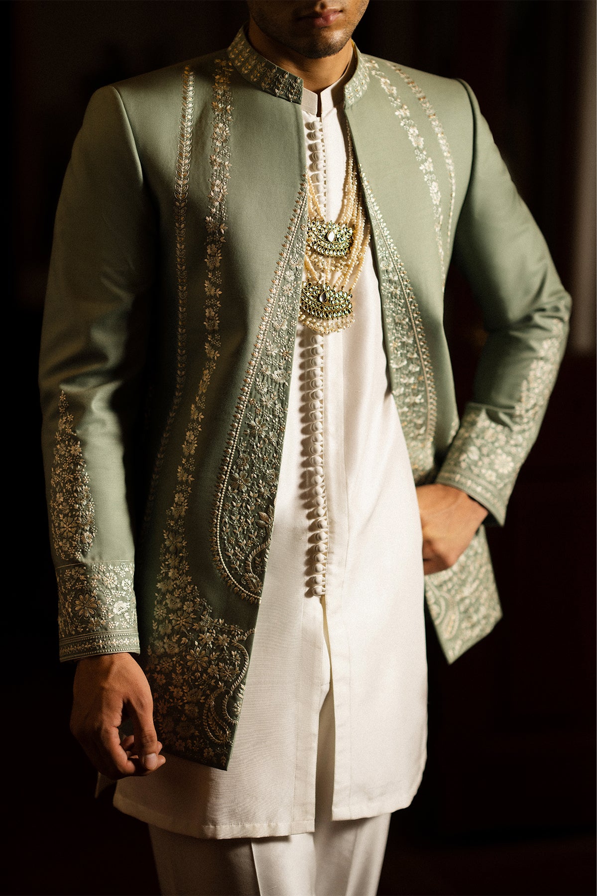 Make a statement this festive season with our turquoise embroidered jacket, featuring a unique pattern and distinctive design that exudes timeless charm. Paired with a raw silk open-style shirt and sleek pants, this ensemble is the perfect blend of sophistication and style — ideal for those who love to stand out effortlessly.