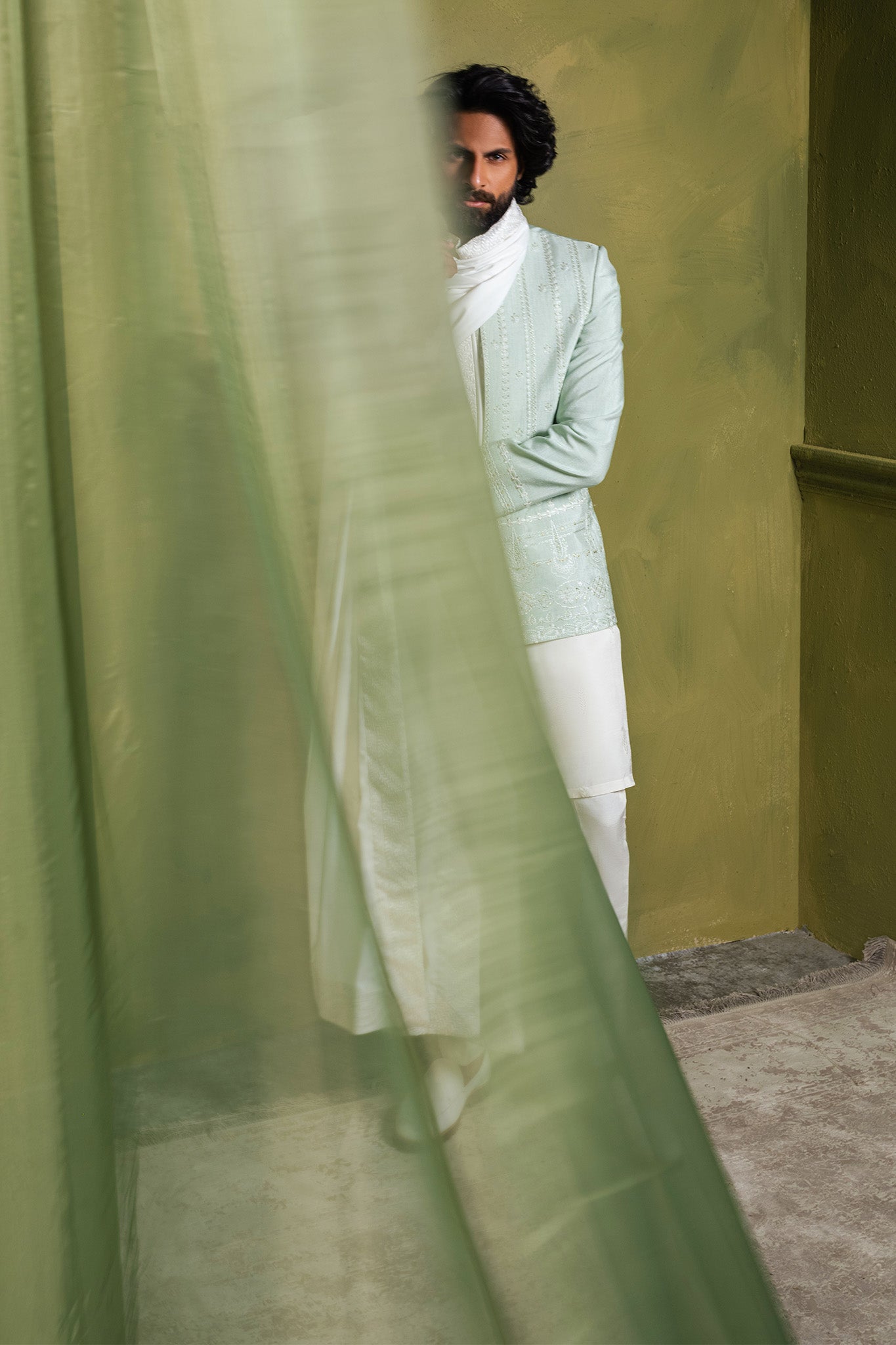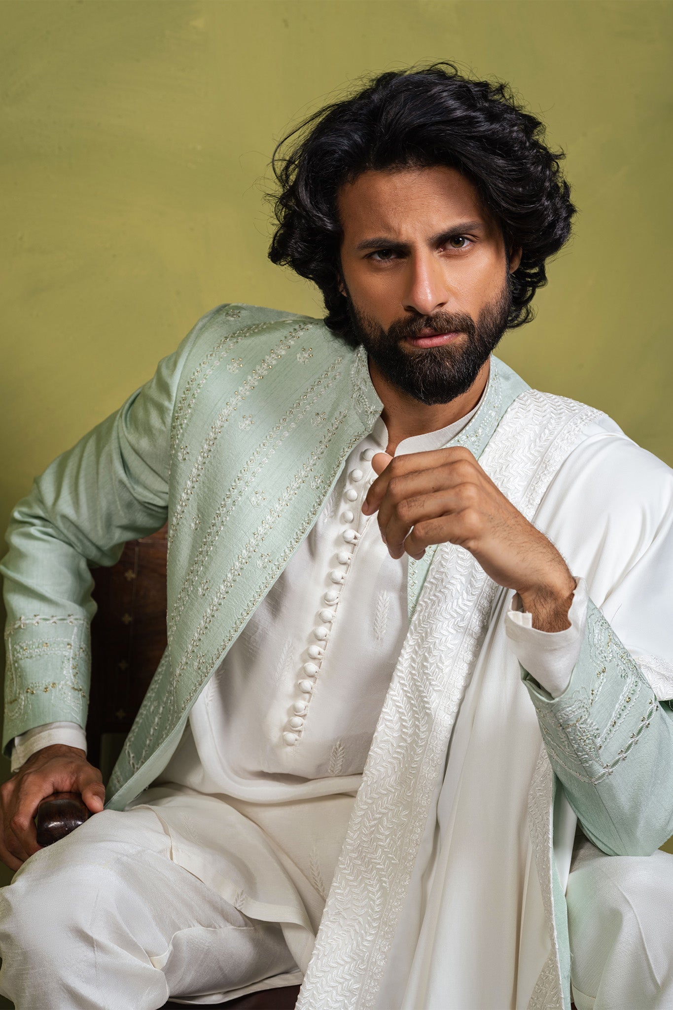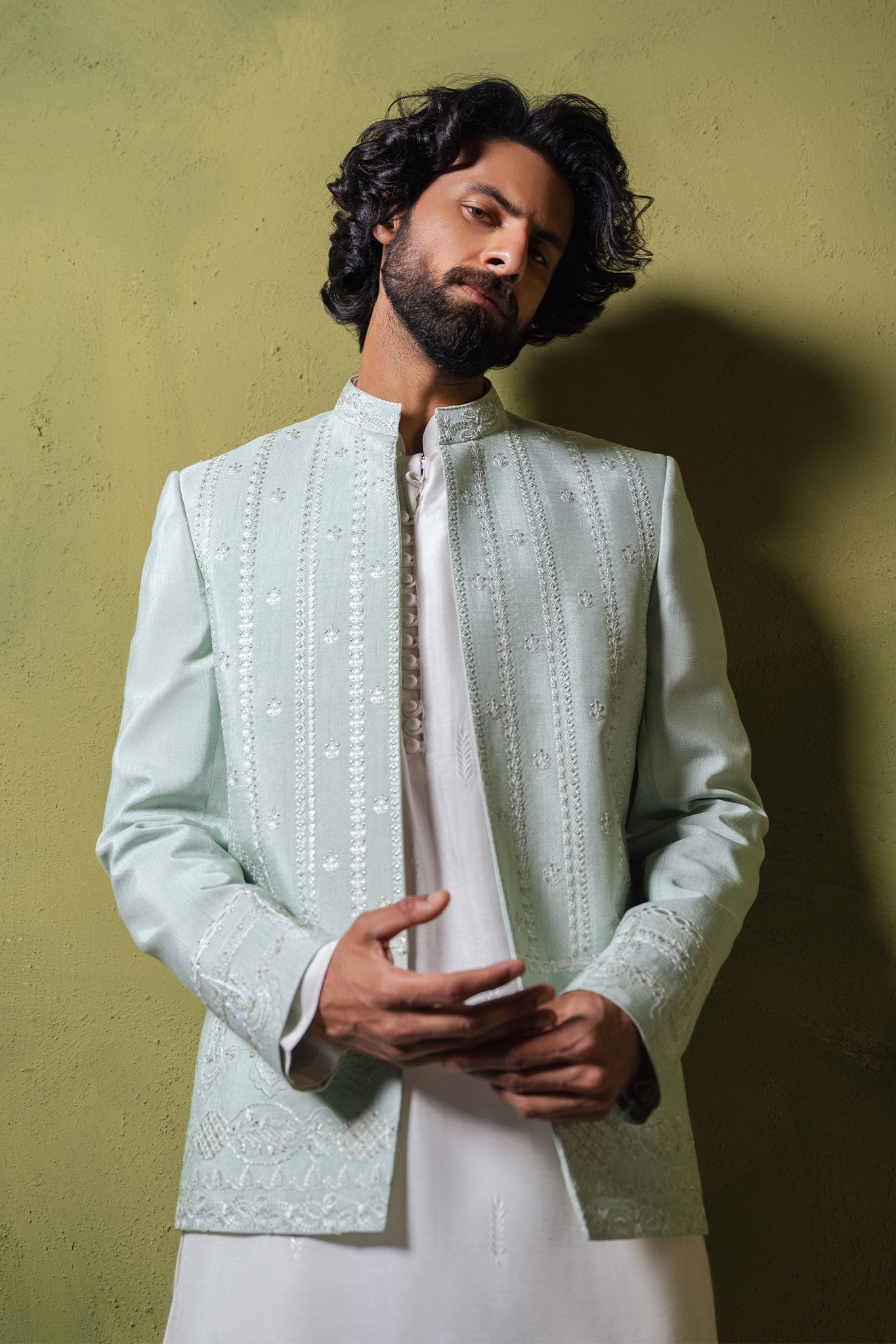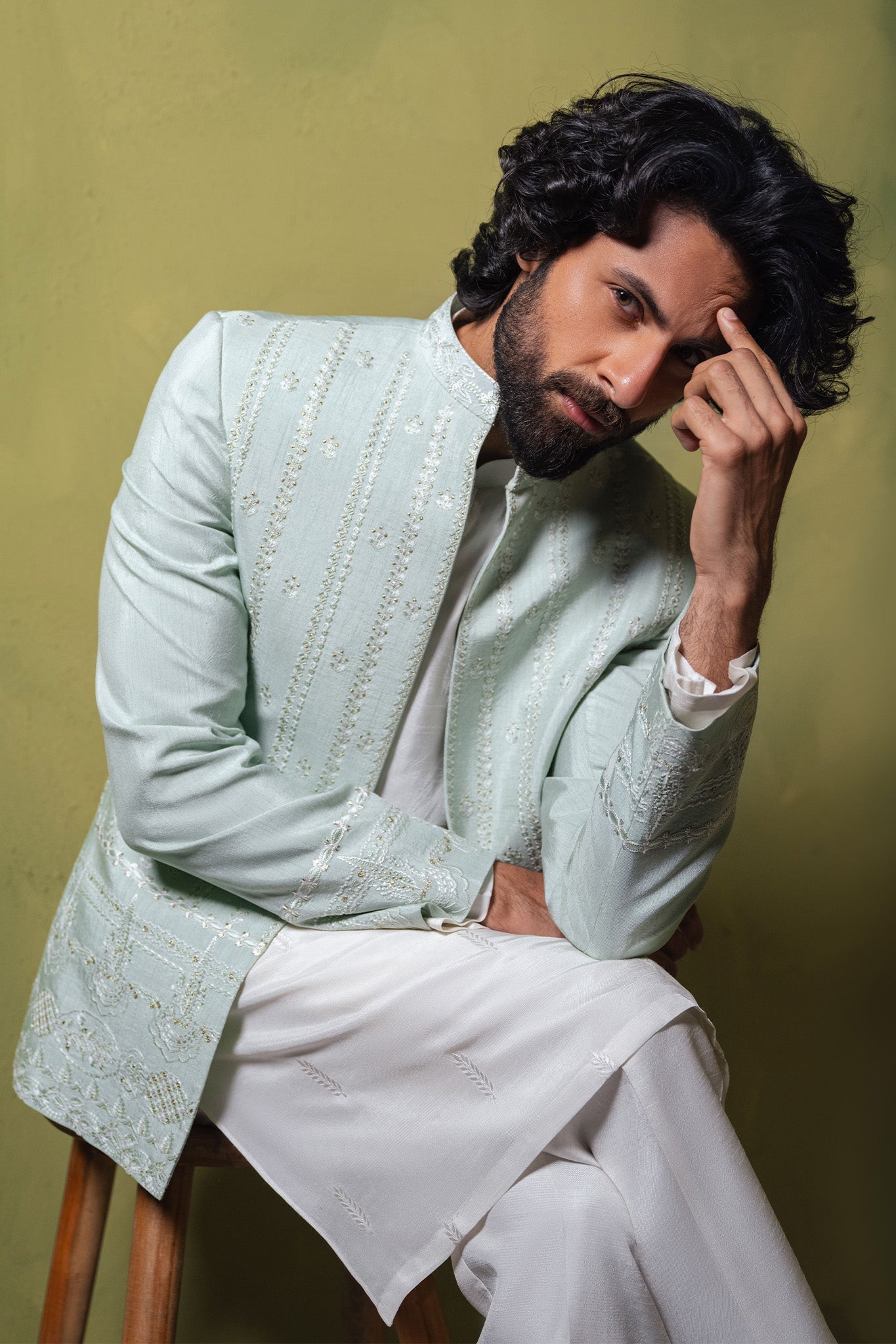 Introducing mint green prince jacket with intricate resham embroidery, paired with a classic embroidered kurta and plain white pants, is pure elegance! It’s the epitome of style and sophistication, perfect for making a statement at any event.