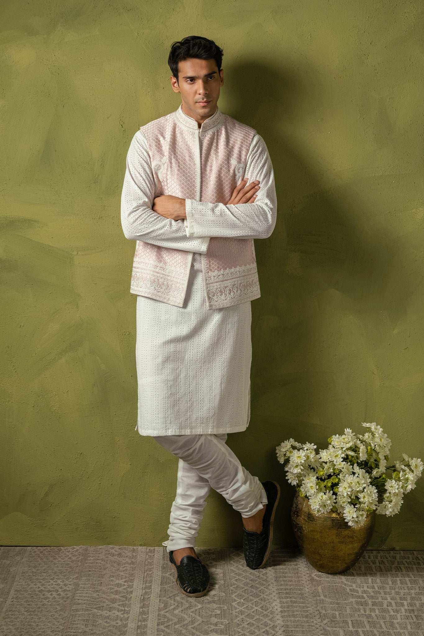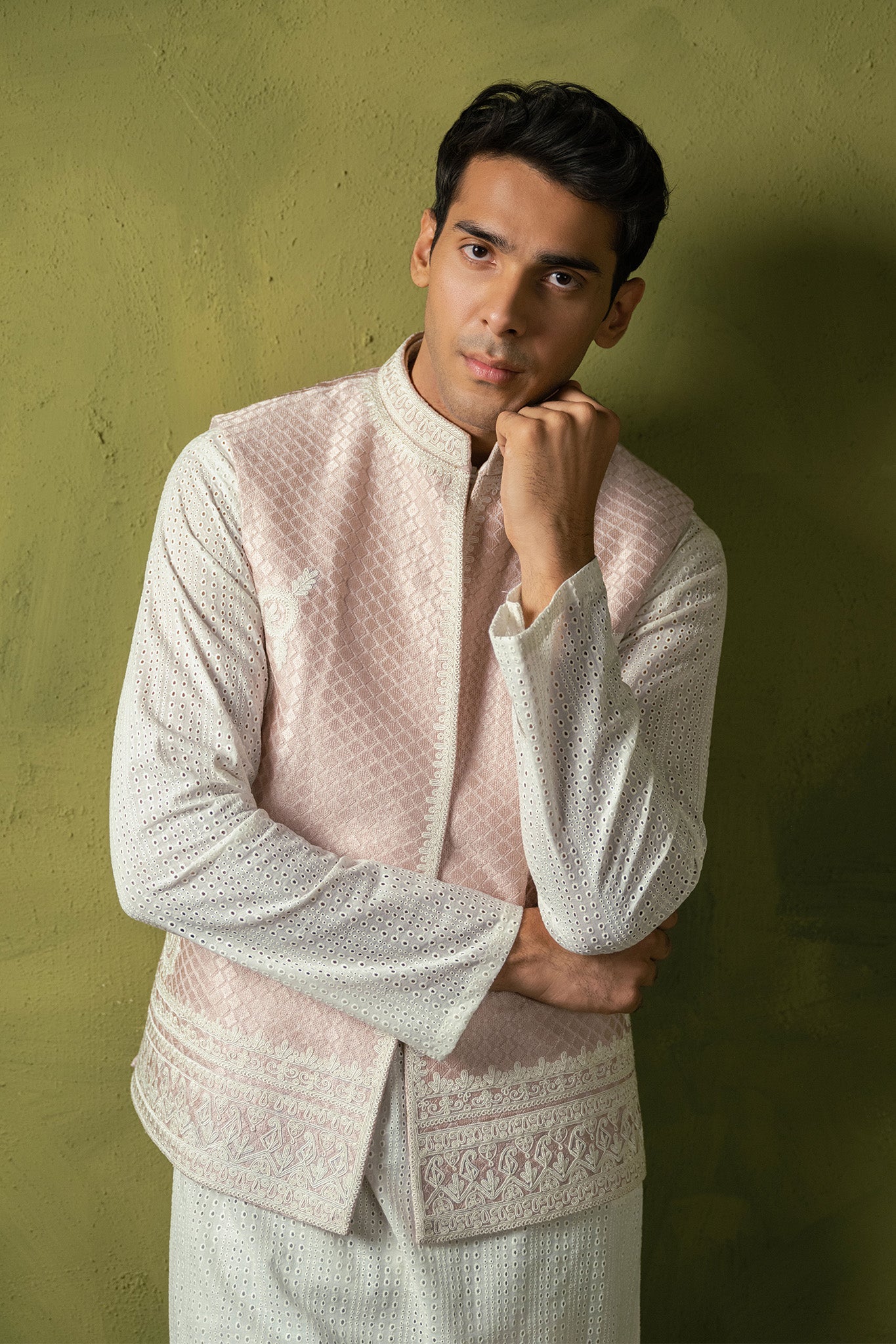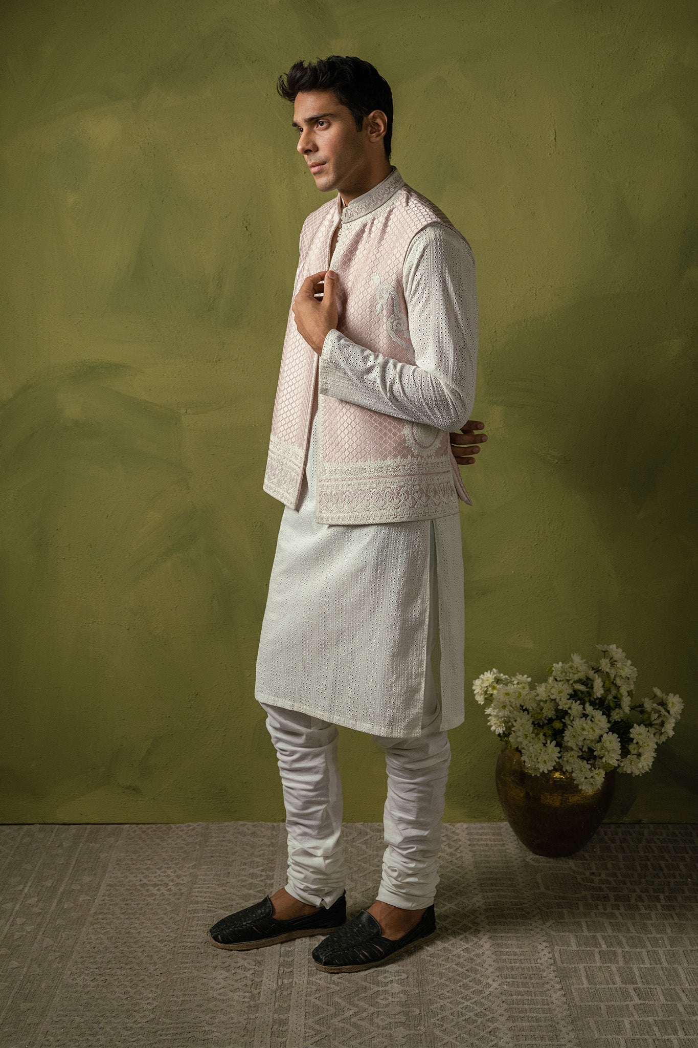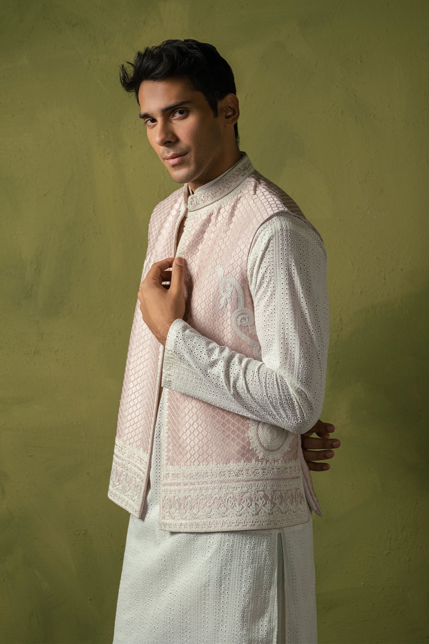 Unveiling this exquisite powder pink waistcoat featuring intricate resham and dori work, perfectly paired with churidar pajama and a chickenkari kurta. A timeless ensemble that combines tradition with elegance. Ideal for making a sophisticated statement.