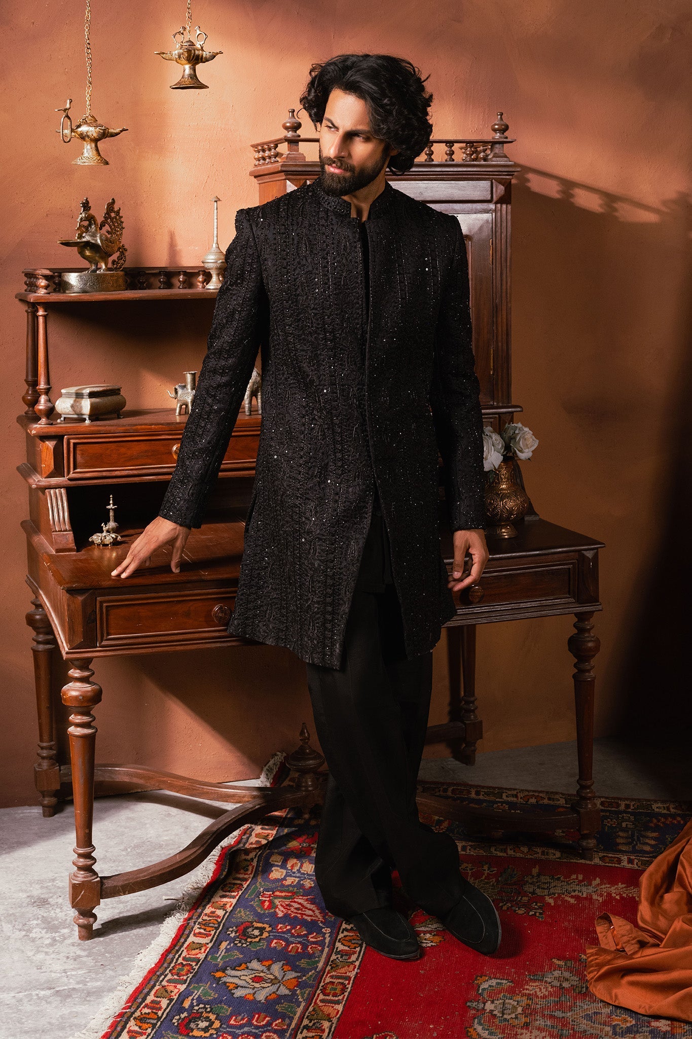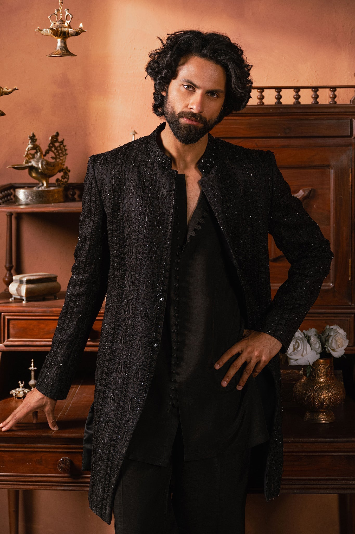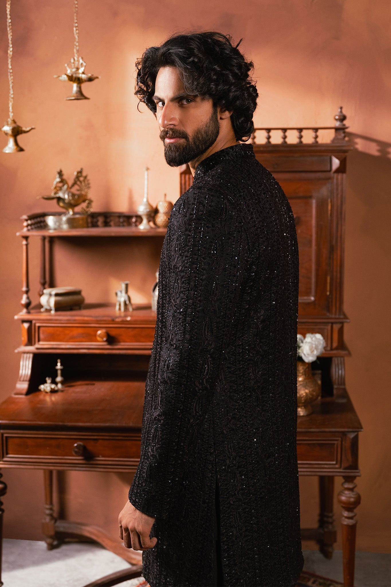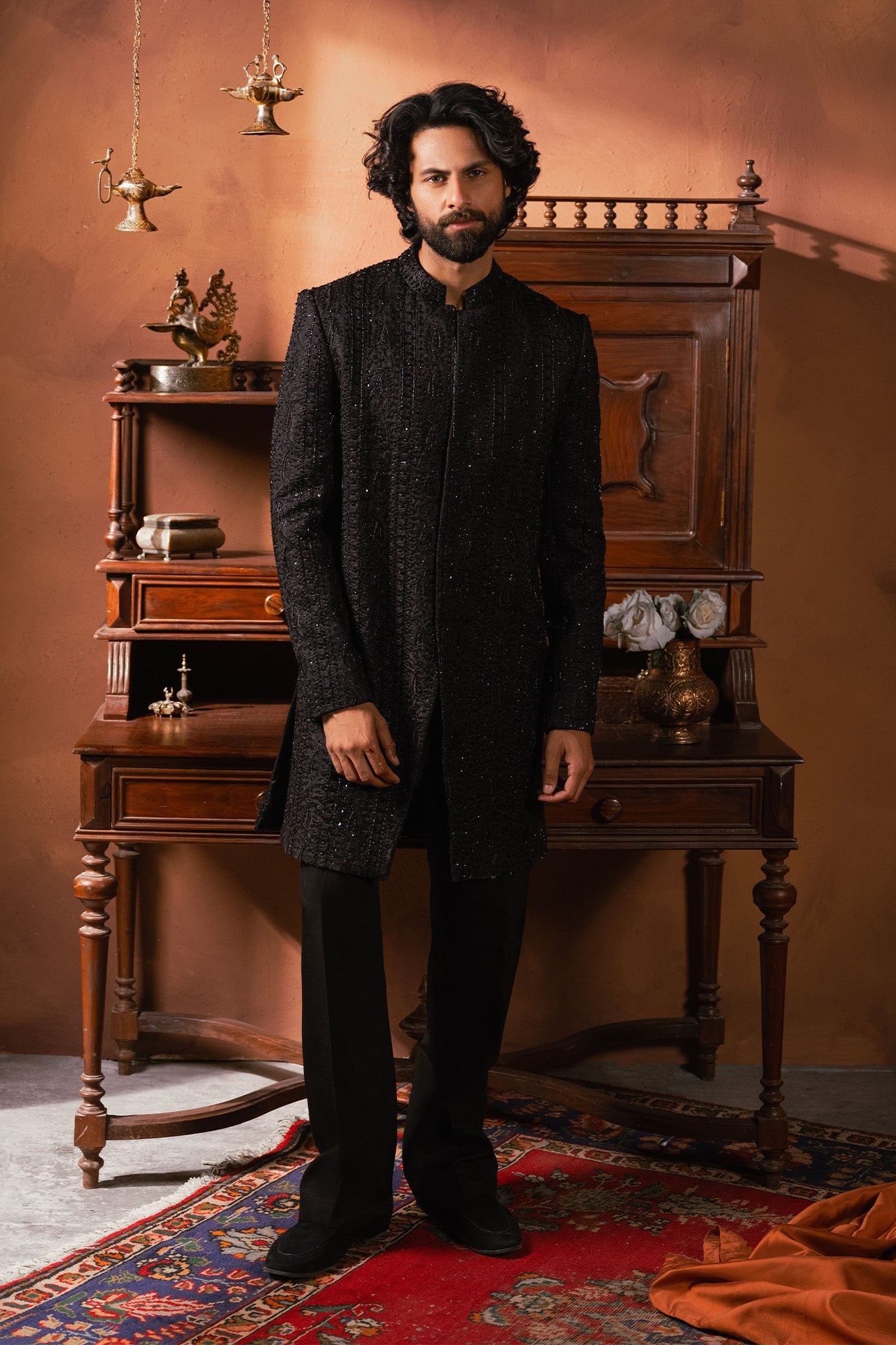 Introducing black sherwani with all-over self-on-self handwork paired with black pants is a stunning combination of traditional craftsmanship and modern style. The intricate handwork adds a touch of elegance and sophistication to the outfit.
