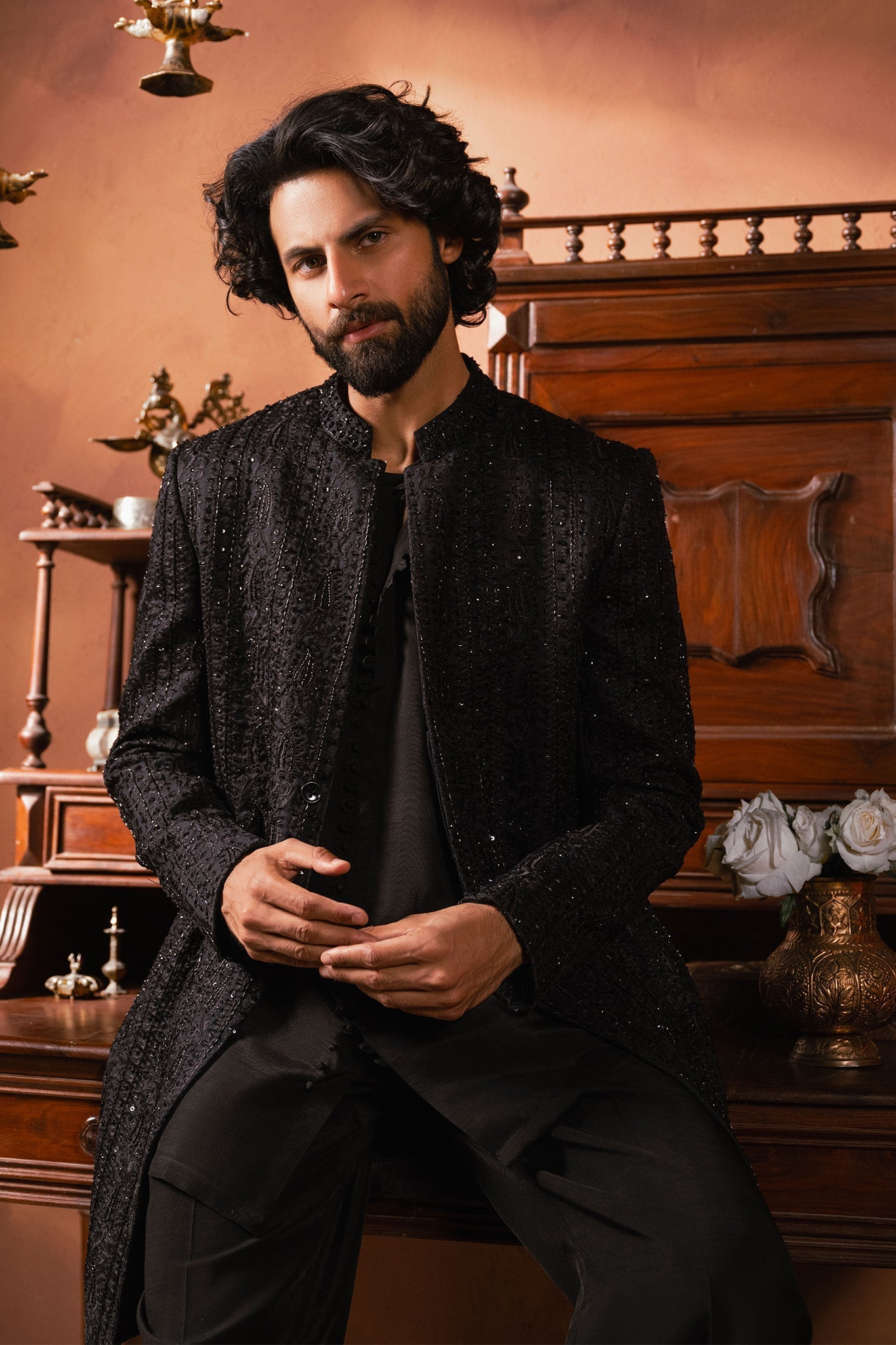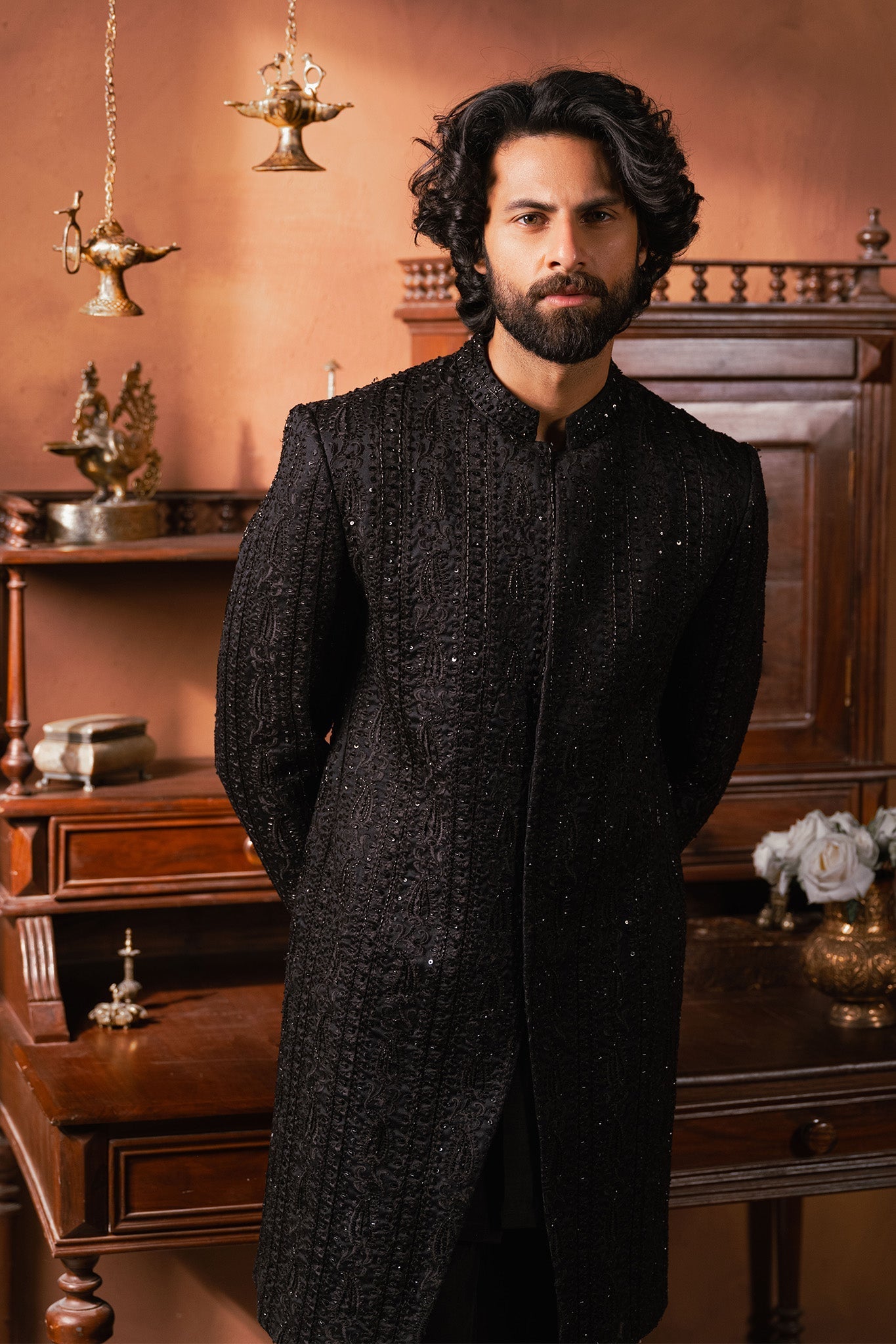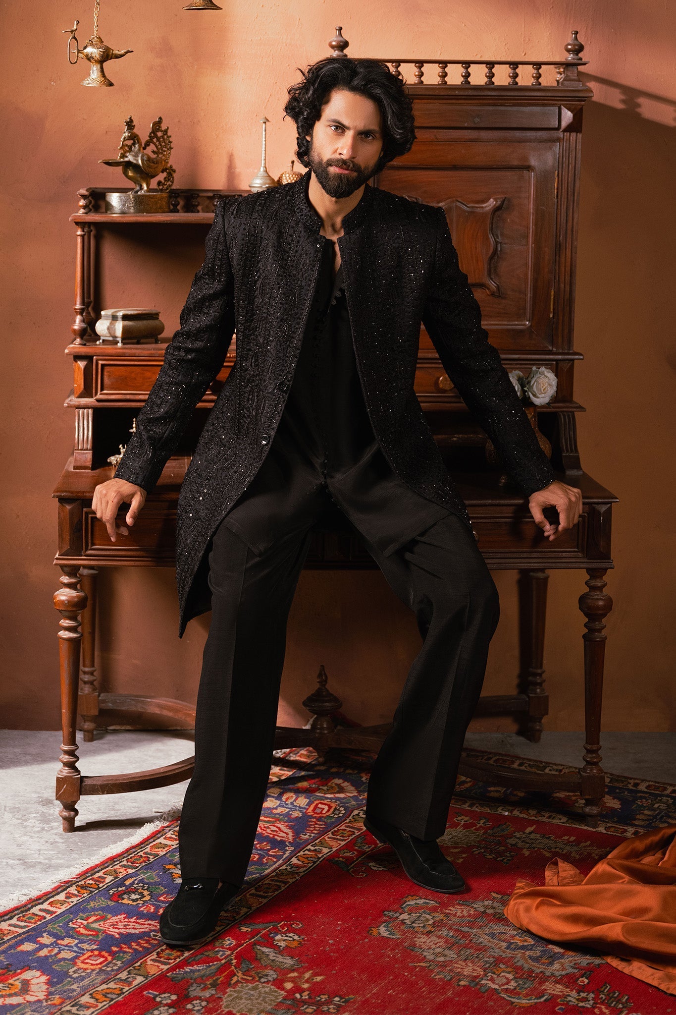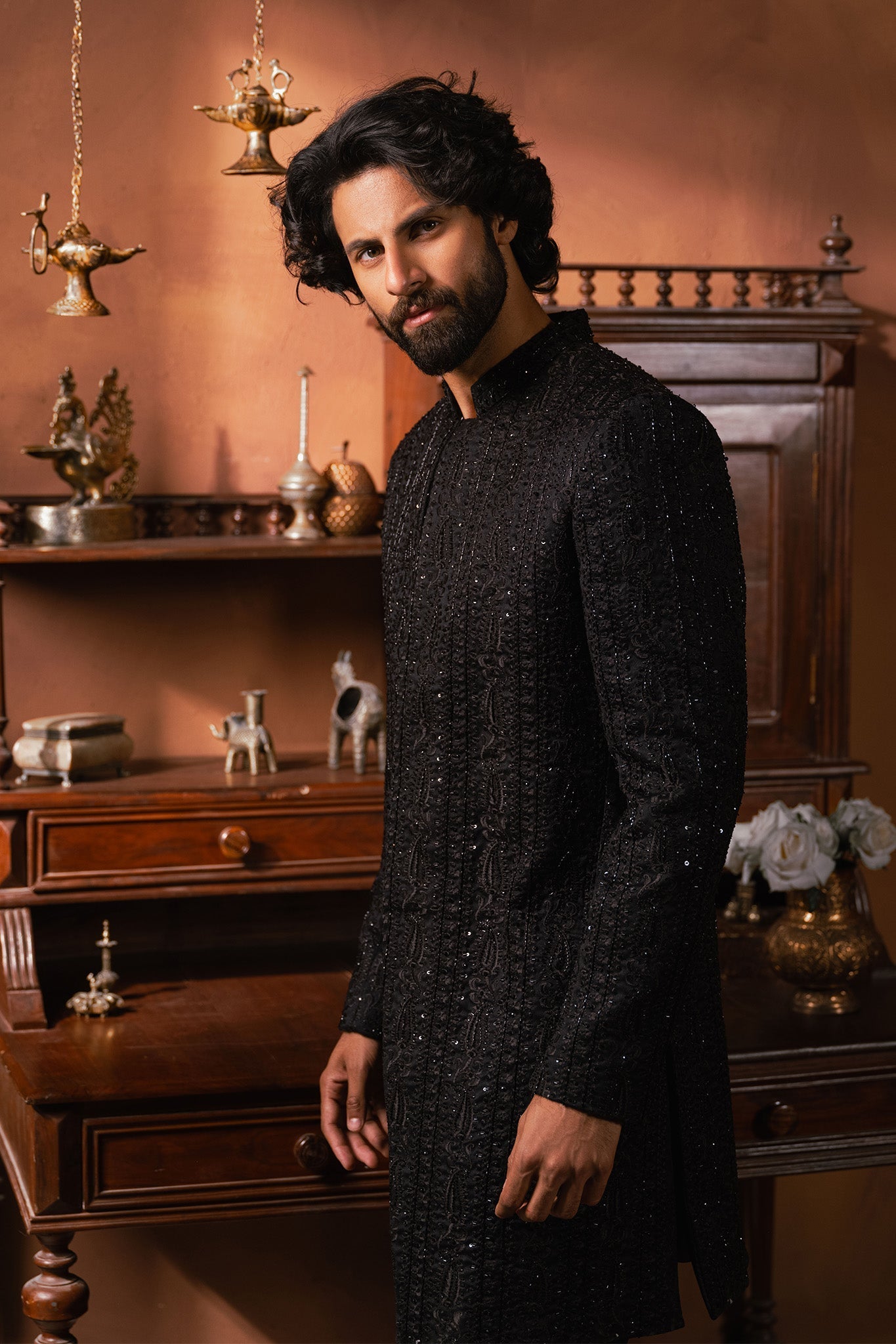 Introducing black sherwani with all-over self-on-self handwork paired with black pants is a stunning combination of traditional craftsmanship and modern style. The intricate handwork adds a touch of elegance and sophistication to the outfit.