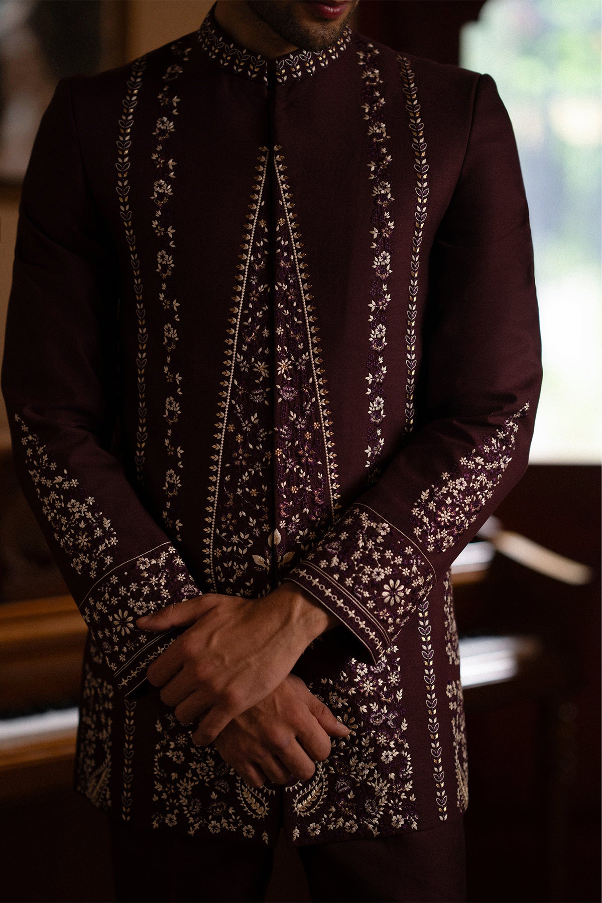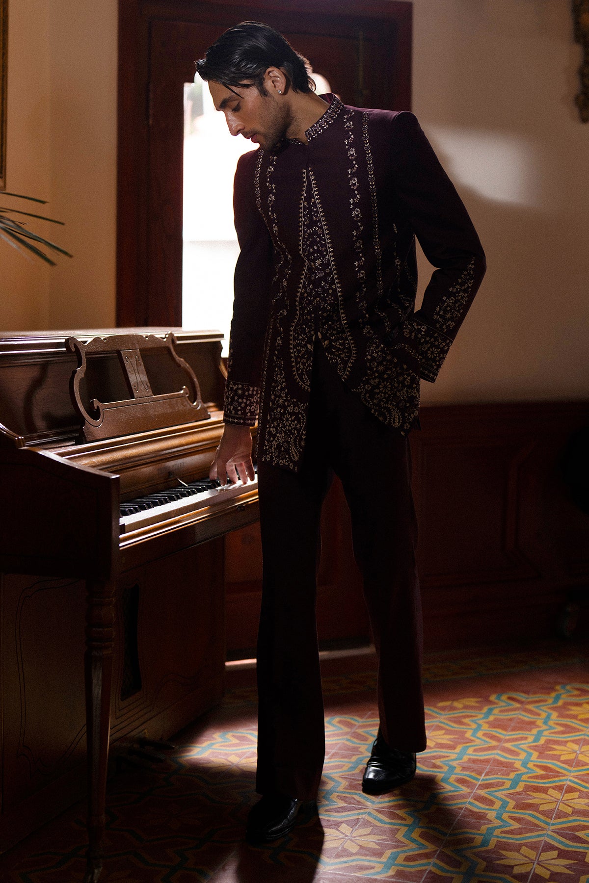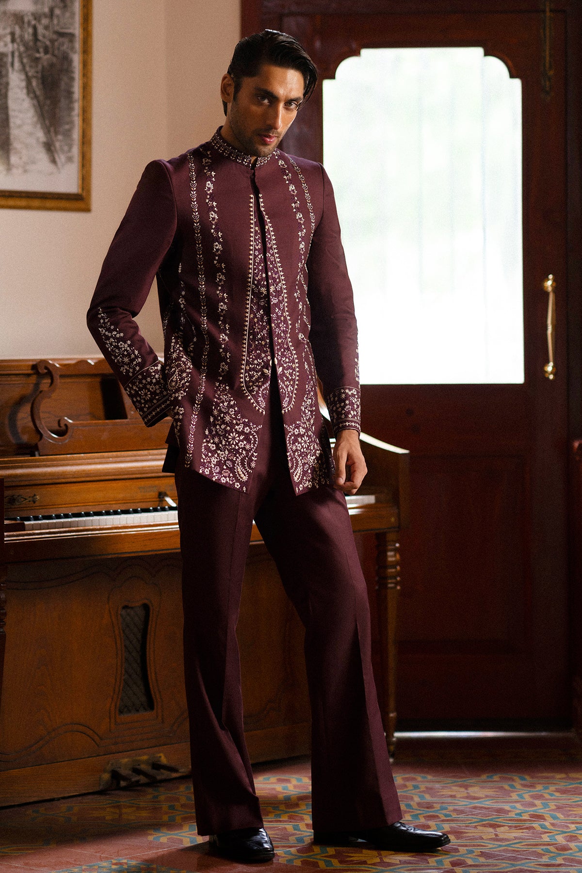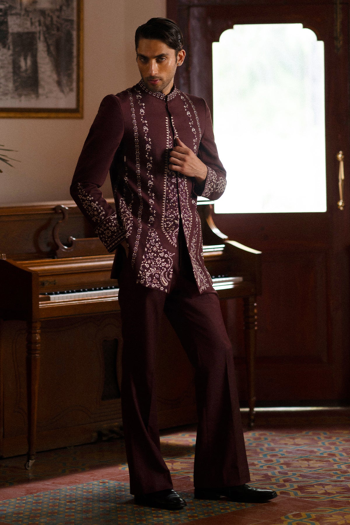 Elevate your festive look with our burgundy embroidered jacket, featuring a unique design and elegant detailing. Paired with chic bootcut pants, this outfit is the perfect blend of style and sophistication.