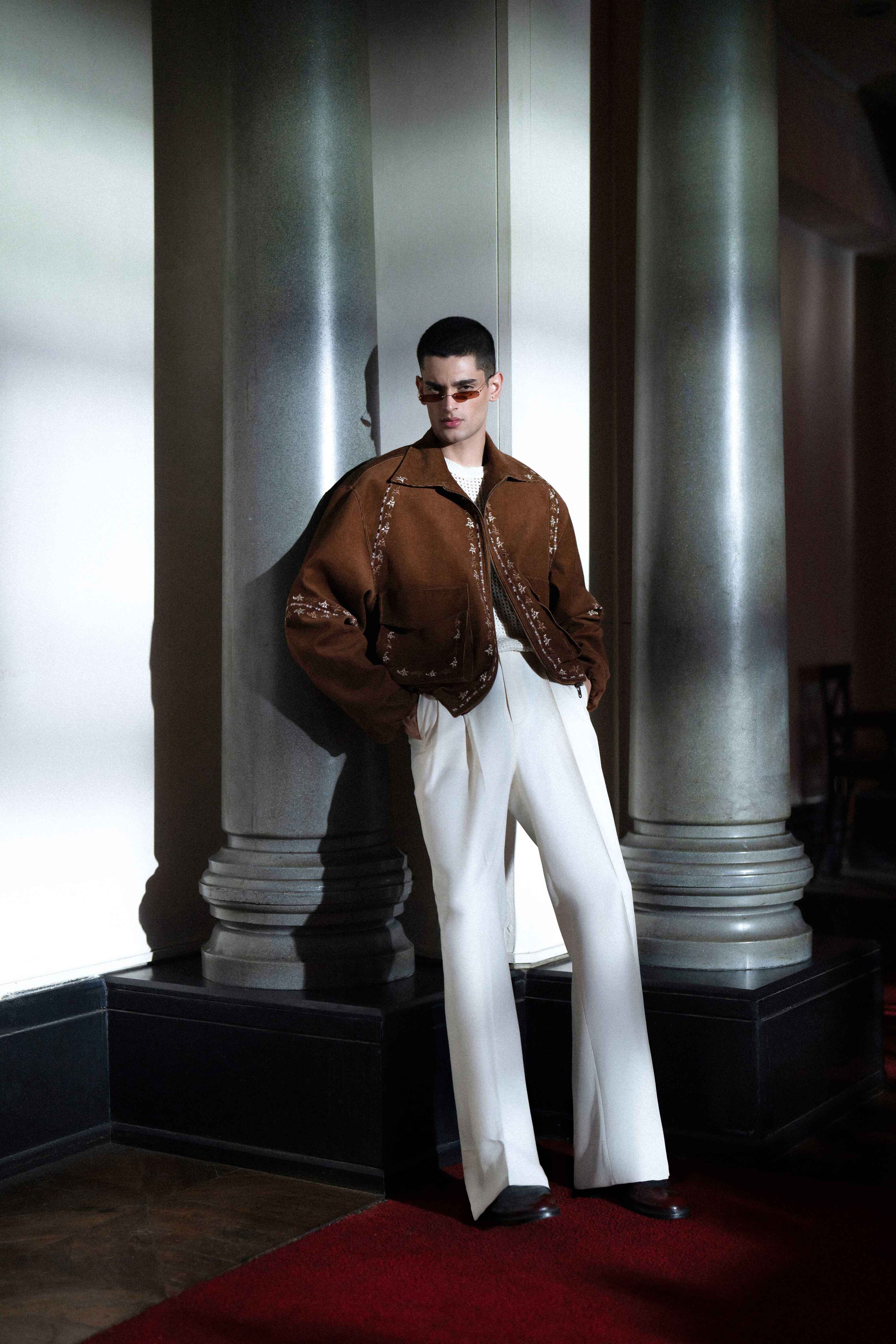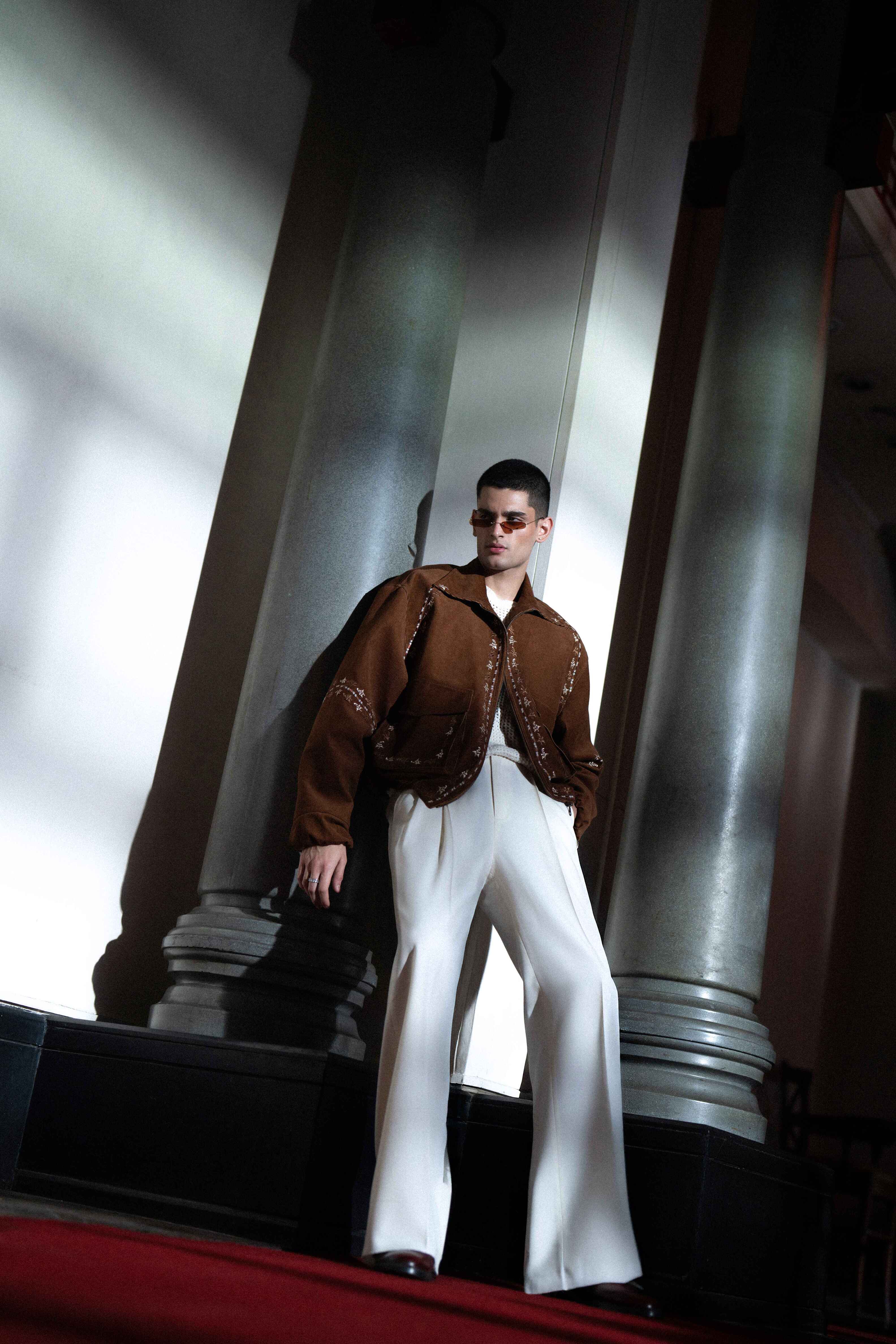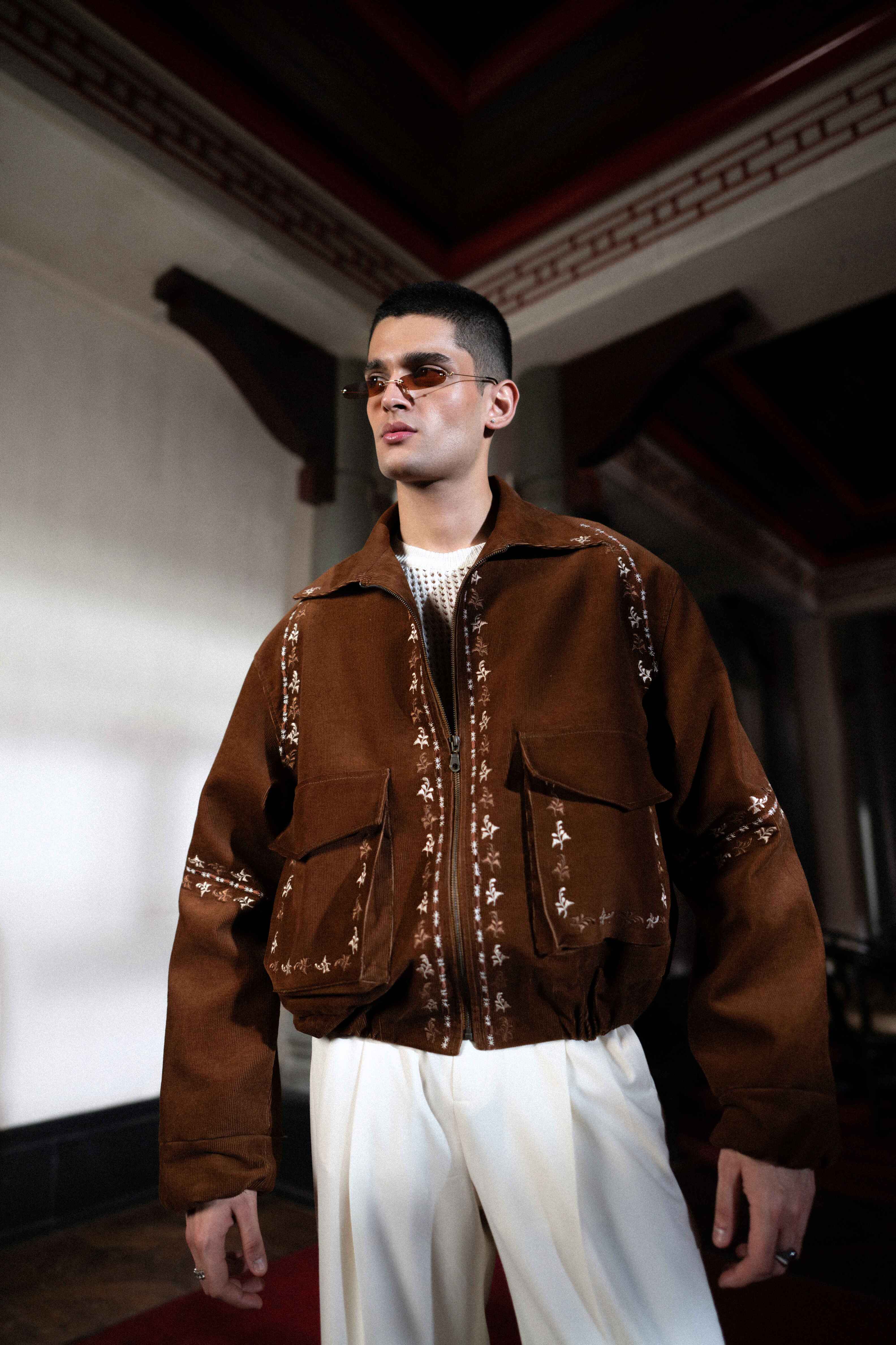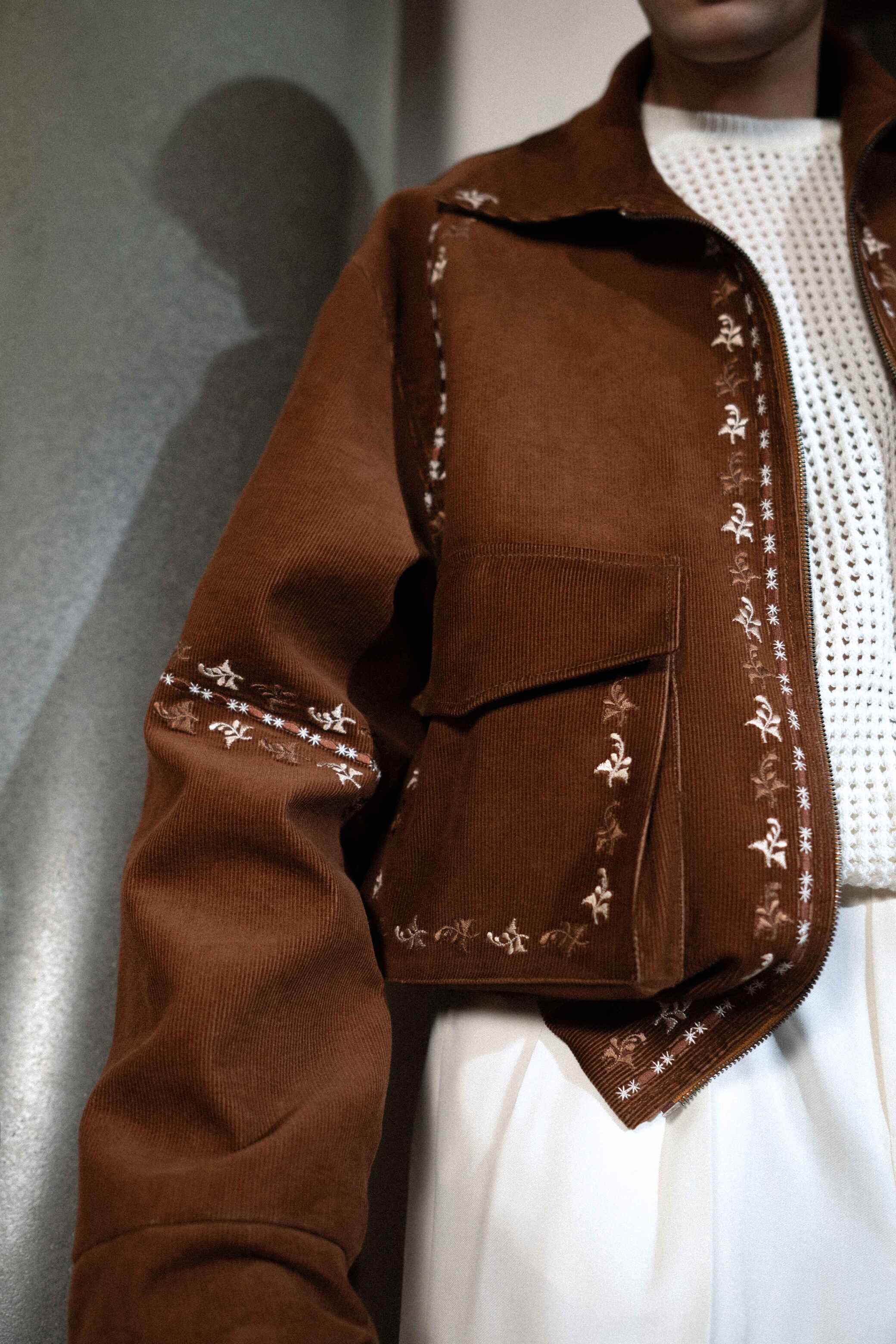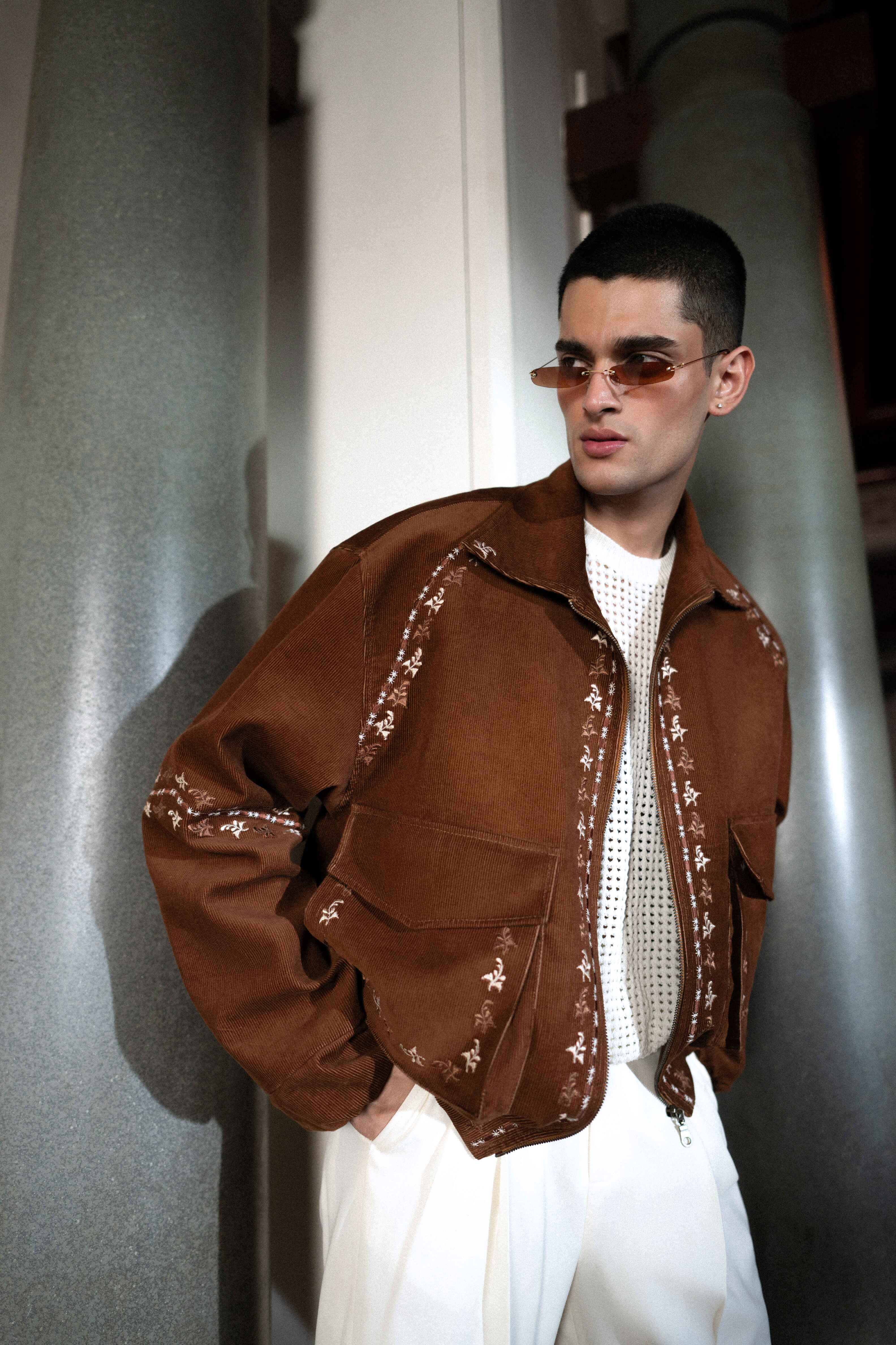 A luxurious take on the classic bomber silhouette. This jacket is crafted from rich, tactile chocolate brown corduroy, providing a plush and substantial feel. It features intricate tonal thread that traces the zipper line, collar, and shoulders in a delicate floral or vine pattern. The cropped, voluminous fit is enhanced by large flap pockets, creating a bold shape. Paired effortlessly with crisp white wide-leg trousers, this piece is the ideal blend of rugged charm and high-end detail.