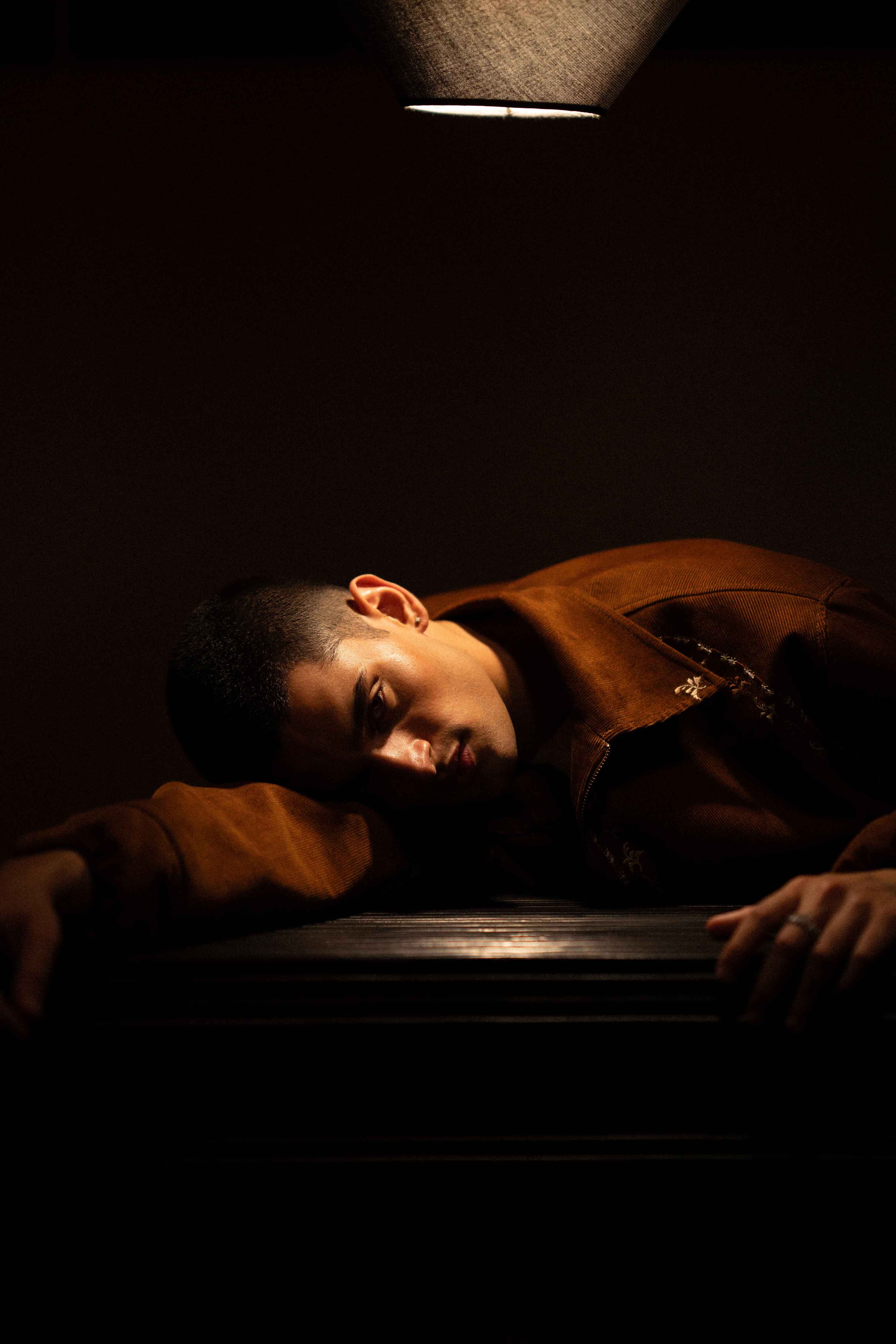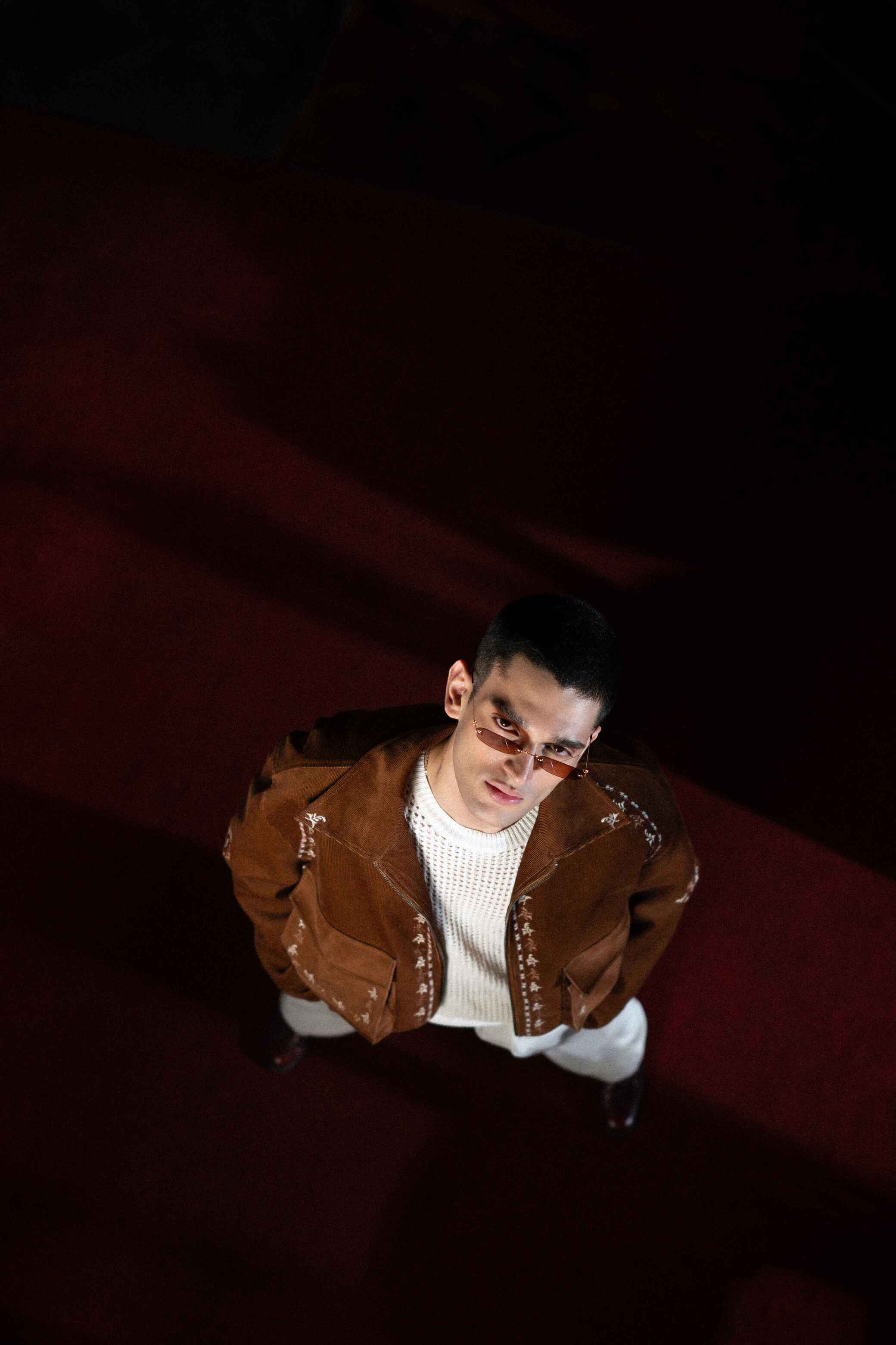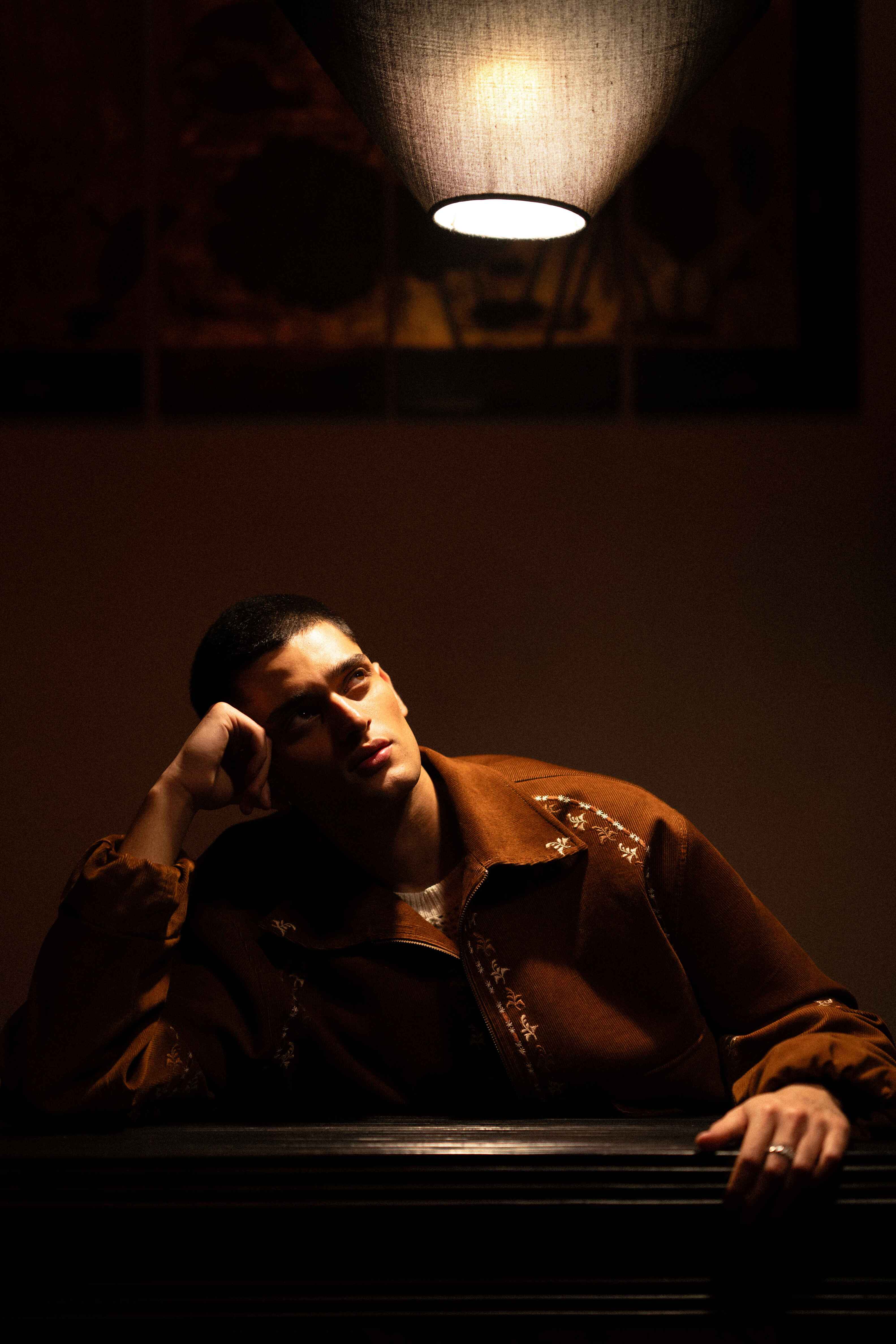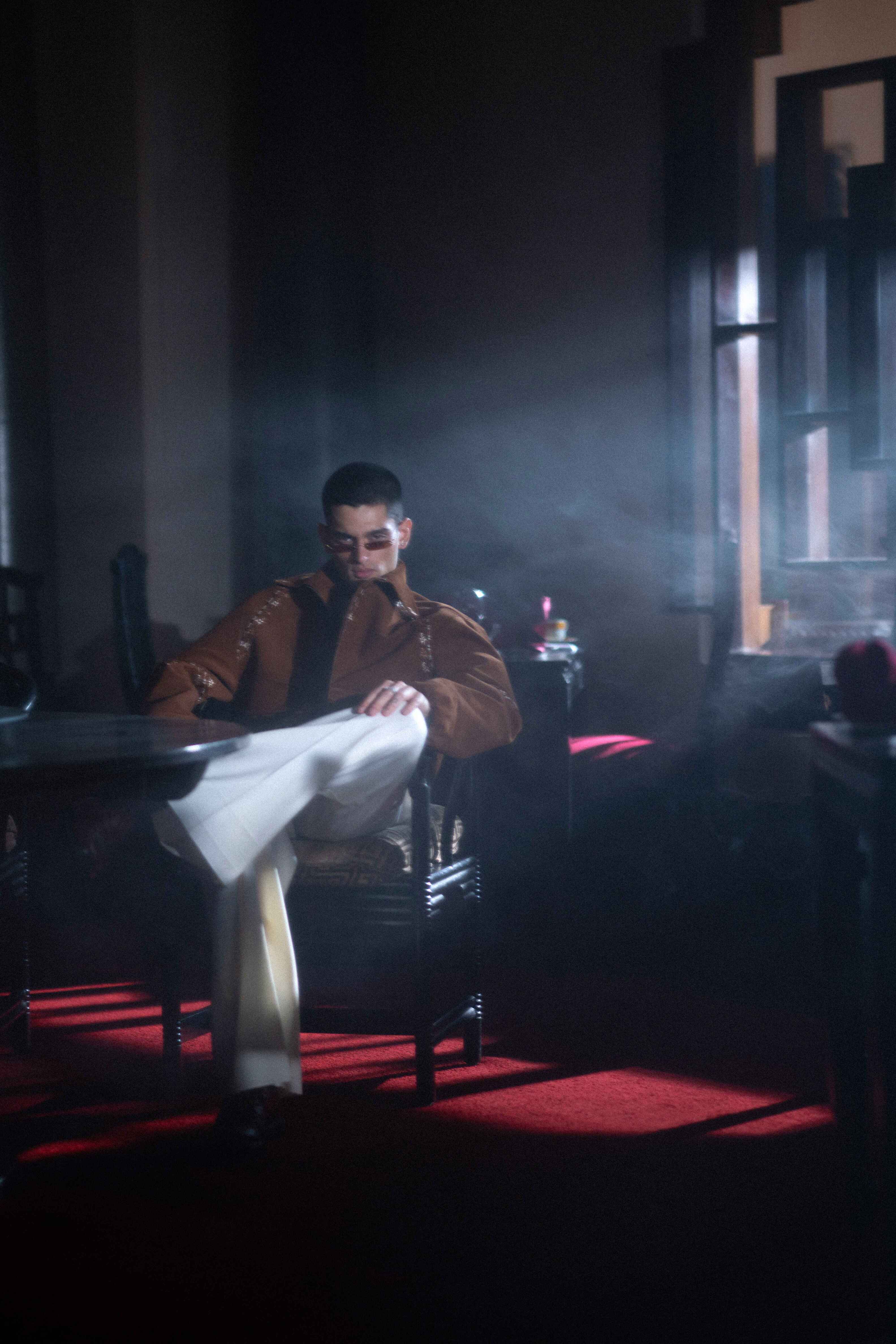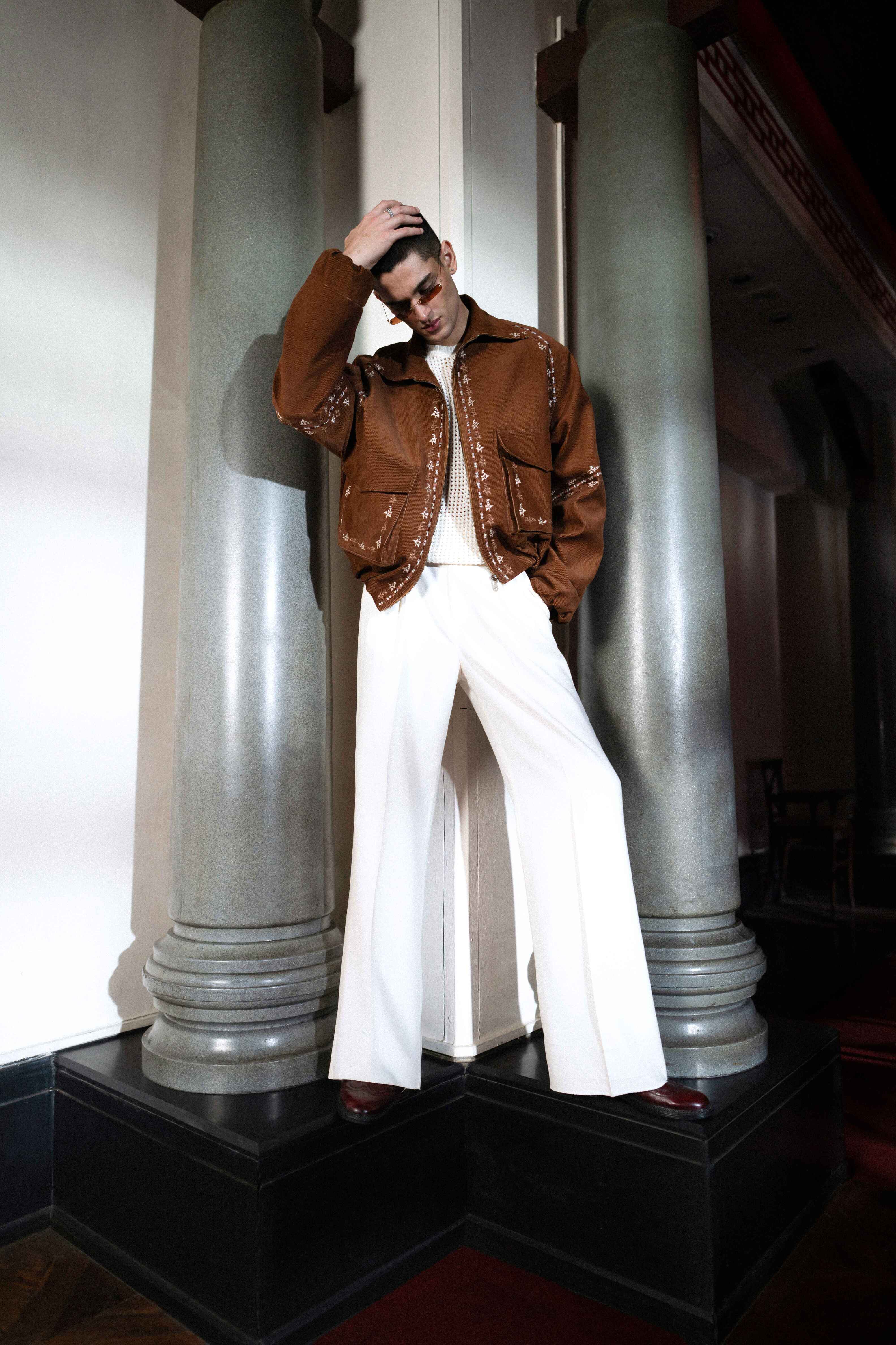 A luxurious take on the classic bomber silhouette. This jacket is crafted from rich, tactile chocolate brown corduroy, providing a plush and substantial feel. It features intricate tonal thread that traces the zipper line, collar, and shoulders in a delicate floral or vine pattern. The cropped, voluminous fit is enhanced by large flap pockets, creating a bold shape. Paired effortlessly with crisp white wide-leg trousers, this piece is the ideal blend of rugged charm and high-end detail.