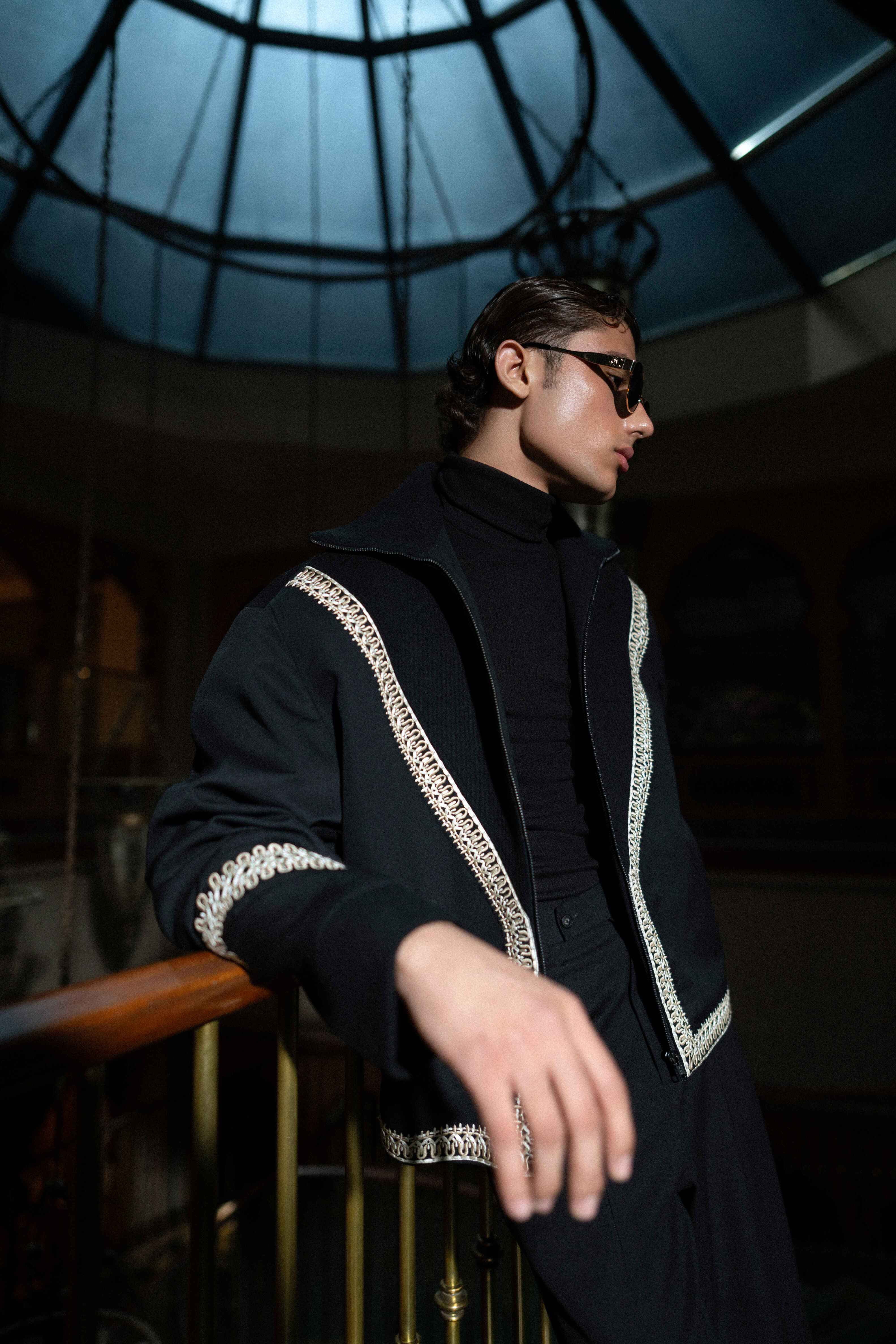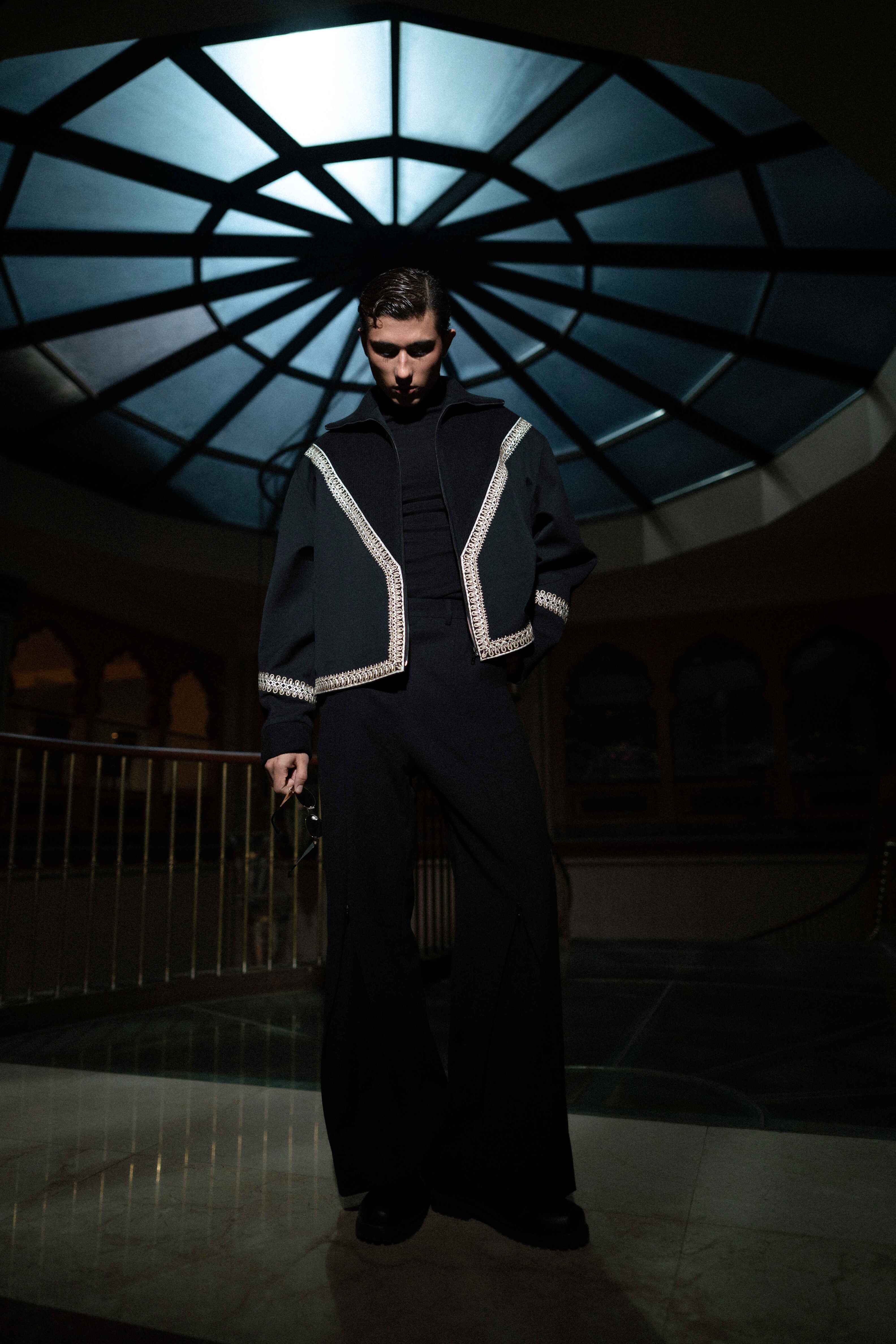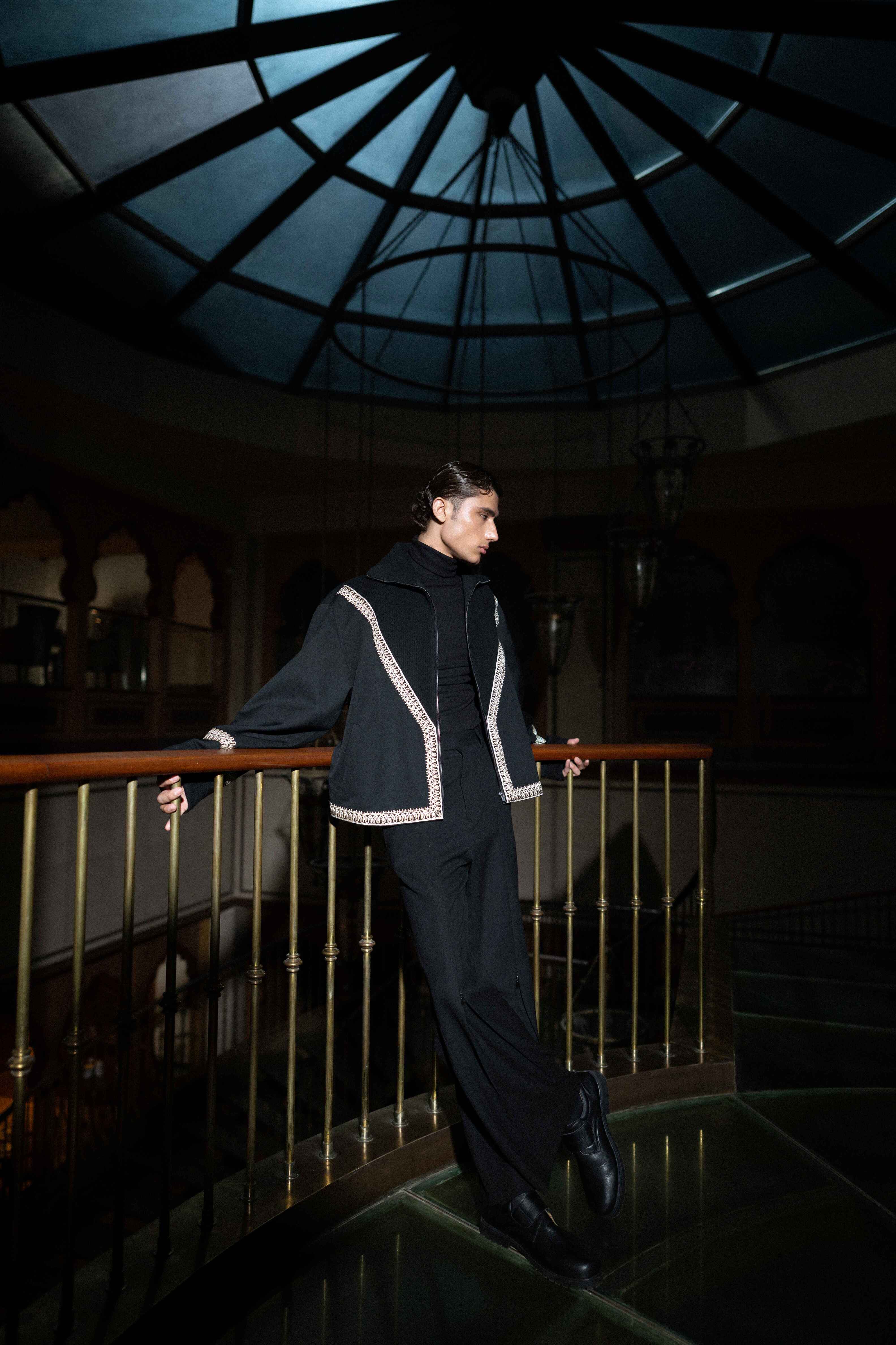 A striking black-on-black look designed for dramatic impact. The jacket is a structured, cropped silhouette that hits at the waist, emphasizing the figure. It features an eye-catching, angular trim of tonal bead or thread embellishment tracing the lapel, cuffs, and hem. This bold detailing adds texture and dimension without sacrificing sophistication. Paired with high-waisted wide-leg trousers, the ensemble creates an elongated, powerful line, perfect for elevated evening events and artistic dressing.