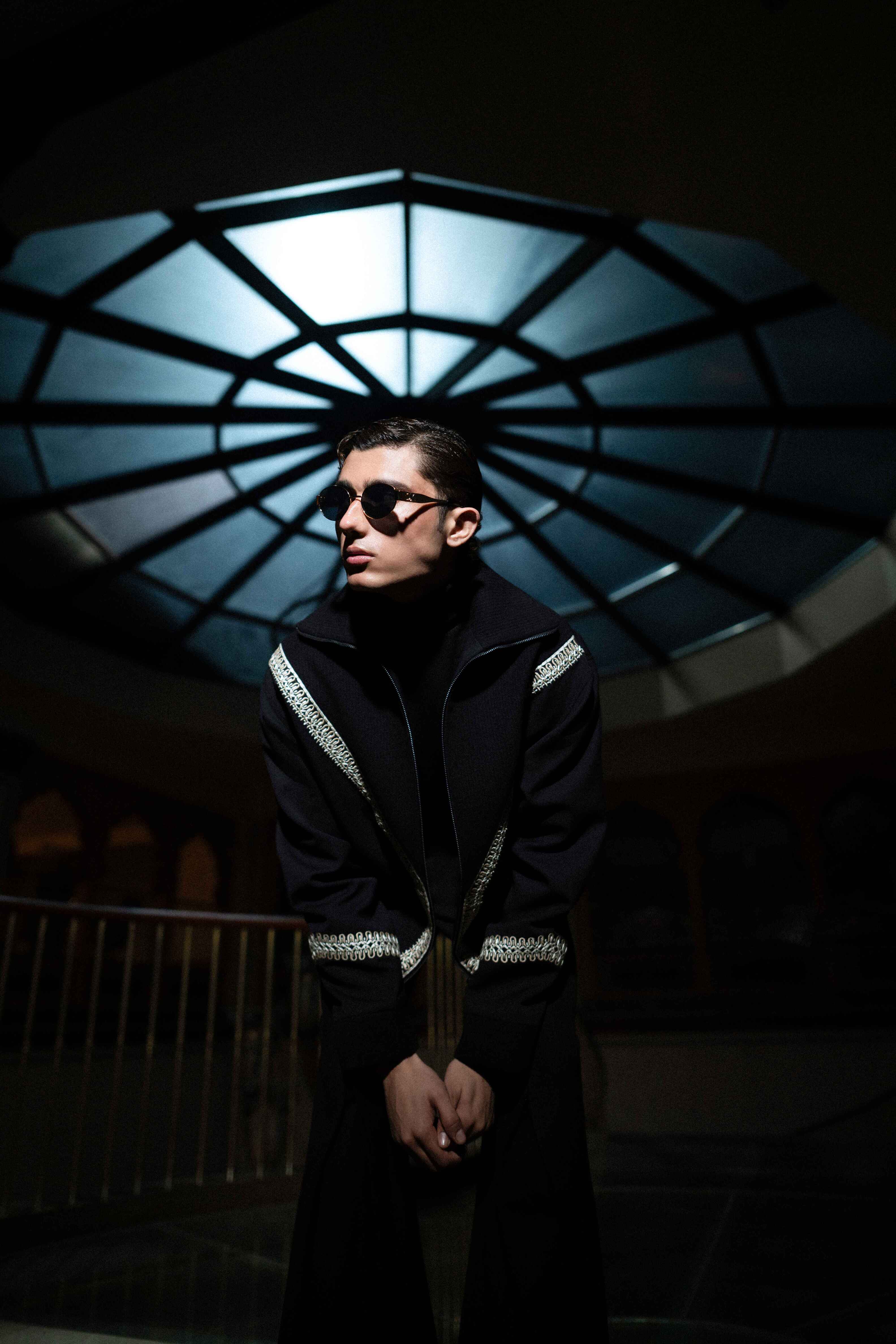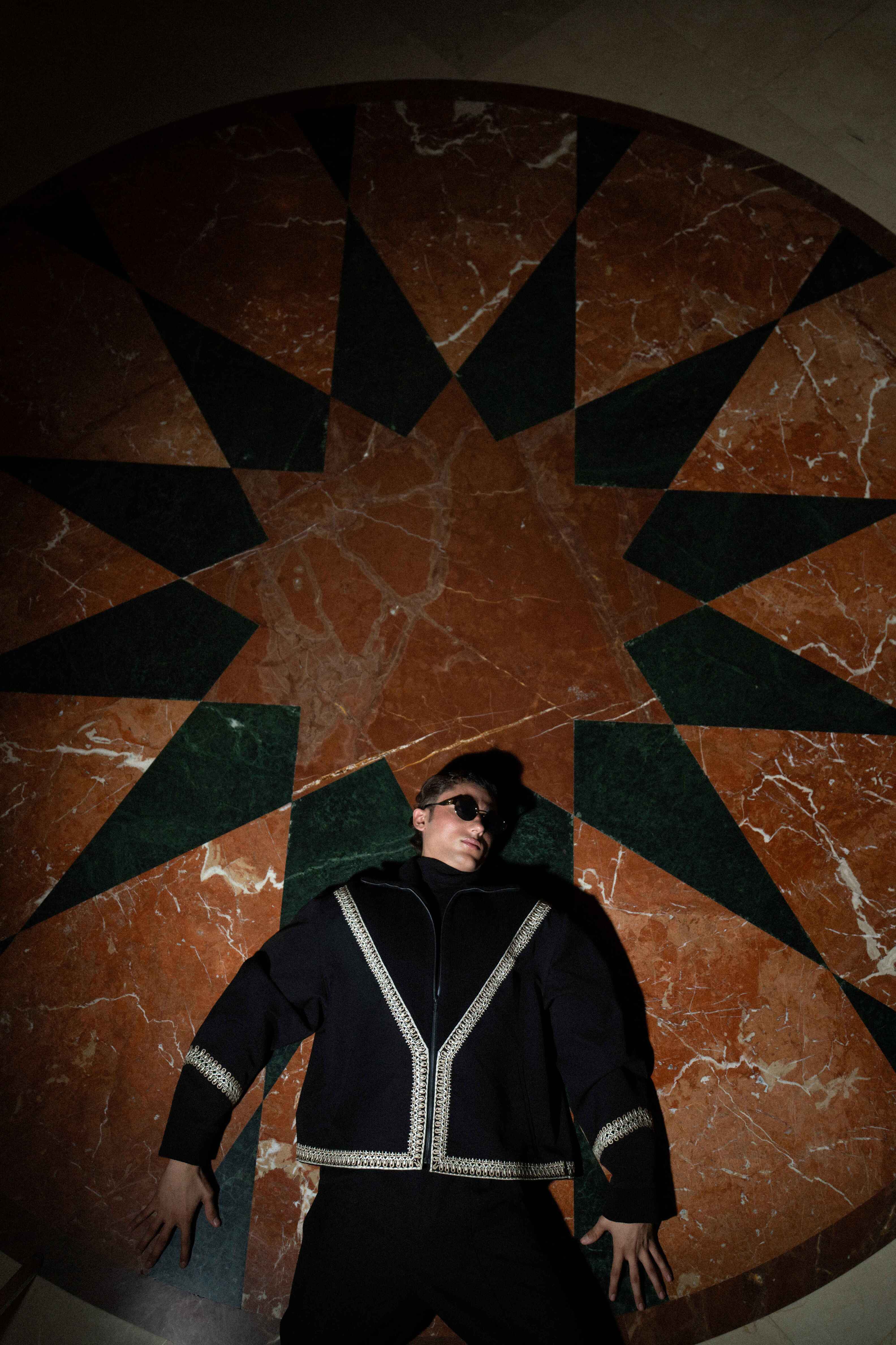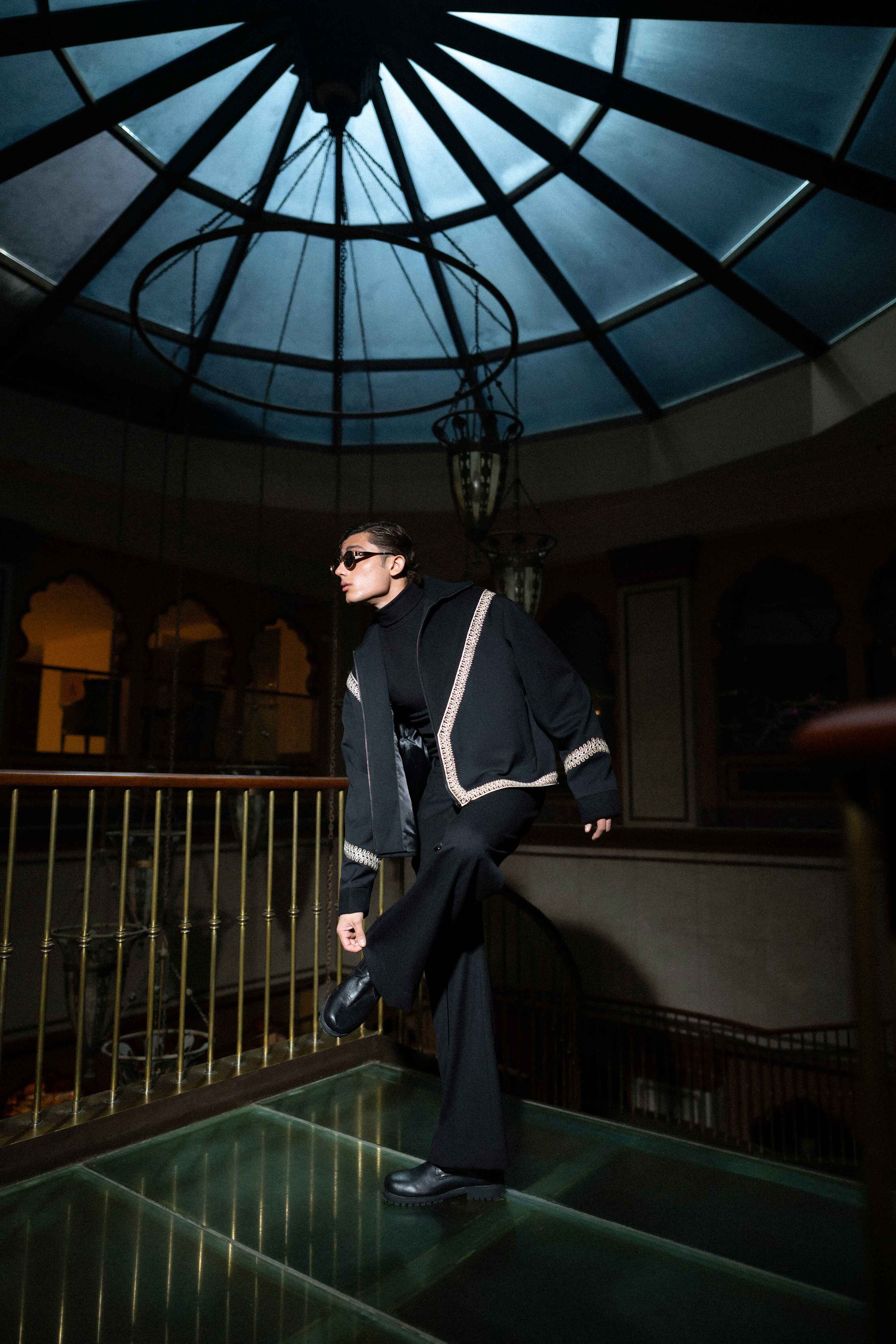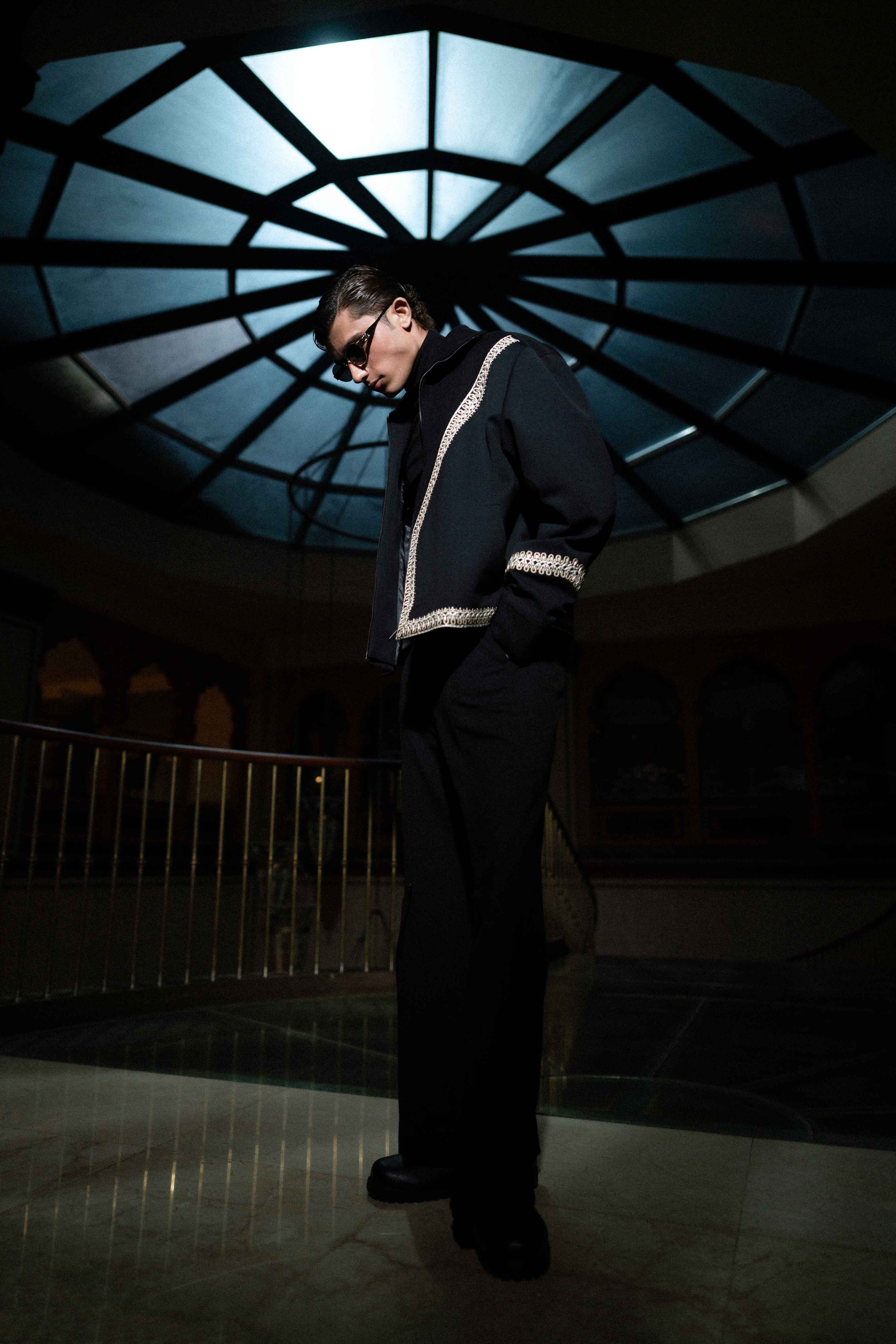 A striking black-on-black look designed for dramatic impact. The jacket is a structured, cropped silhouette that hits at the waist, emphasizing the figure. It features an eye-catching, angular trim of tonal bead or thread embellishment tracing the lapel, cuffs, and hem. This bold detailing adds texture and dimension without sacrificing sophistication. Paired with high-waisted wide-leg trousers, the ensemble creates an elongated, powerful line, perfect for elevated evening events and artistic dressing.