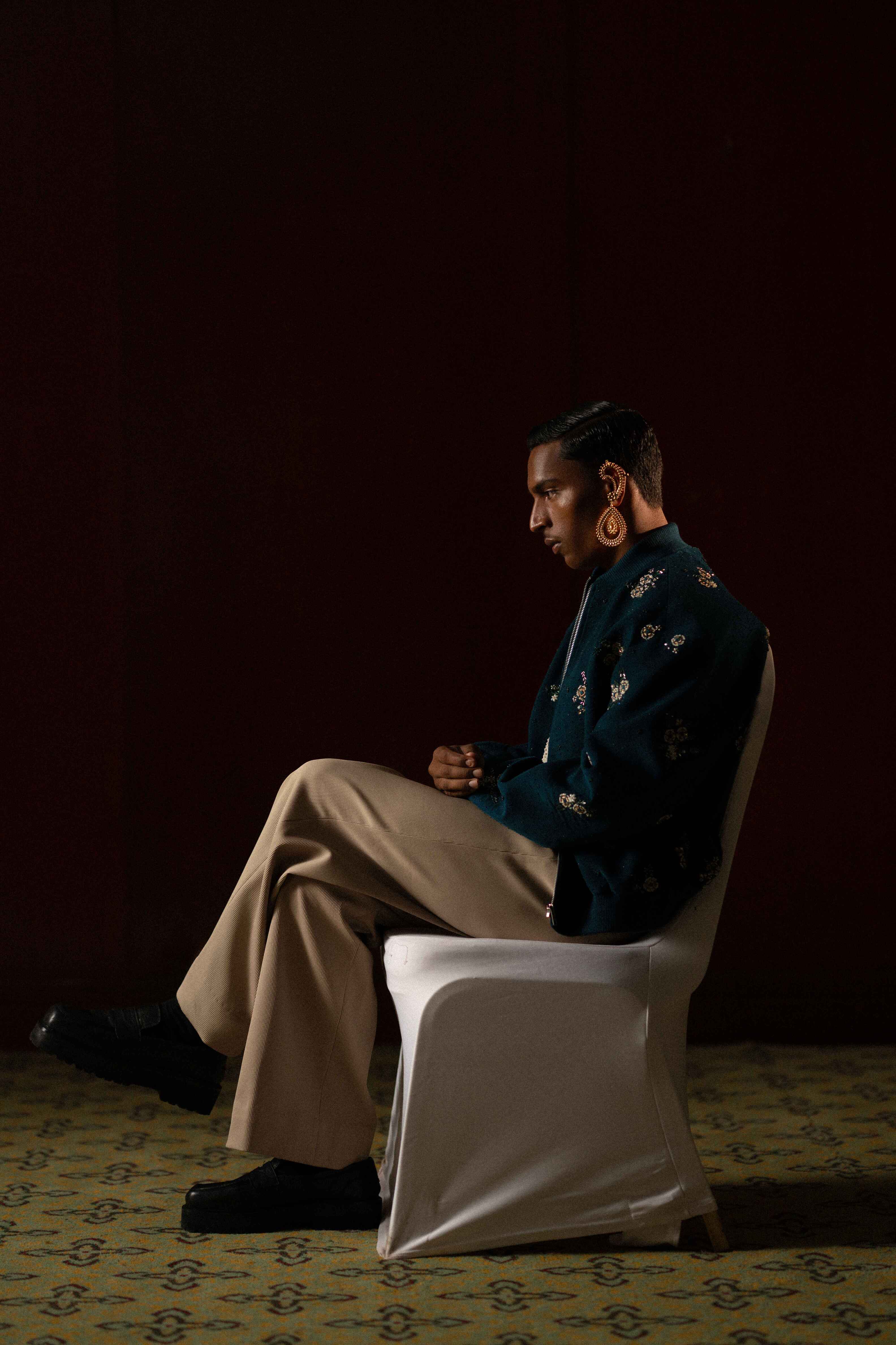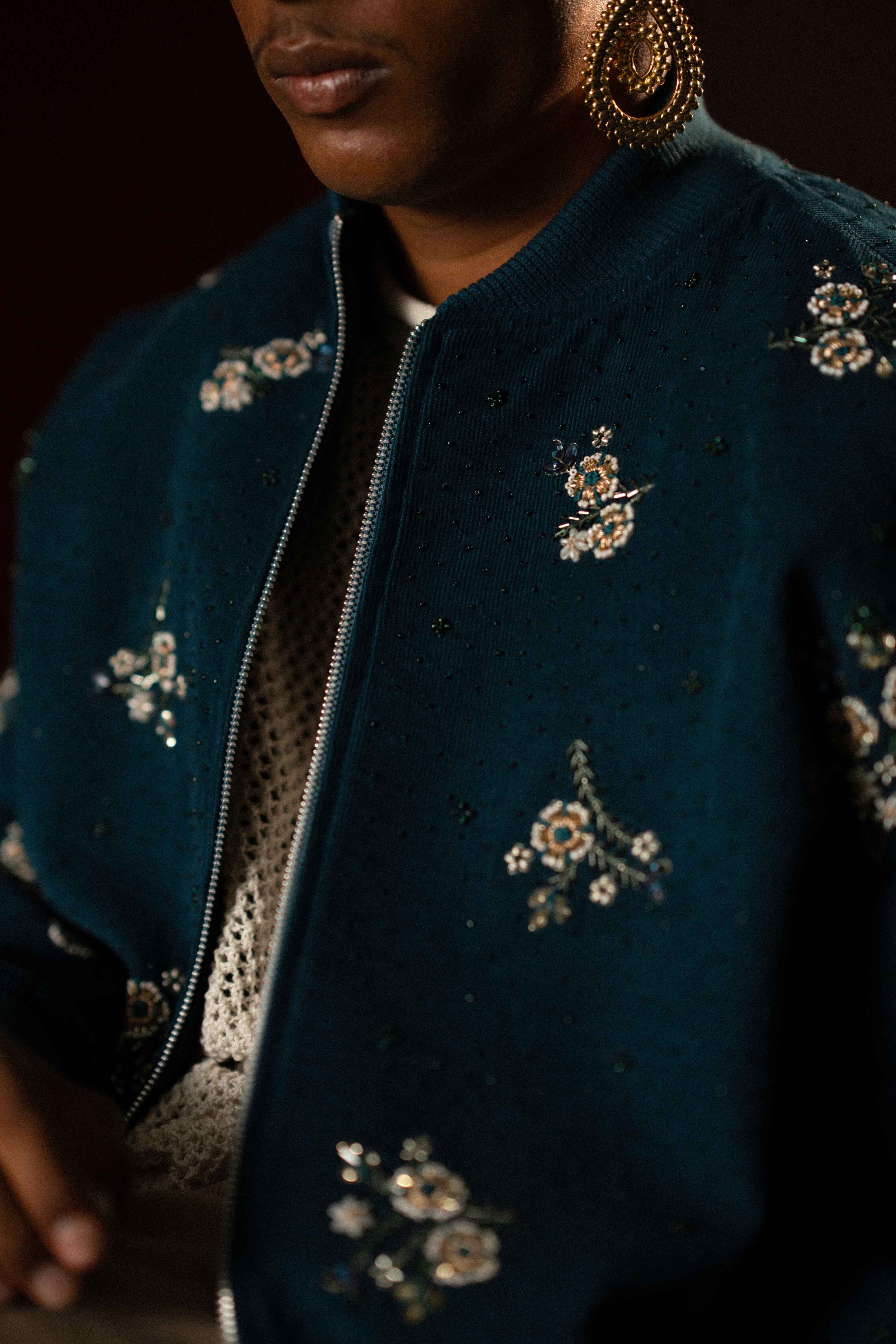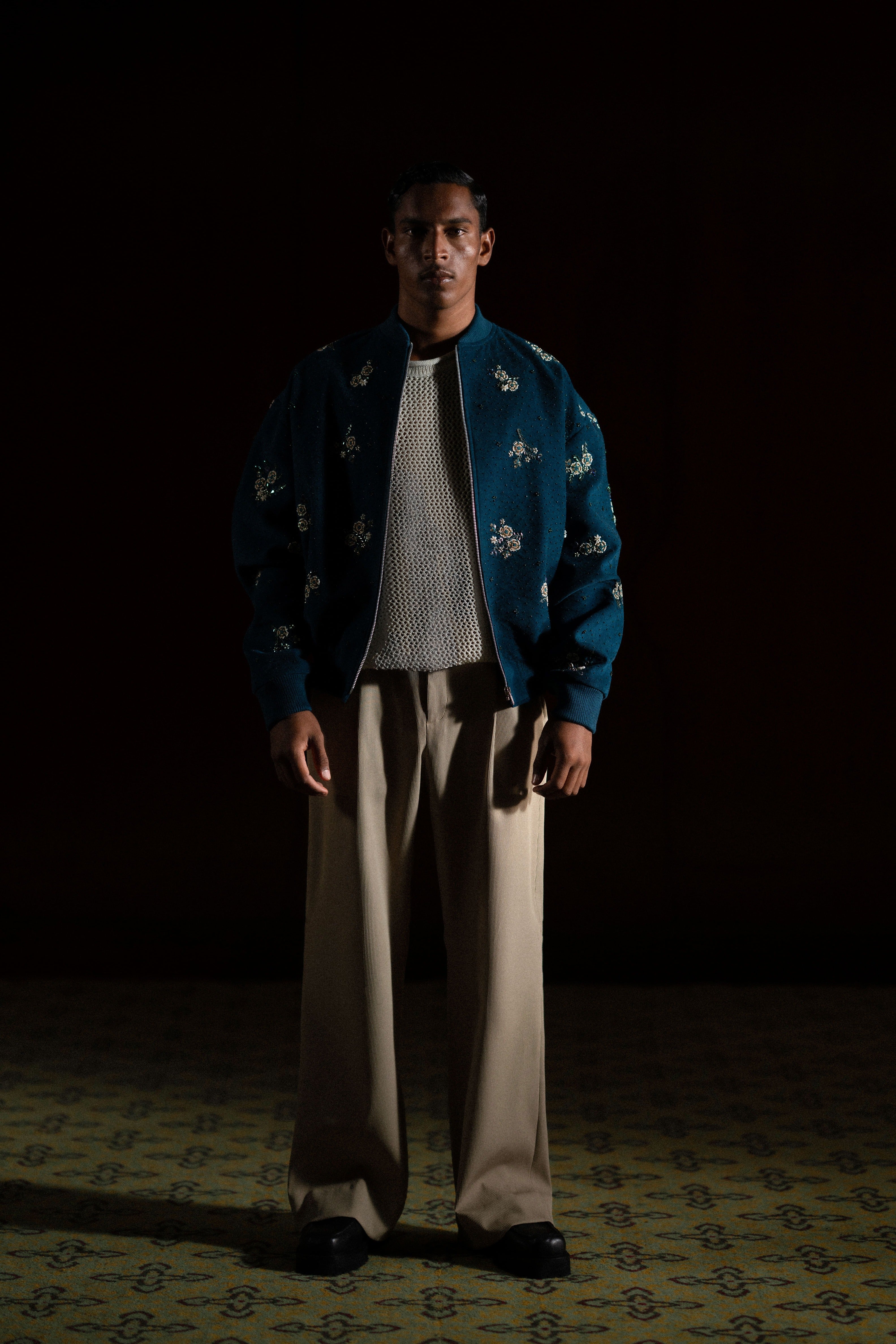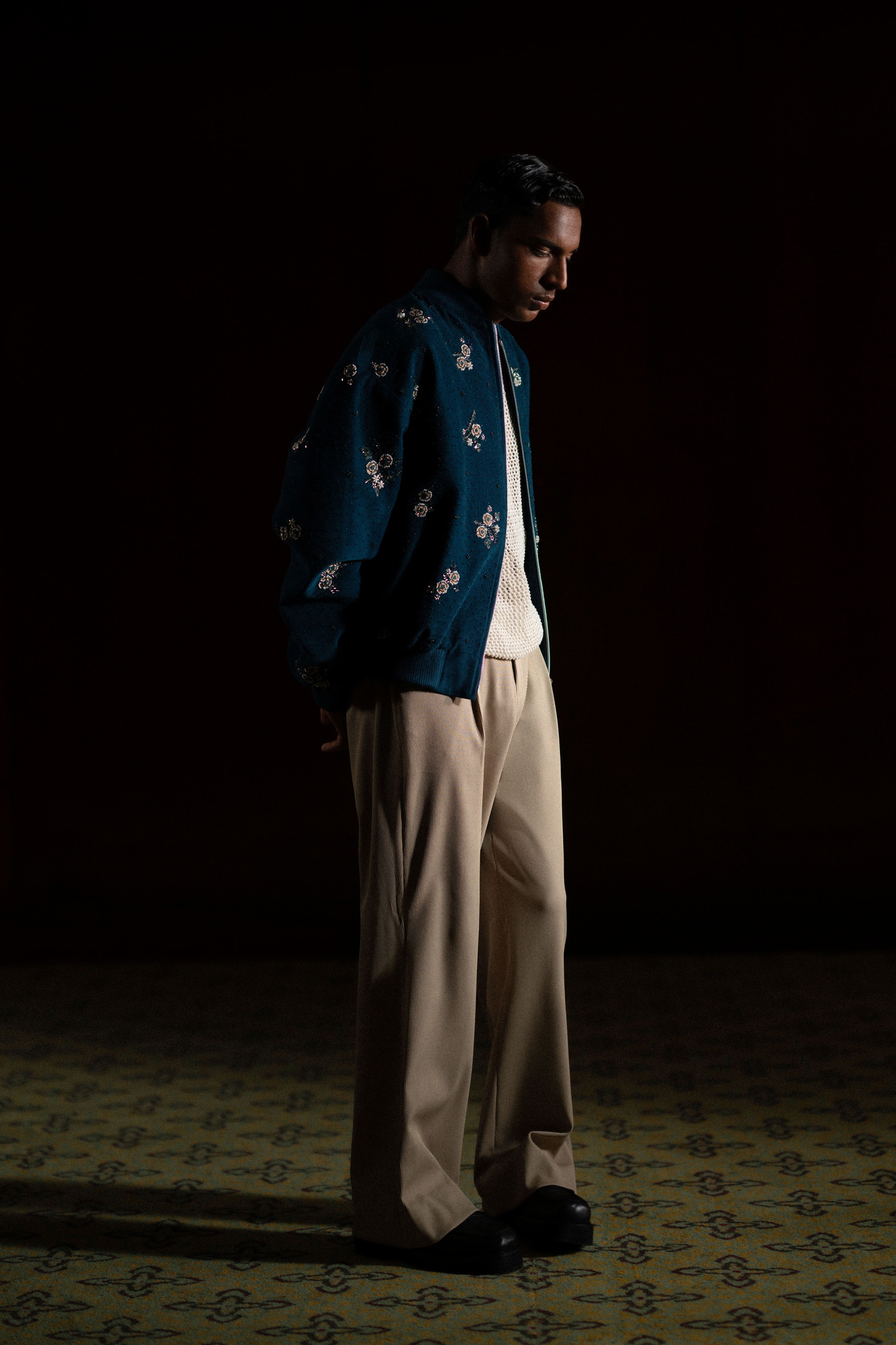 Elevate your texture game with this striking ensemble. The signature piece is the cropped bomber jacket, crafted in a rich, deep marine or teal corduroy. This plush fabric provides a beautiful backdrop for the intricate tonal and multi-hued bead or thread embellishments in a beautiful floral or celestial motif. It is perfectly balanced by the sophisticated, high-waisted wide-leg trousers in a neutral tan or camel hue, offering a relaxed and flowing silhouette. A true fusion of comfort, artistry, and luxury.