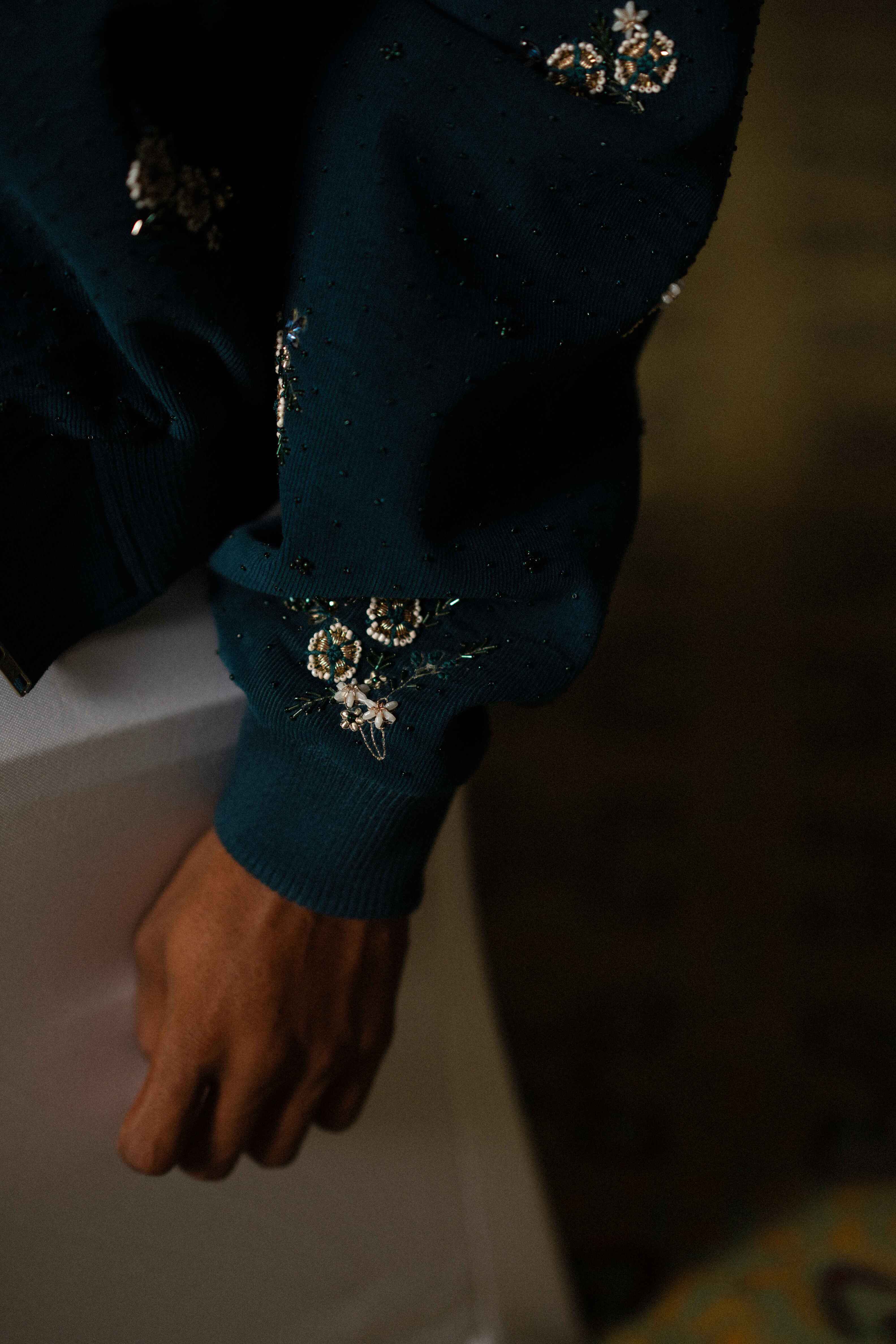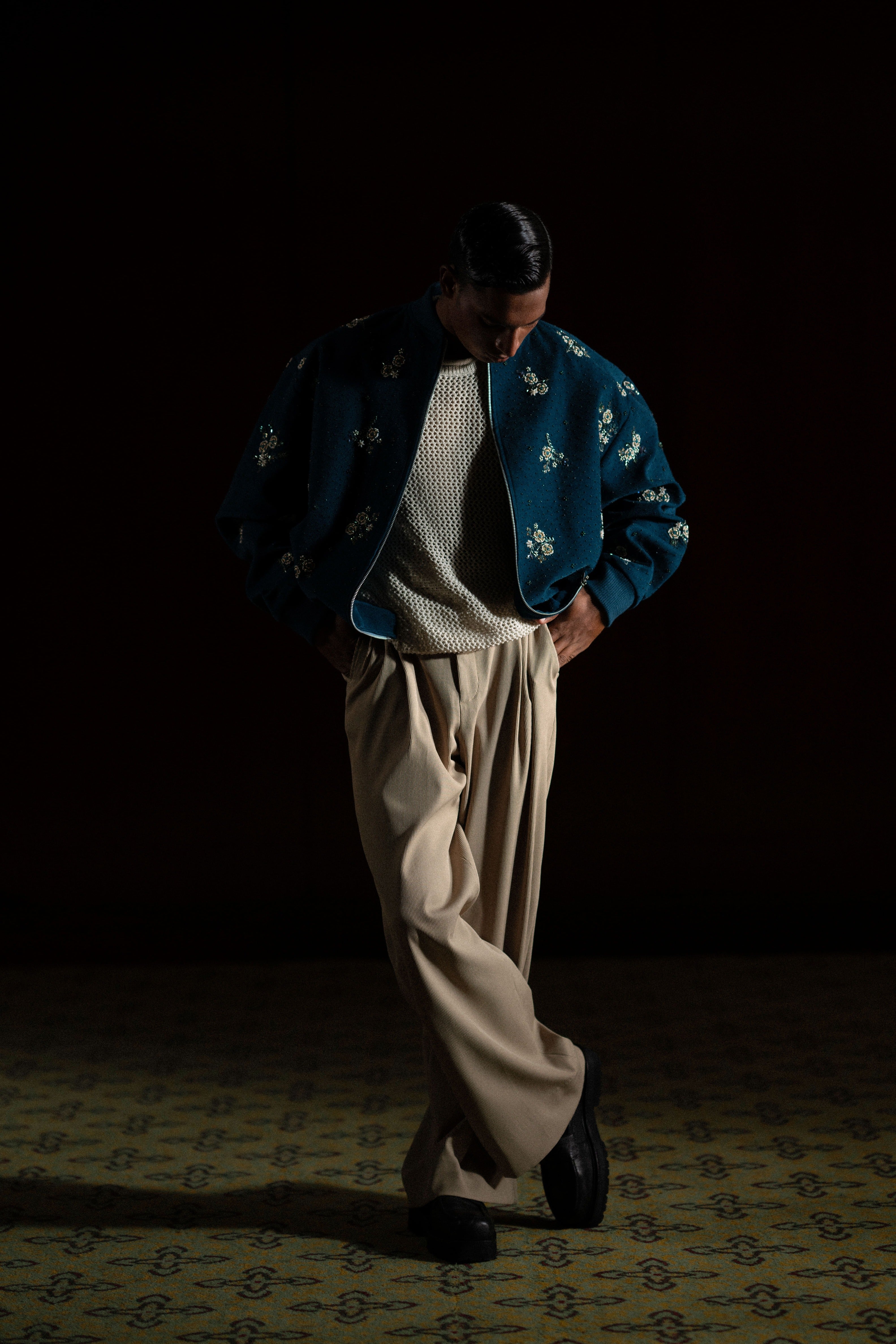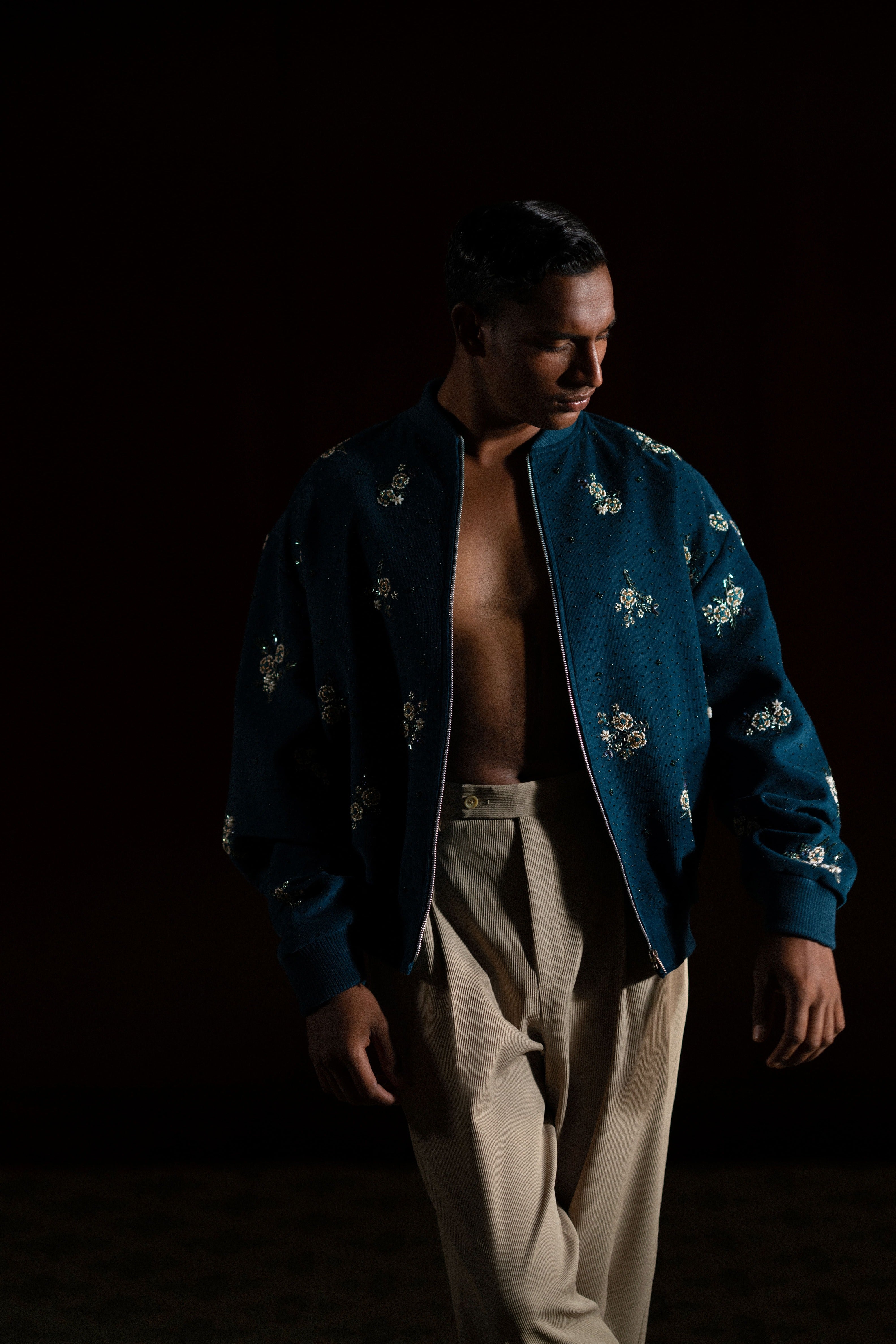 Elevate your texture game with this striking ensemble. The signature piece is the cropped bomber jacket, crafted in a rich, deep marine or teal corduroy. This plush fabric provides a beautiful backdrop for the intricate tonal and multi-hued bead or thread embellishments in a beautiful floral or celestial motif. It is perfectly balanced by the sophisticated, high-waisted wide-leg trousers in a neutral tan or camel hue, offering a relaxed and flowing silhouette. A true fusion of comfort, artistry, and luxury.