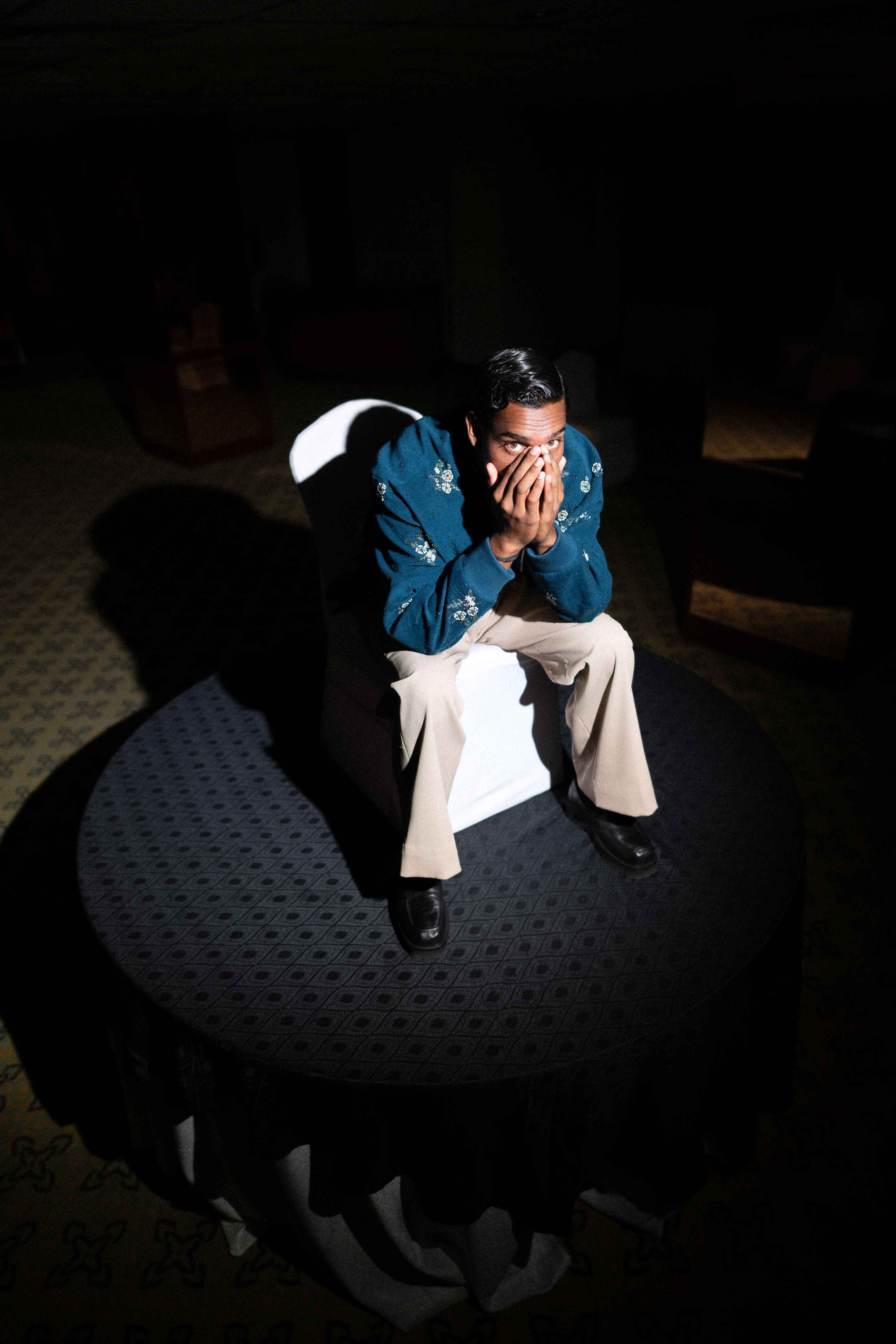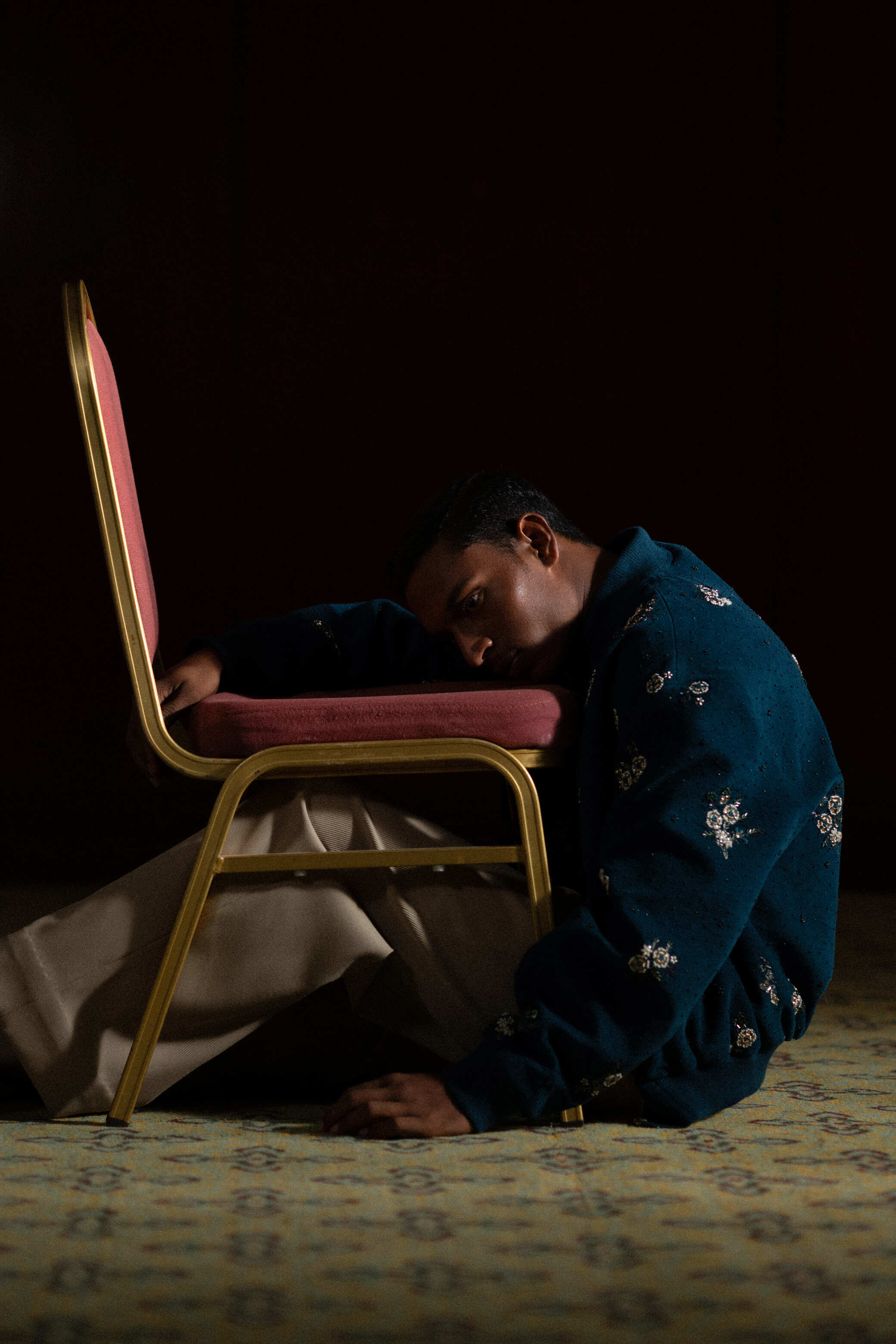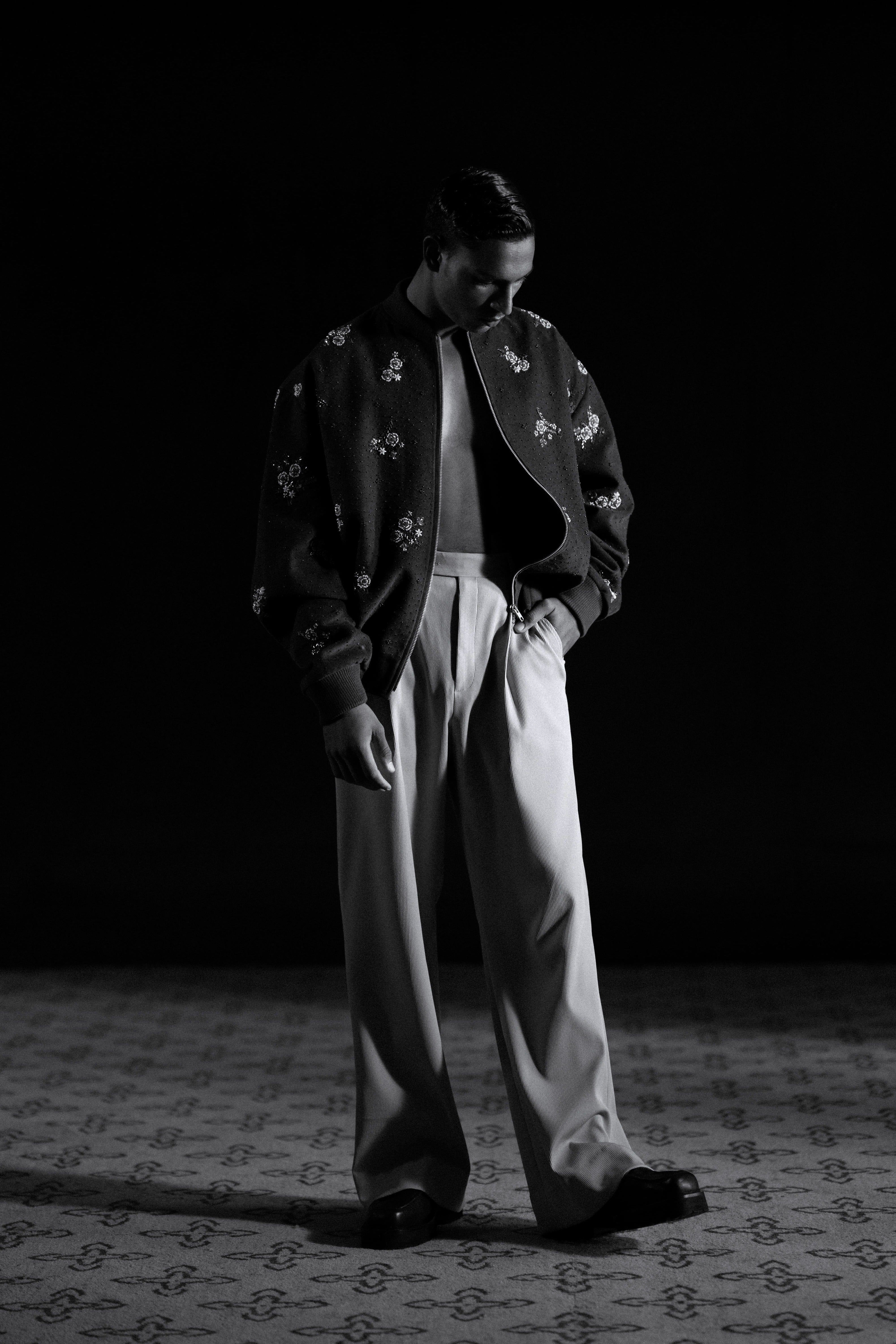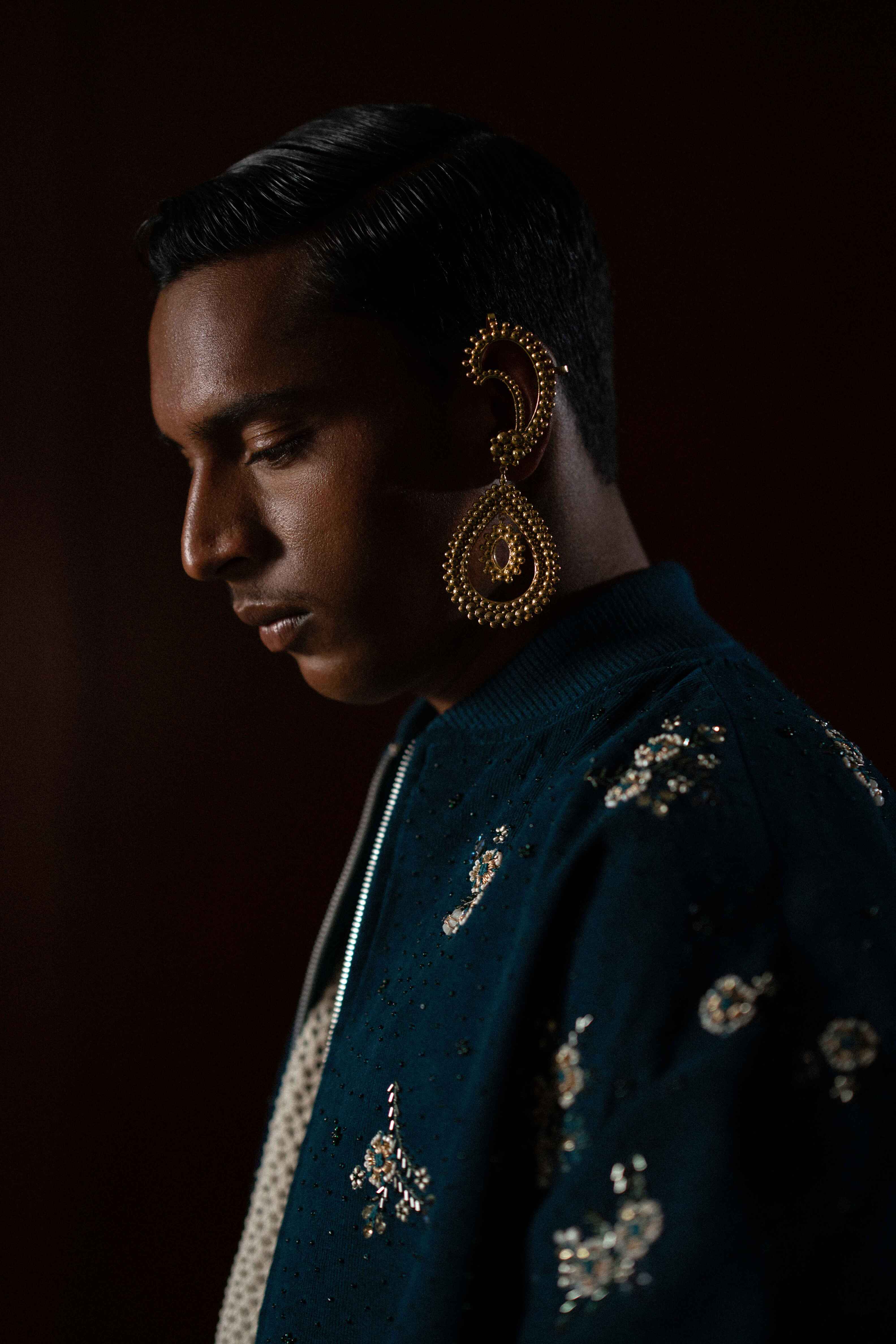 Elevate your texture game with this striking ensemble. The signature piece is the cropped bomber jacket, crafted in a rich, deep marine or teal corduroy. This plush fabric provides a beautiful backdrop for the intricate tonal and multi-hued bead or thread embellishments in a beautiful floral or celestial motif. It is perfectly balanced by the sophisticated, high-waisted wide-leg trousers in a neutral tan or camel hue, offering a relaxed and flowing silhouette. A true fusion of comfort, artistry, and luxury.