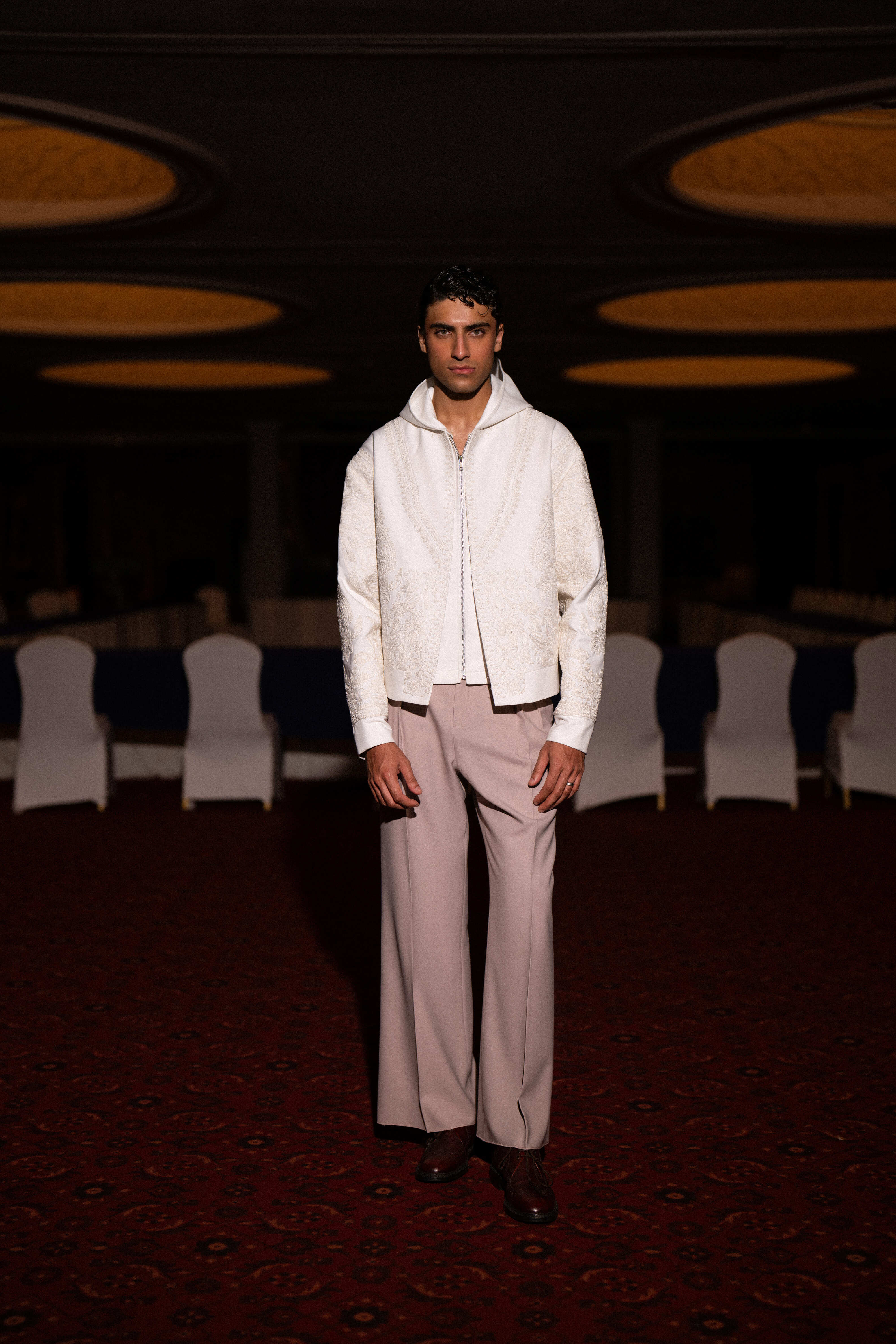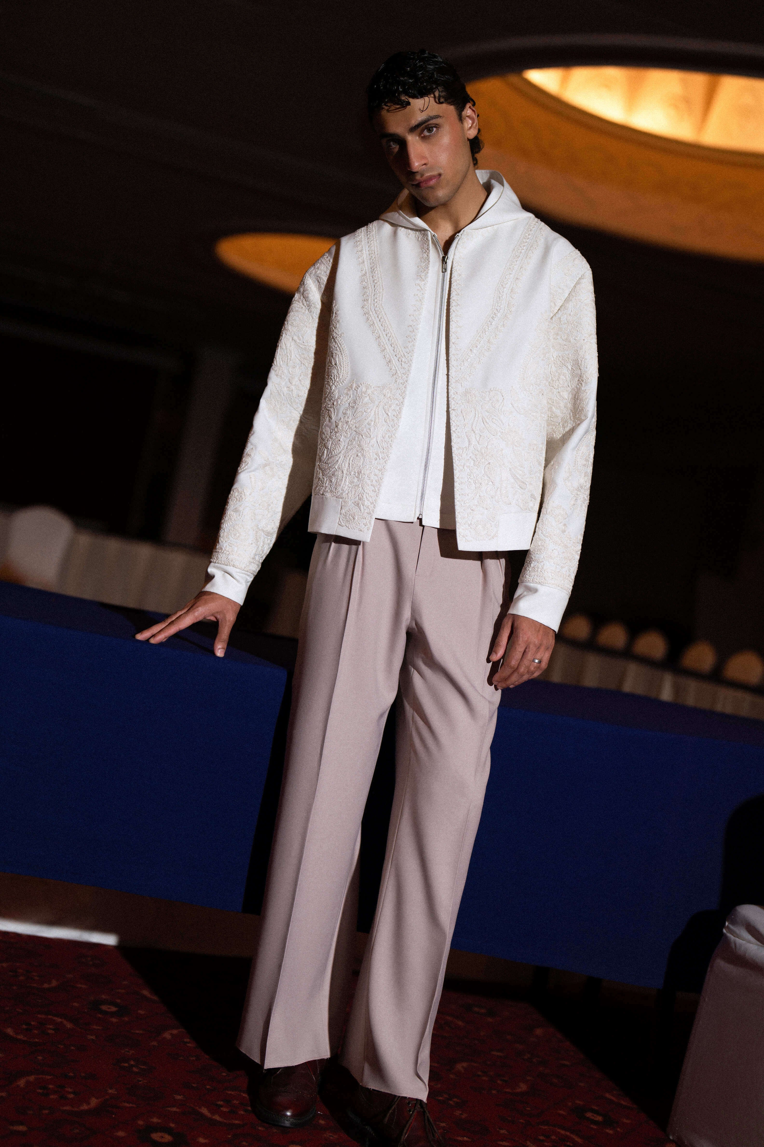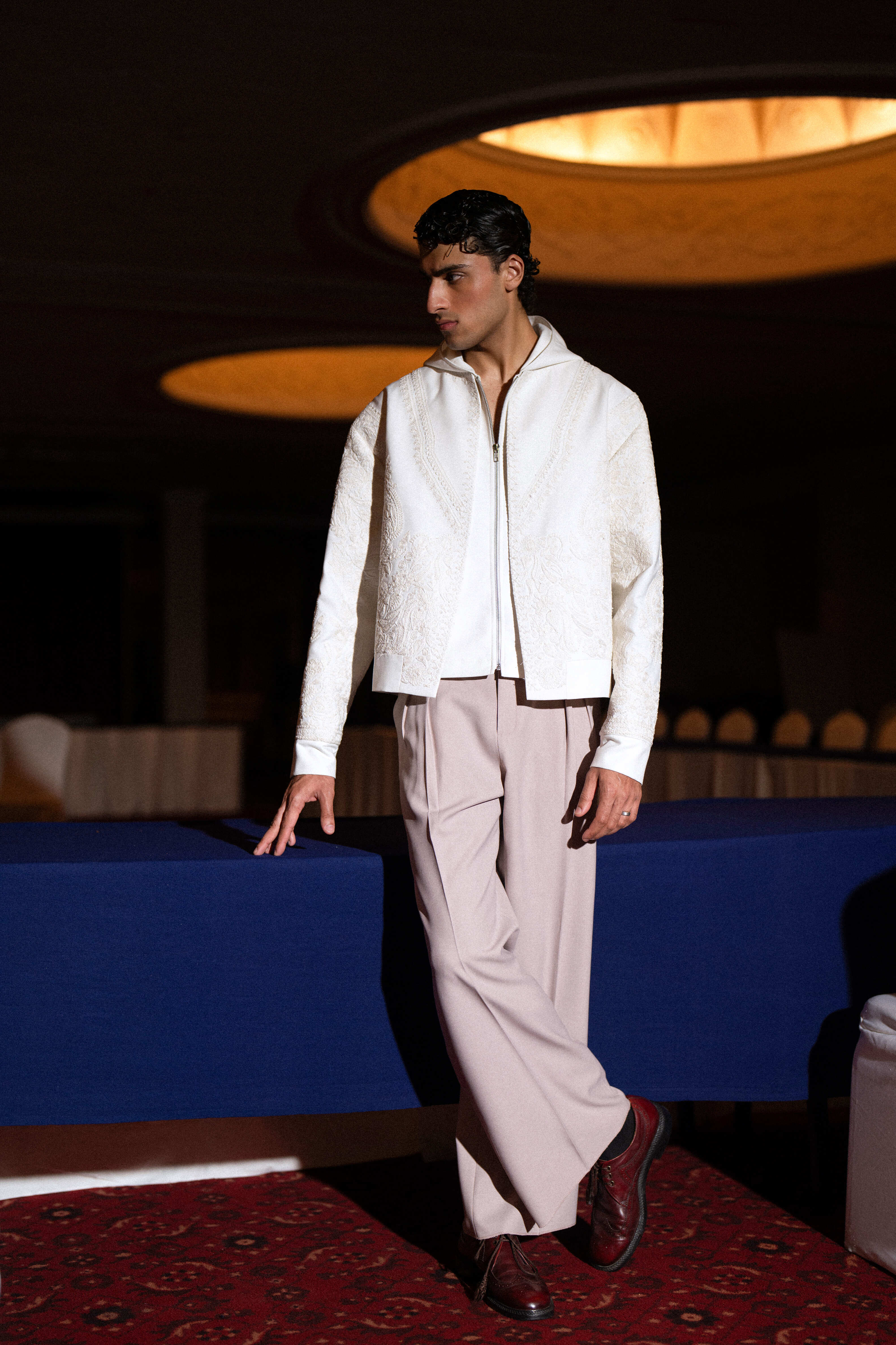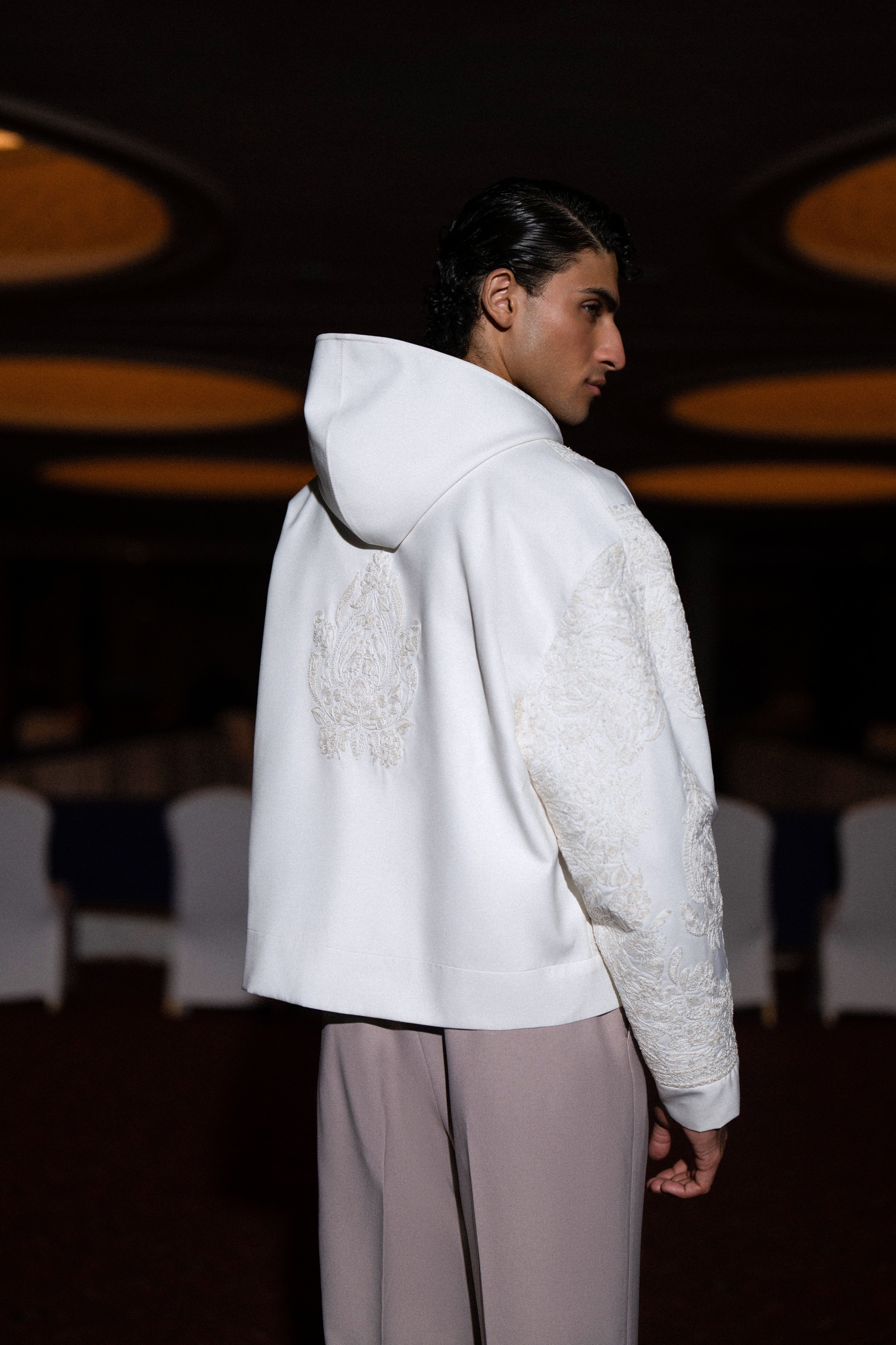 Redefining luxury sportswear. This signature piece takes the casual silhouette of a cropped, zip-front hoodie jacket and elevates it through meticulous craftsmanship. The entire surface is covered in rich tonal thread embellishment, creating a dense, beautiful baroque or floral pattern against the crisp ivory fabric. This detailed jacket is paired with refined, wide-leg trousers in a soft blush or light taupe hue, providing a fluid and sophisticated contrast. An ideal piece for making a luxurious statement.