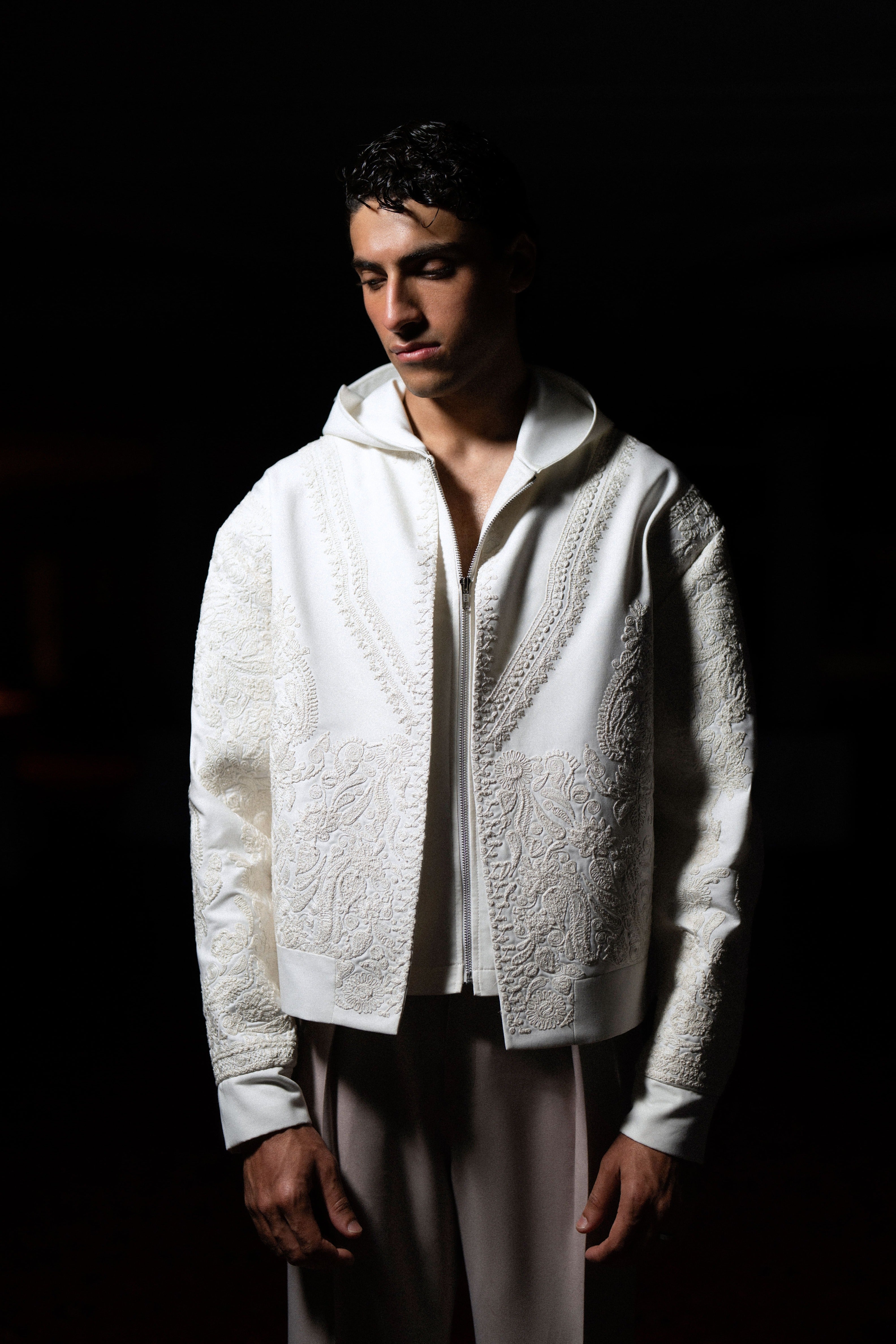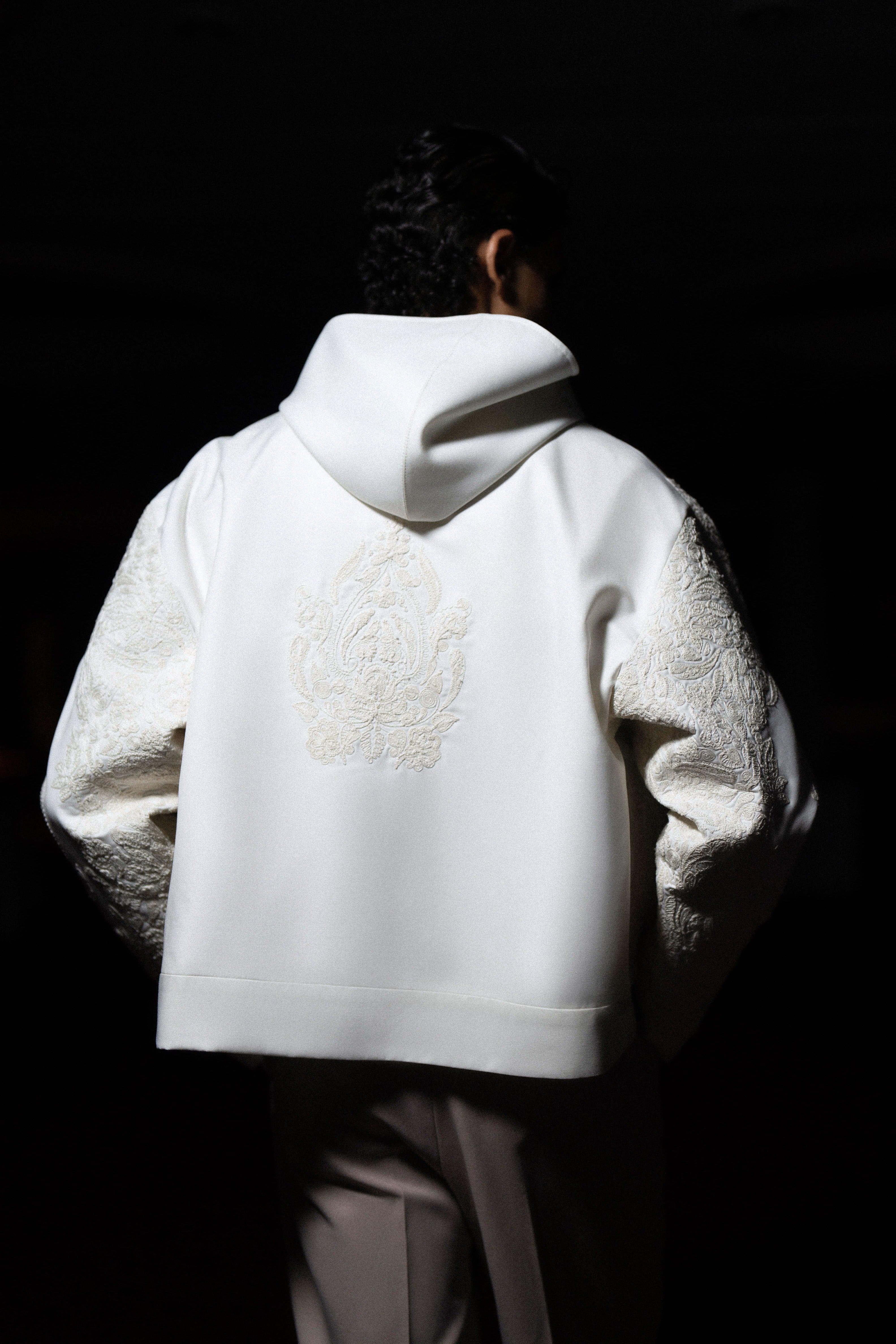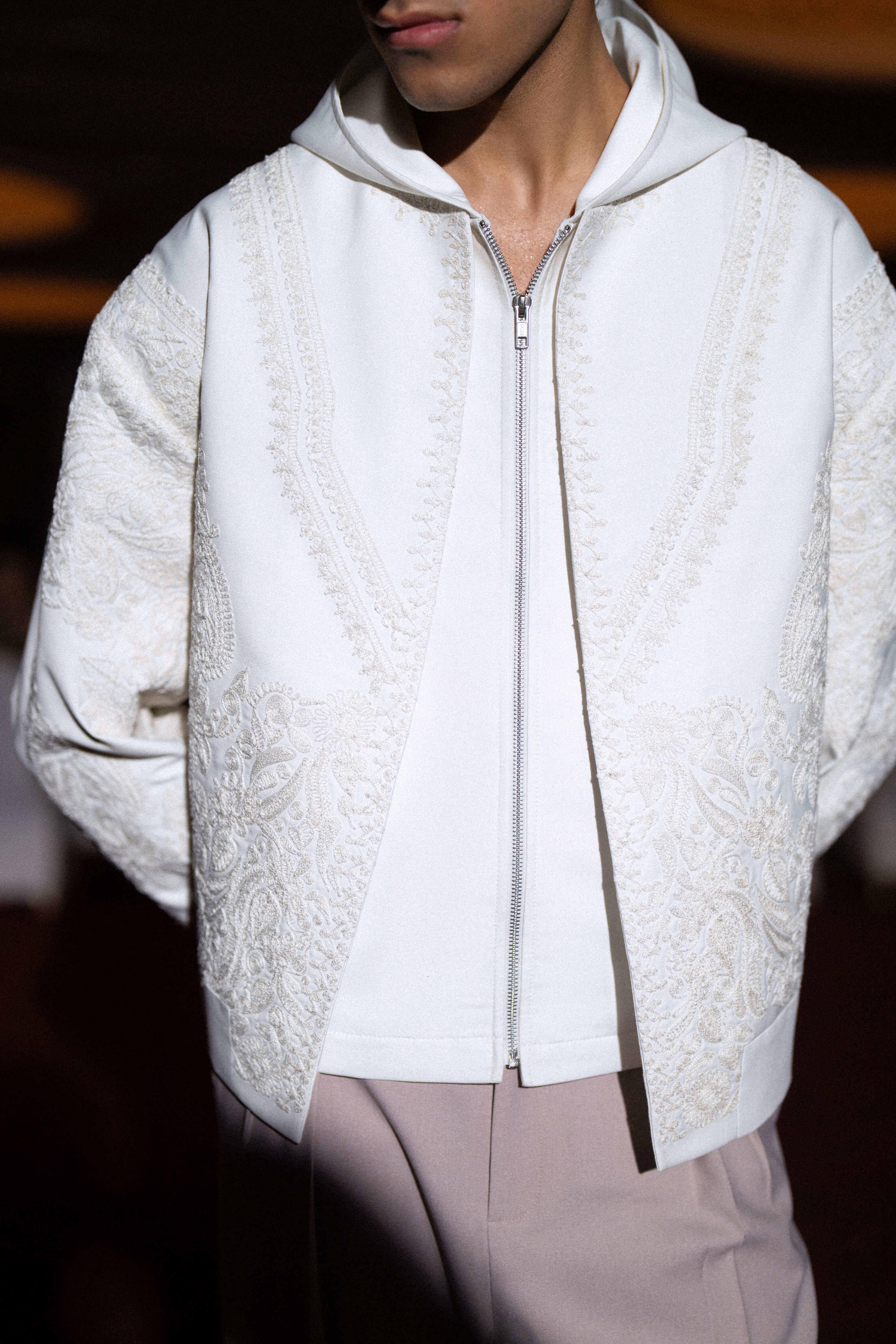 Redefining luxury sportswear. This signature piece takes the casual silhouette of a cropped, zip-front hoodie jacket and elevates it through meticulous craftsmanship. The entire surface is covered in rich tonal thread embellishment, creating a dense, beautiful baroque or floral pattern against the crisp ivory fabric. This detailed jacket is paired with refined, wide-leg trousers in a soft blush or light taupe hue, providing a fluid and sophisticated contrast. An ideal piece for making a luxurious statement.