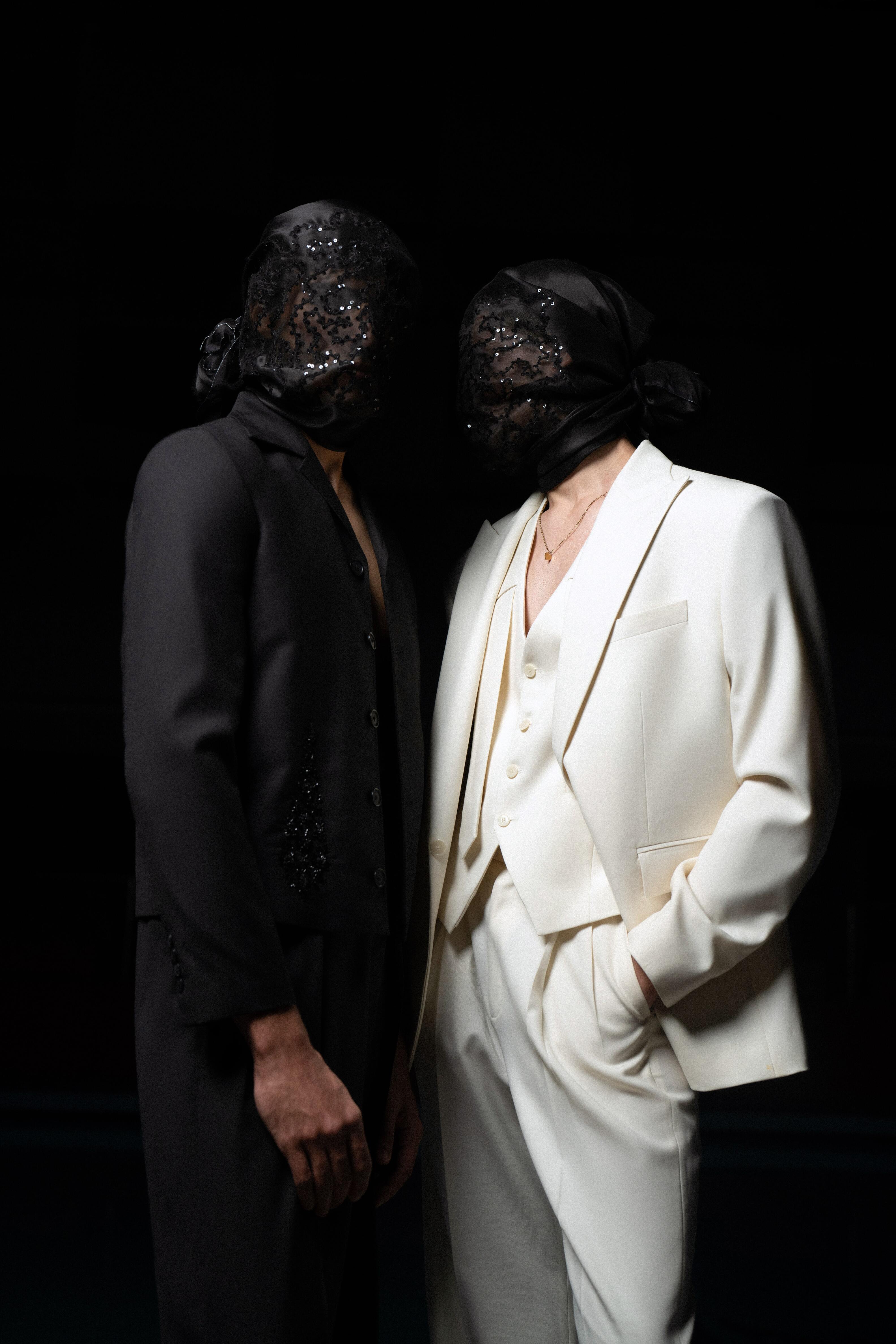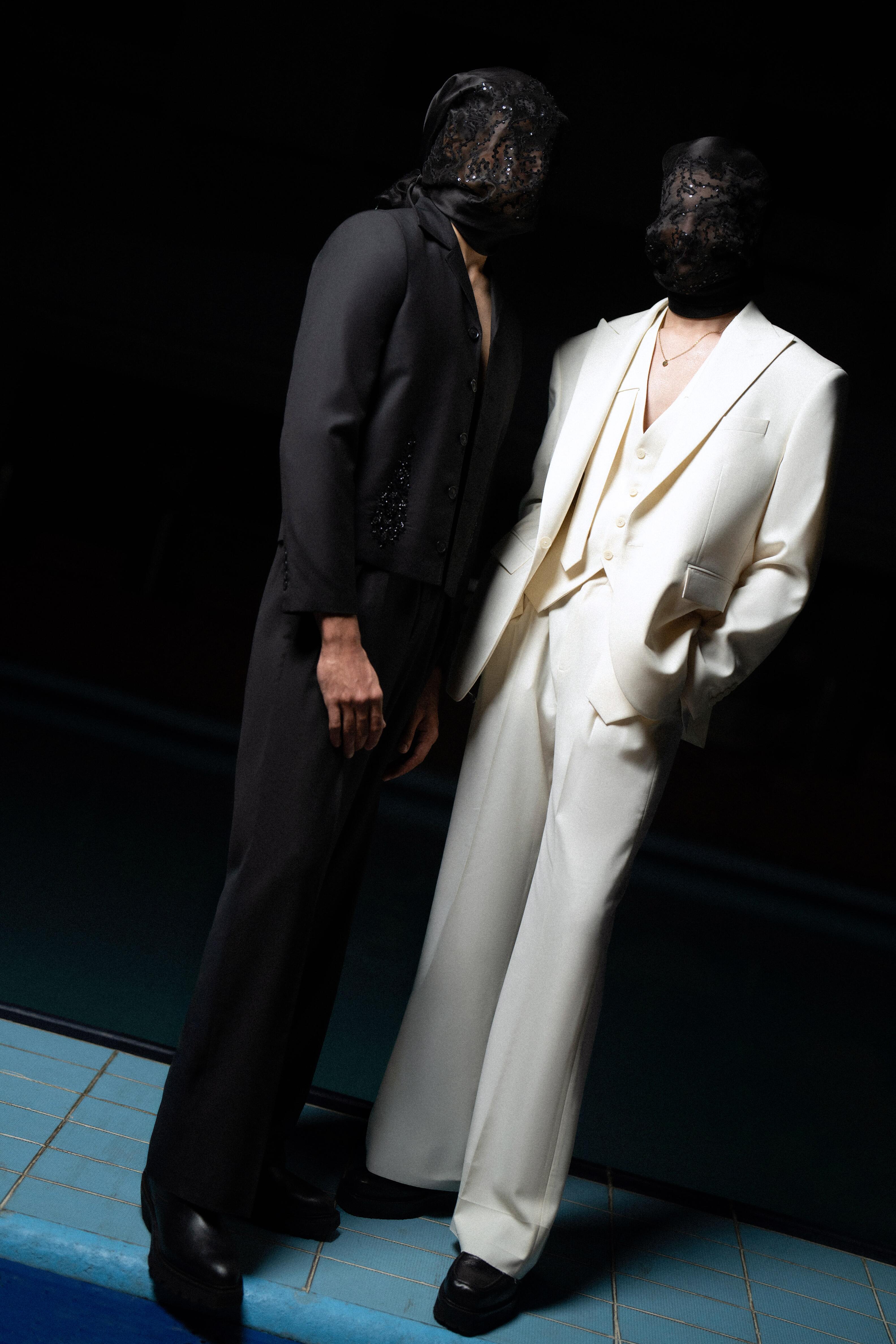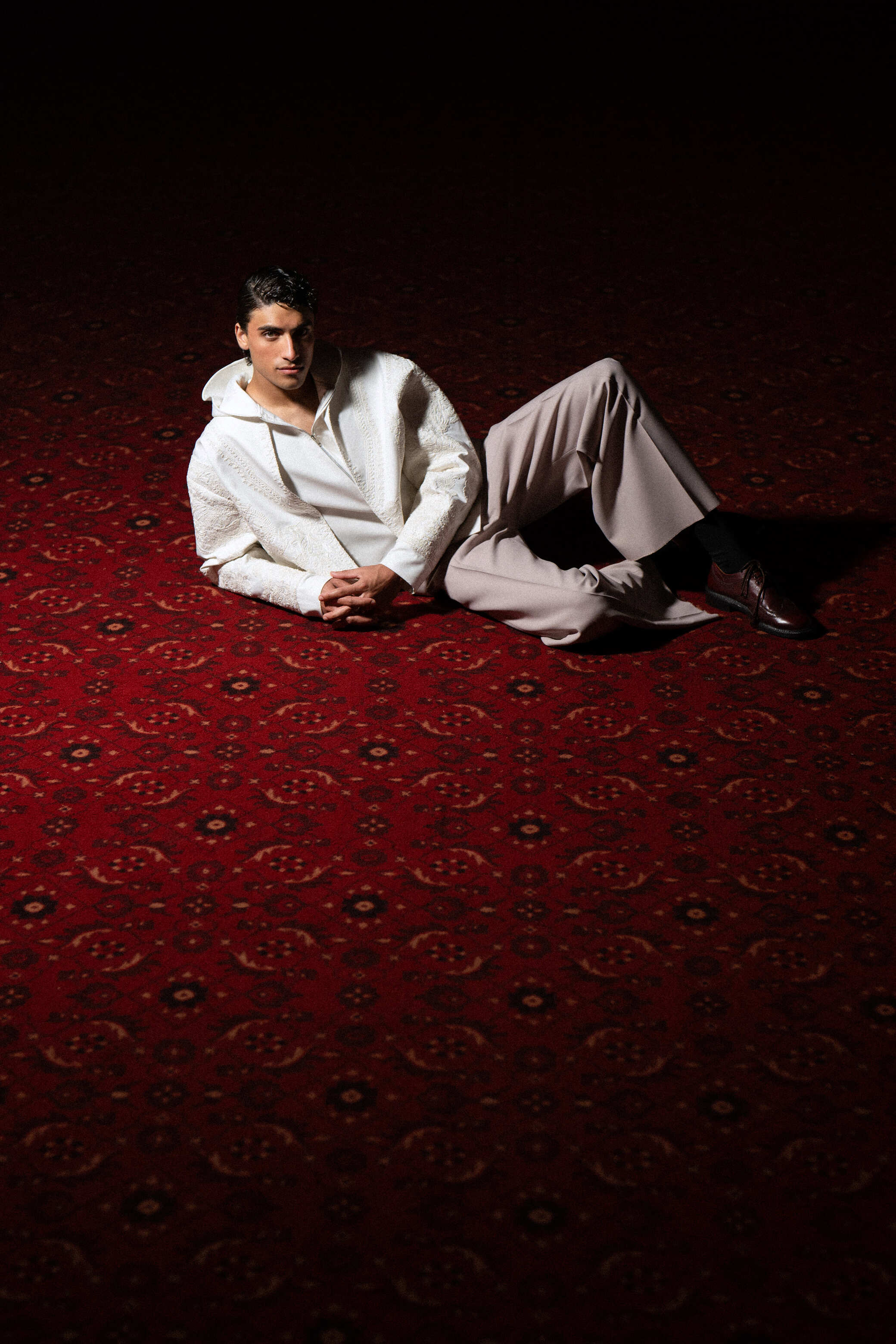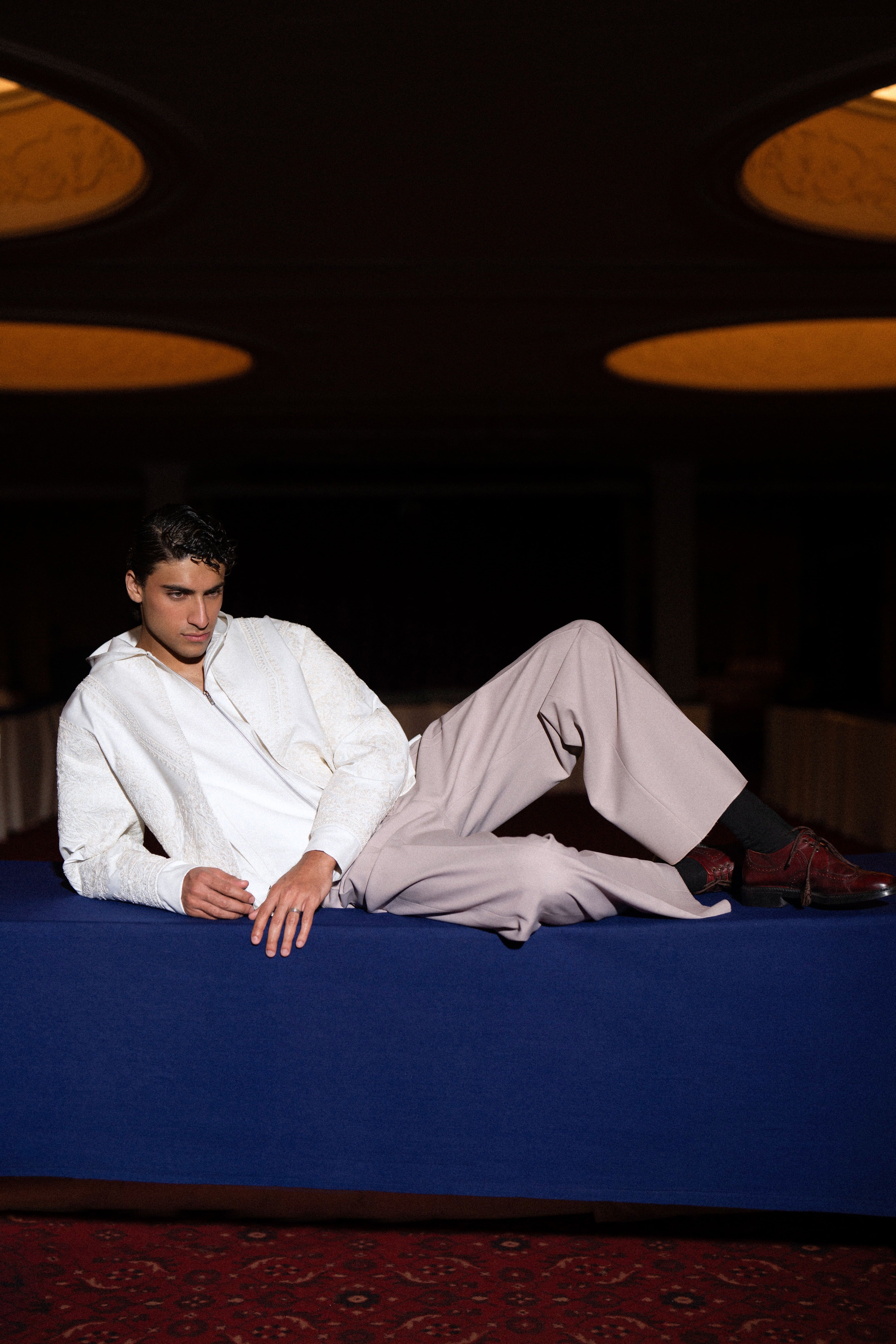 Redefining luxury sportswear. This signature piece takes the casual silhouette of a cropped, zip-front hoodie jacket and elevates it through meticulous craftsmanship. The entire surface is covered in rich tonal thread embellishment, creating a dense, beautiful baroque or floral pattern against the crisp ivory fabric. This detailed jacket is paired with refined, wide-leg trousers in a soft blush or light taupe hue, providing a fluid and sophisticated contrast. An ideal piece for making a luxurious statement.