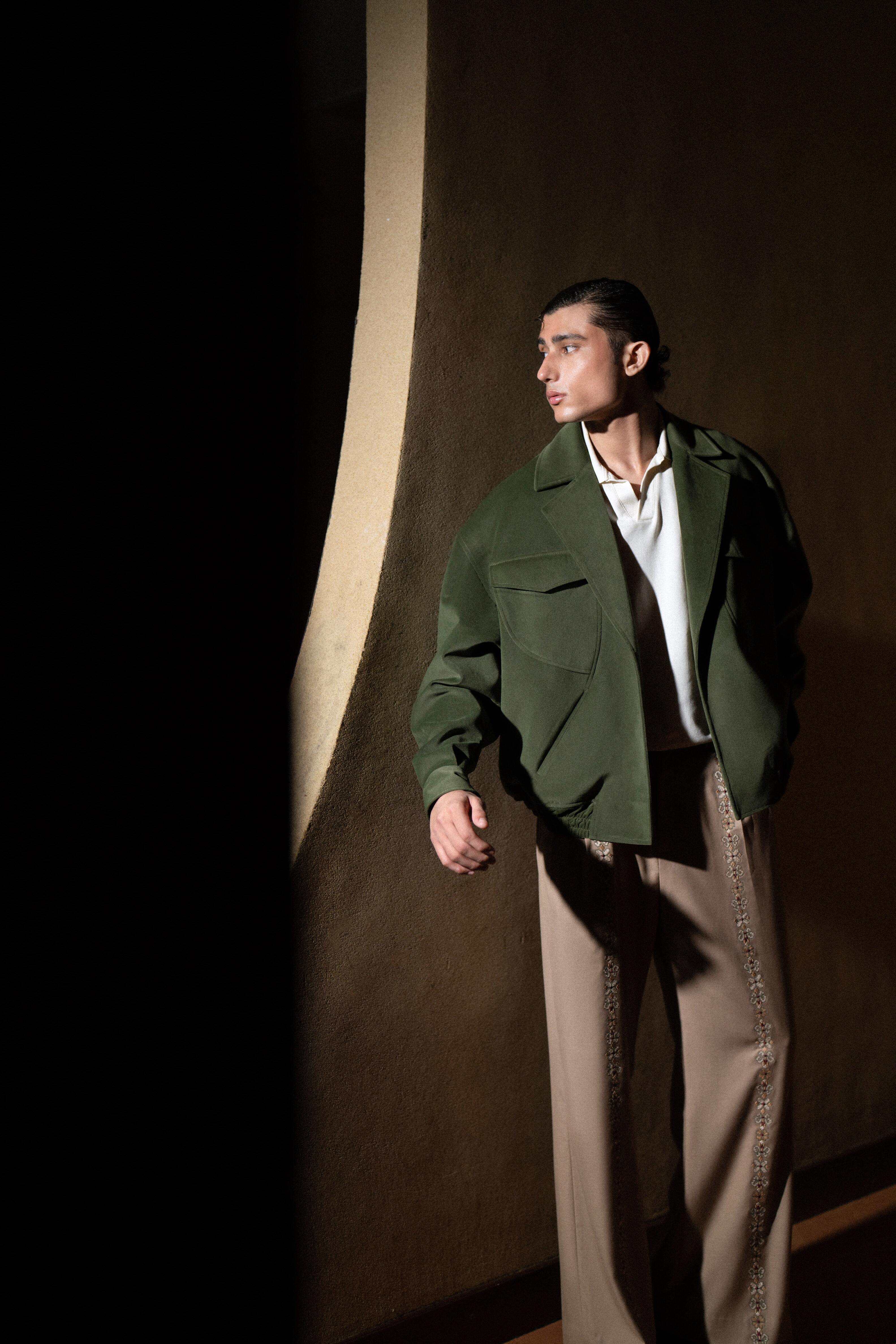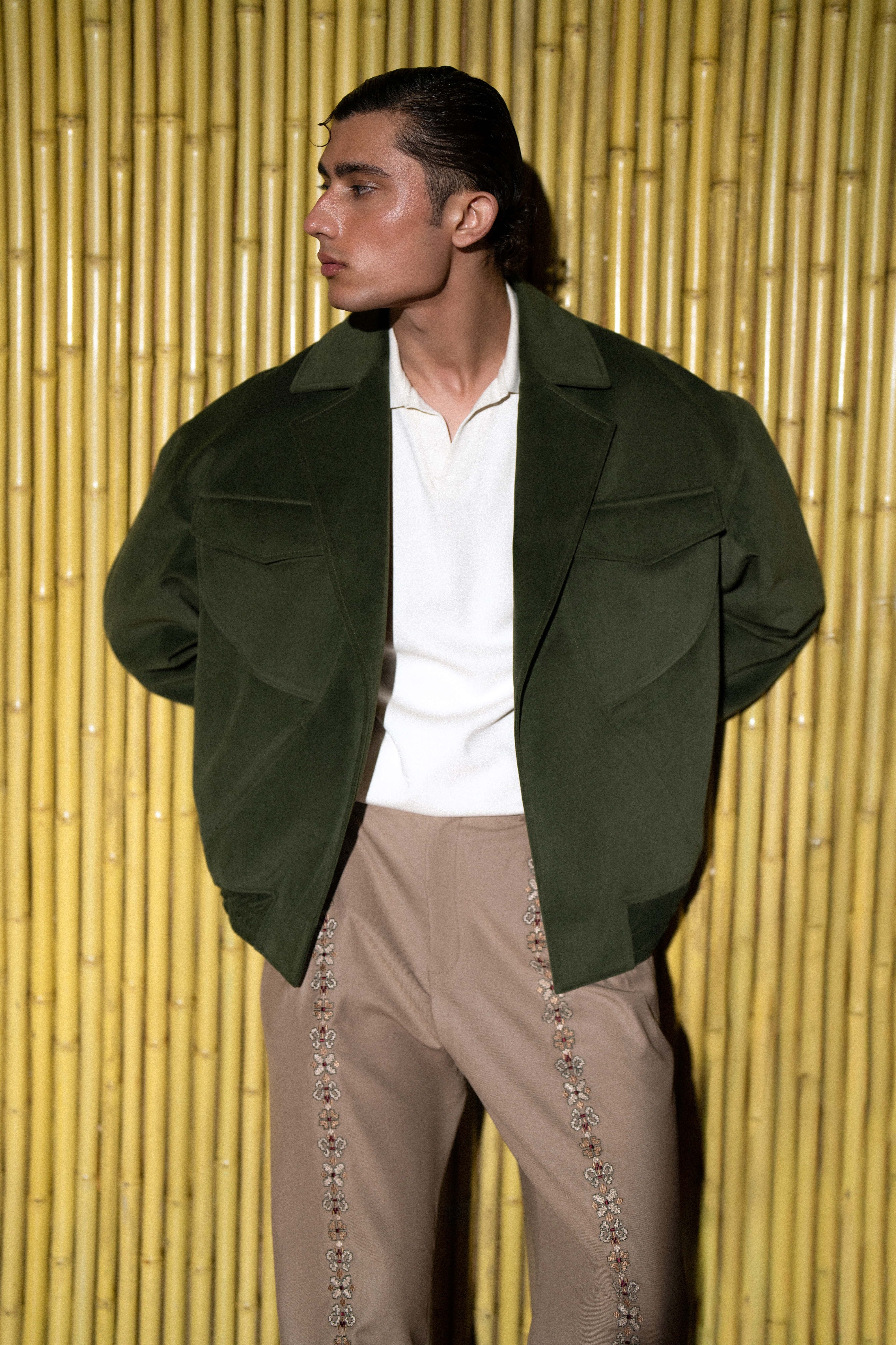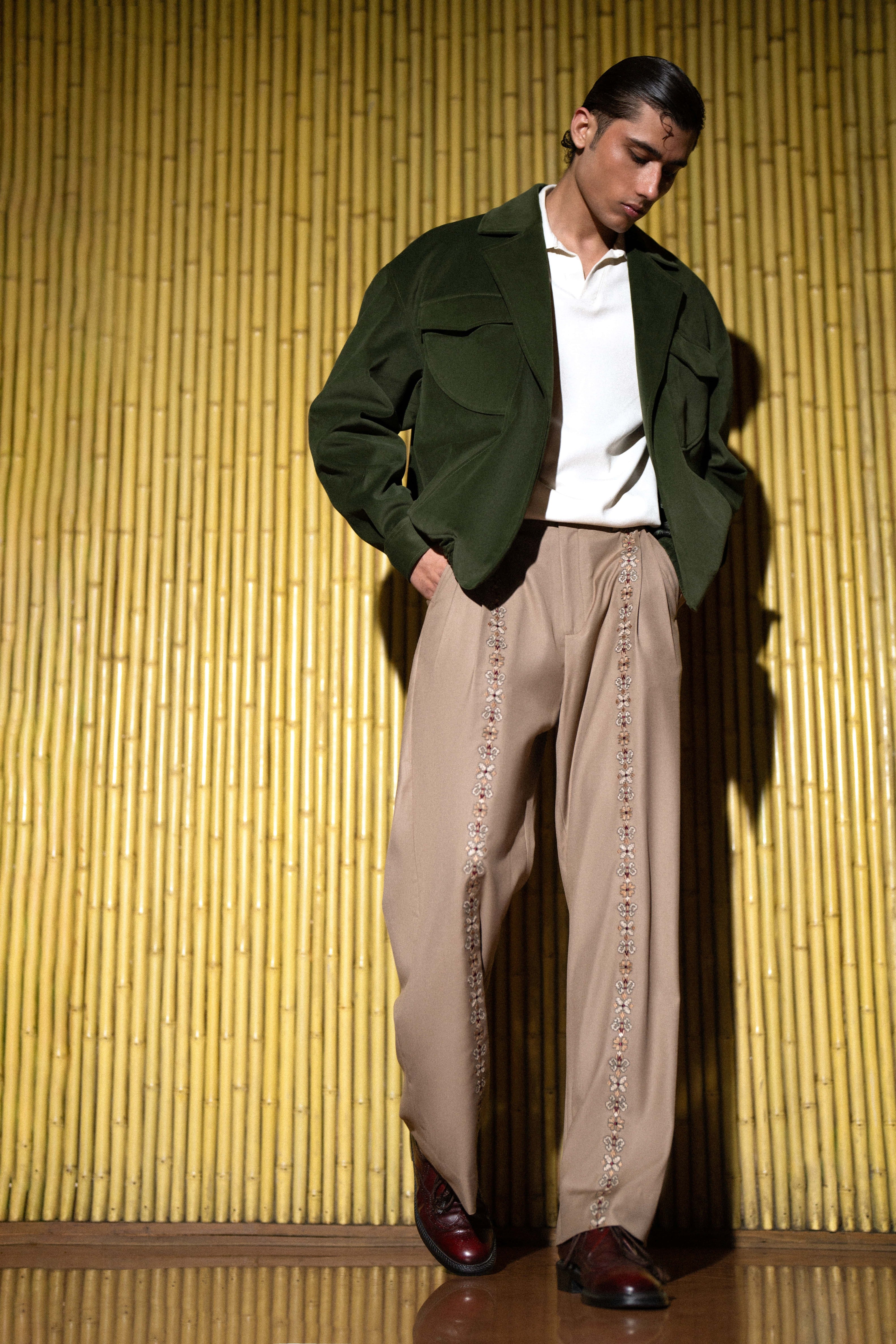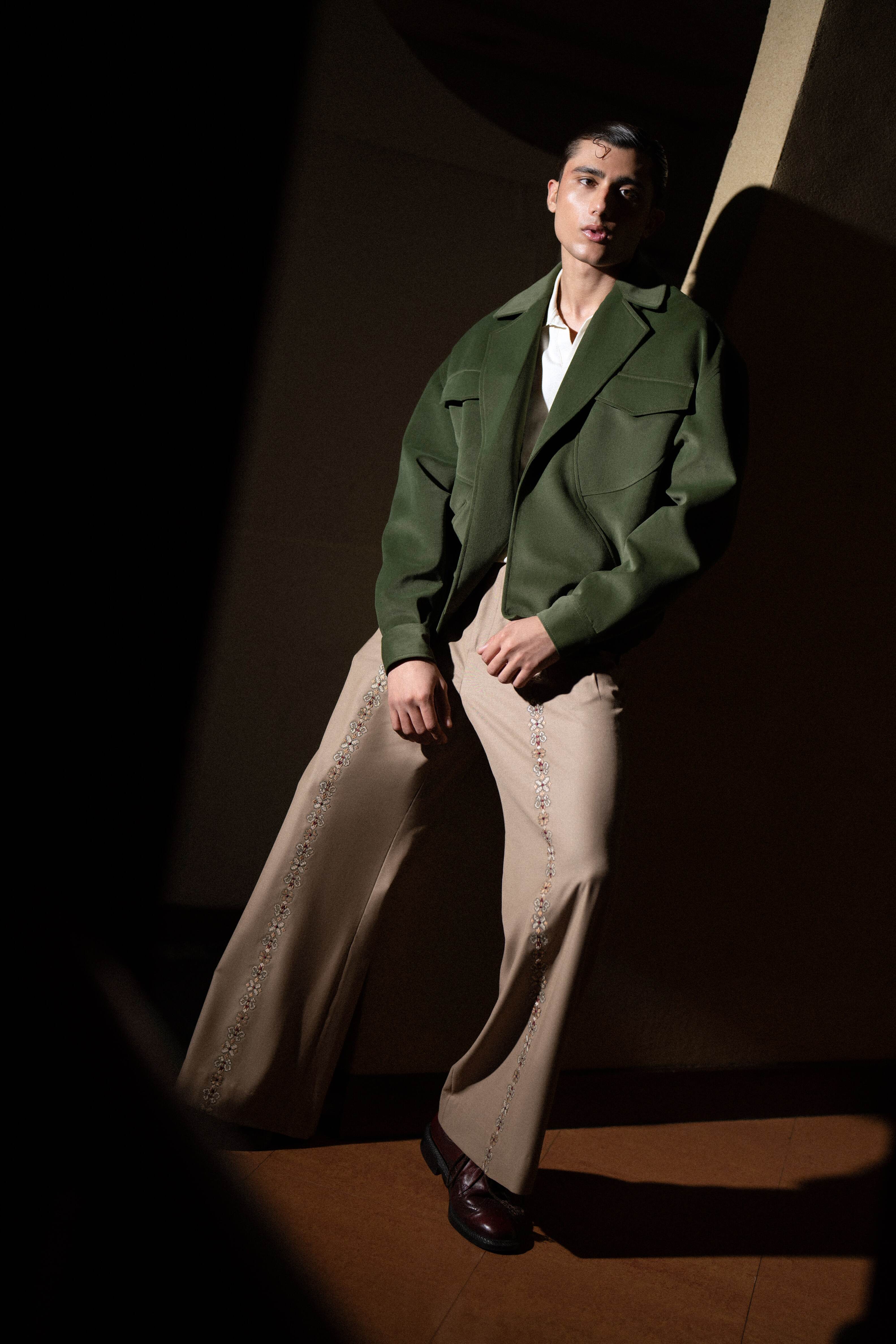 An elevated ensemble that captures rich texture and artisan detail. The jacket is a cropped bomber silhouette crafted in a luxurious forest green suede or heavy twill, featuring large patch pockets and a sharp collar. It is effortlessly paired with wide-leg camel trousers constructed from a flowing twill or cotton. The defining feature is the tonal bead or thread embellishment running down the outer seam of the trousers, offering a subtle yet intricate accent. Wear it open over a polo or knit for smart-casual perfection.