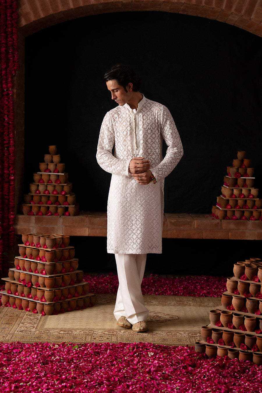 This kurta features exquisite aari work embroidery all over, crafted with timeless elegance. Paired with a beautifully tailored shalwar, it’s the perfect choice for the festive season, blending tradition with refined style.