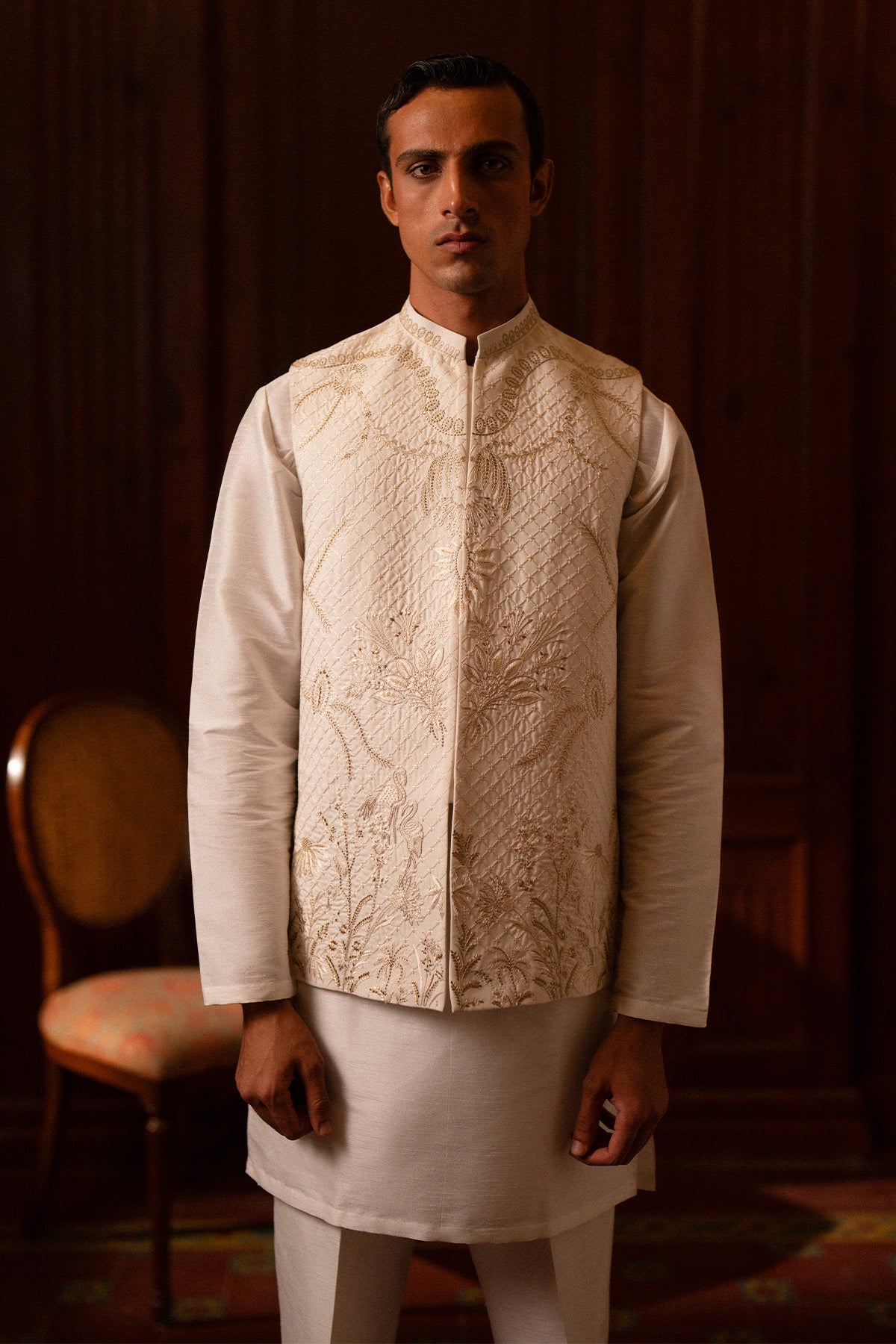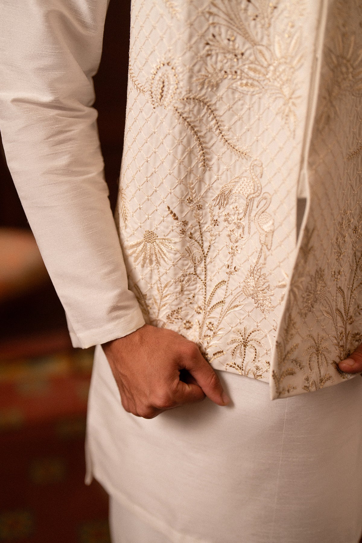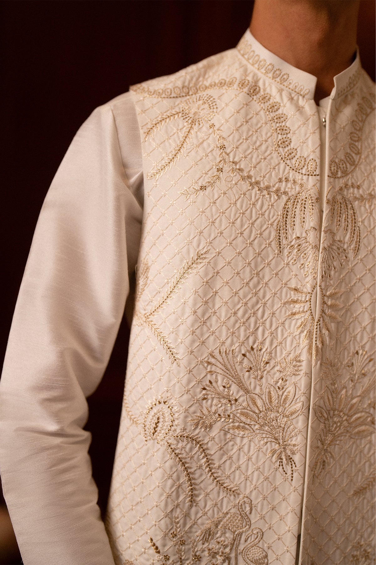 An elegant off-white waistcoat adorned with intricate resham and tila embroidery that adds a timeless charm to the ensemble. Paired effortlessly with a classic kurta pajama, this look strikes the perfect balance between tradition and sophistication