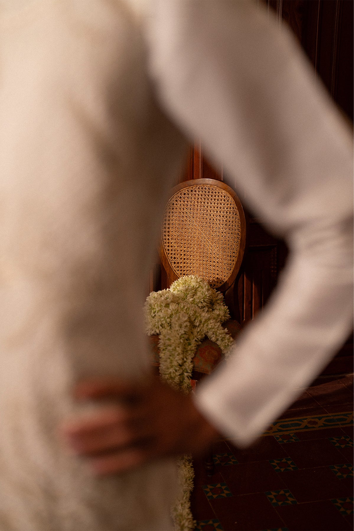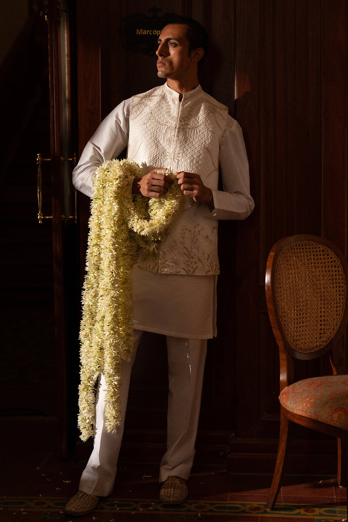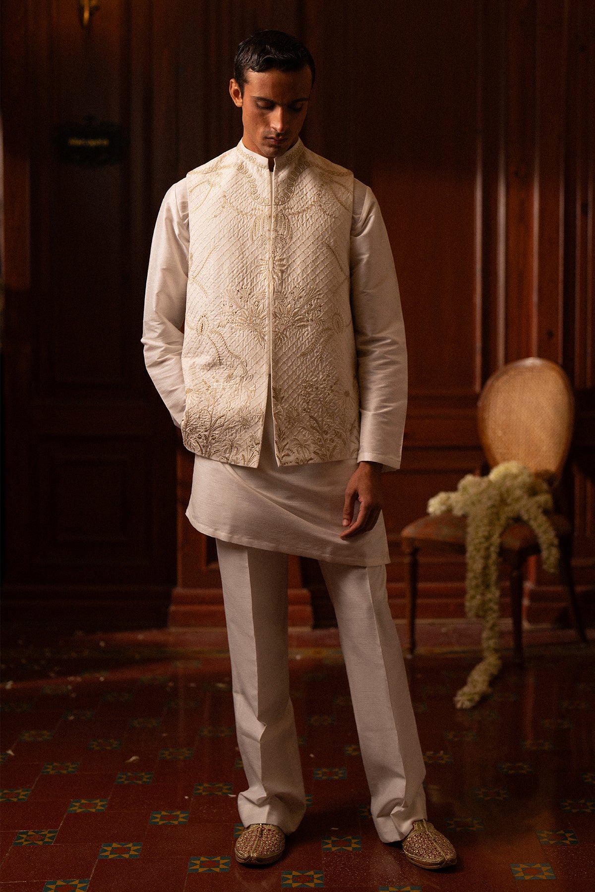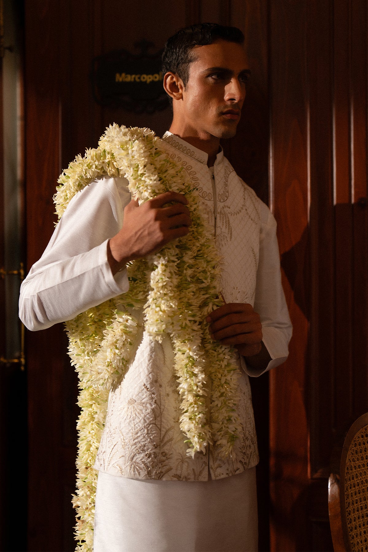 An elegant off-white waistcoat adorned with intricate resham and tila embroidery that adds a timeless charm to the ensemble. Paired effortlessly with a classic kurta pajama, this look strikes the perfect balance between tradition and sophistication