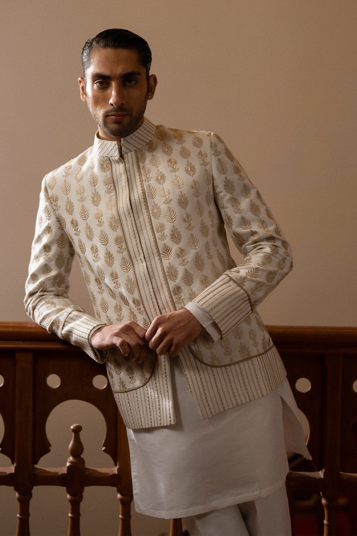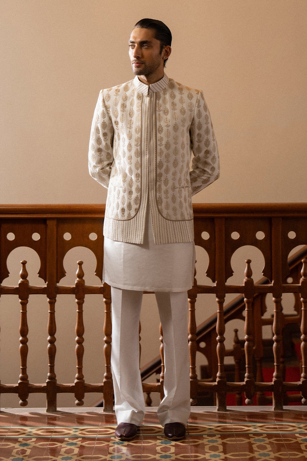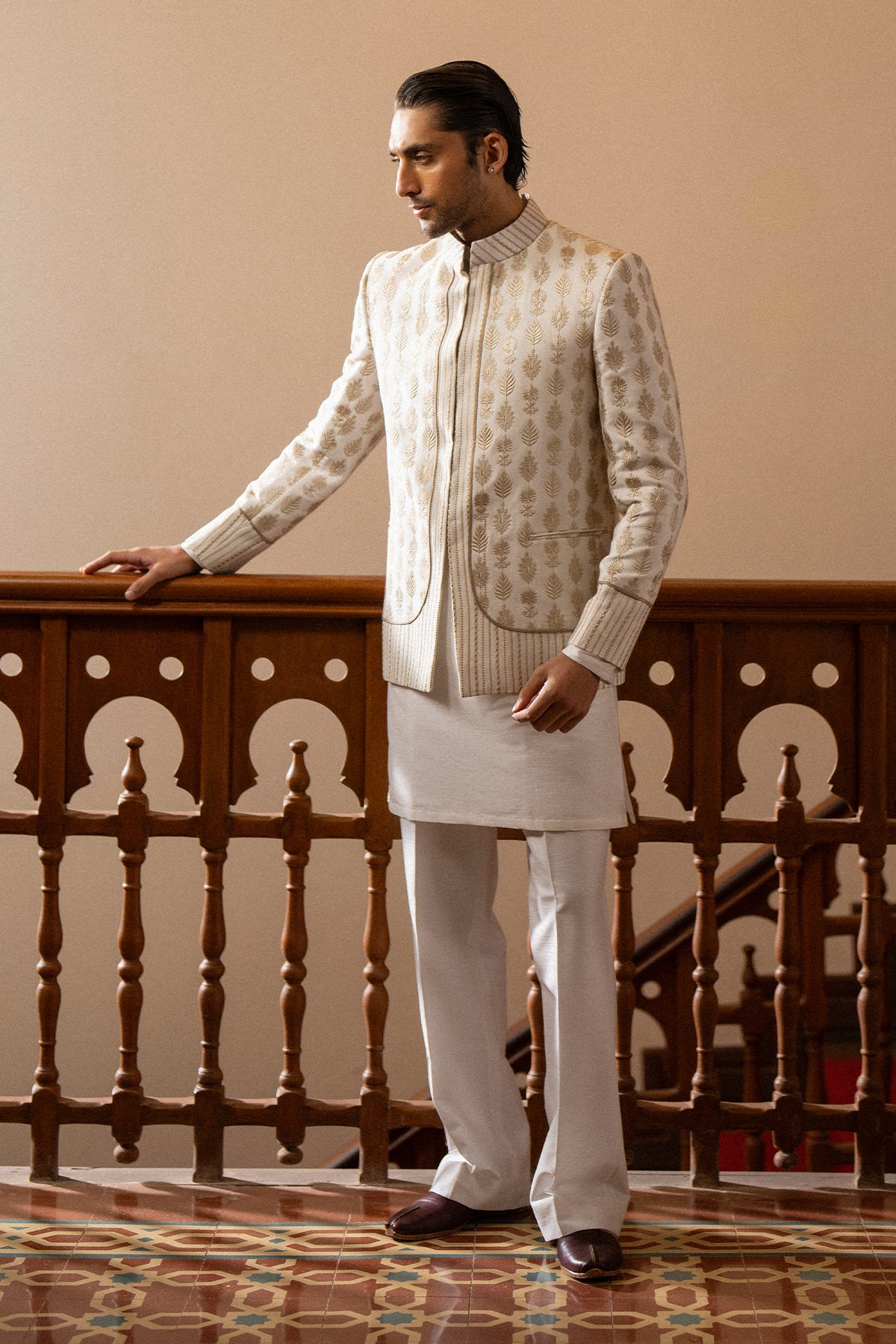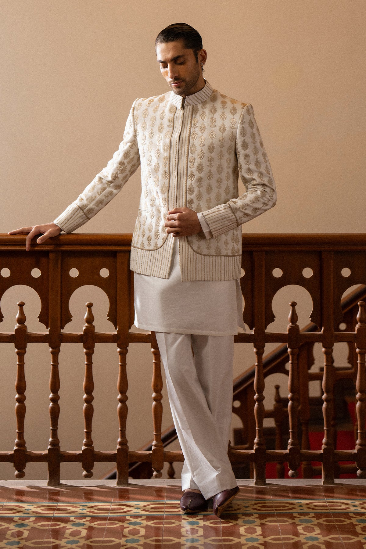 An off-white princess-cut jacket adorned with delicate cream Resham embroidery, paired with matching trousers for an effortlessly graceful and timeless ensemble.