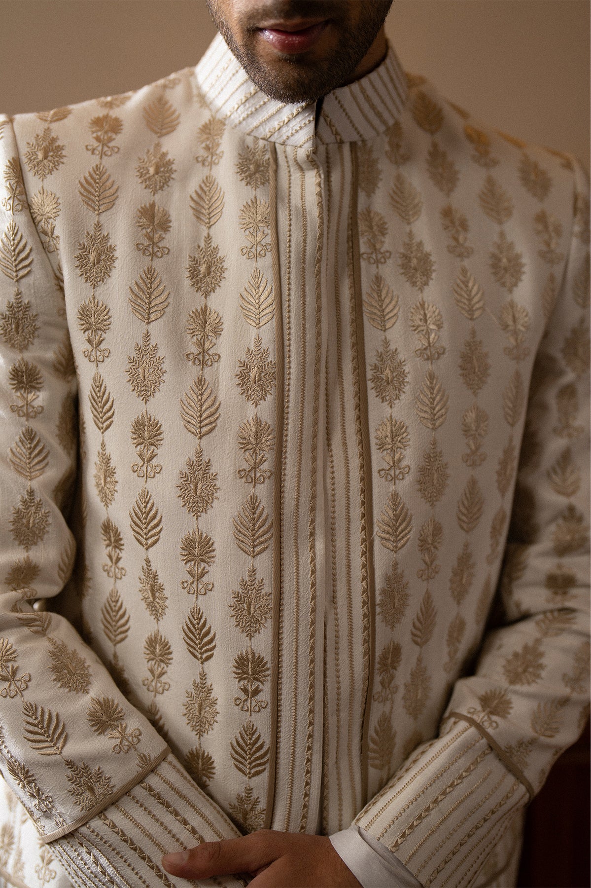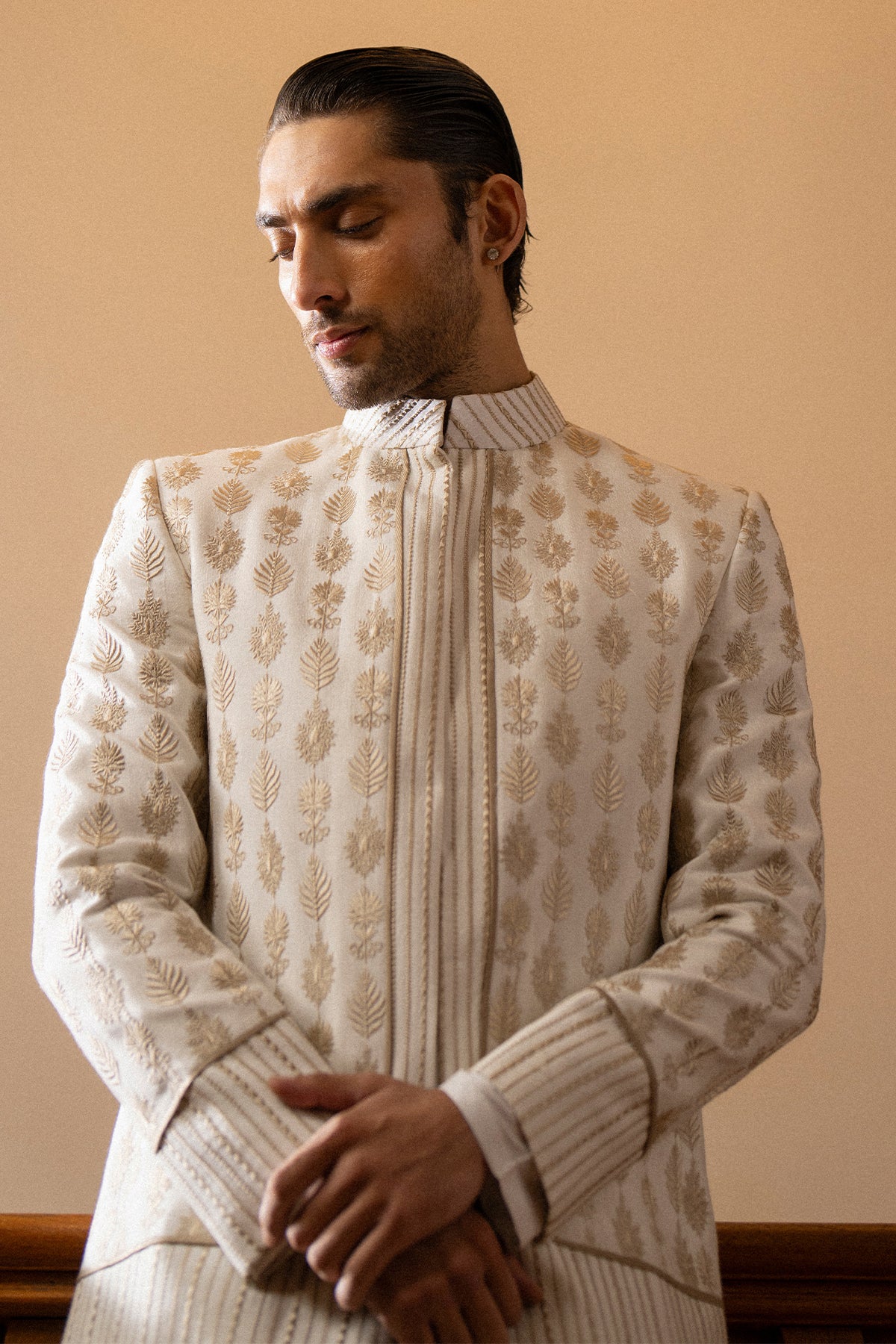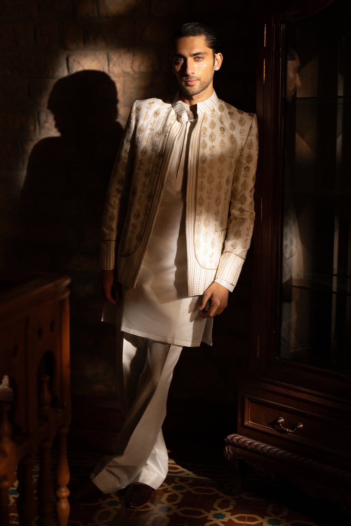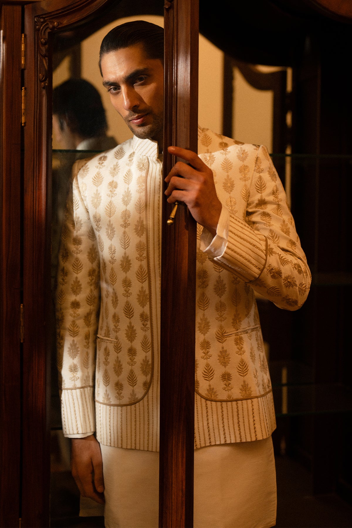 An off-white princess-cut jacket adorned with delicate cream Resham embroidery, paired with matching trousers for an effortlessly graceful and timeless ensemble.