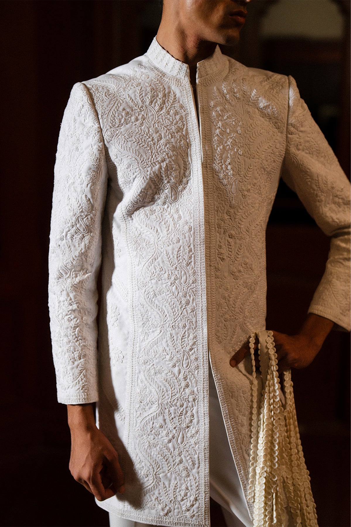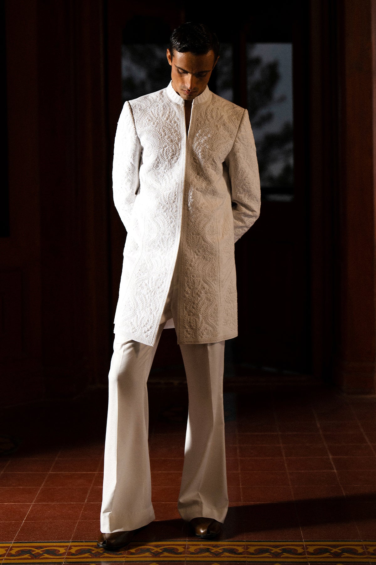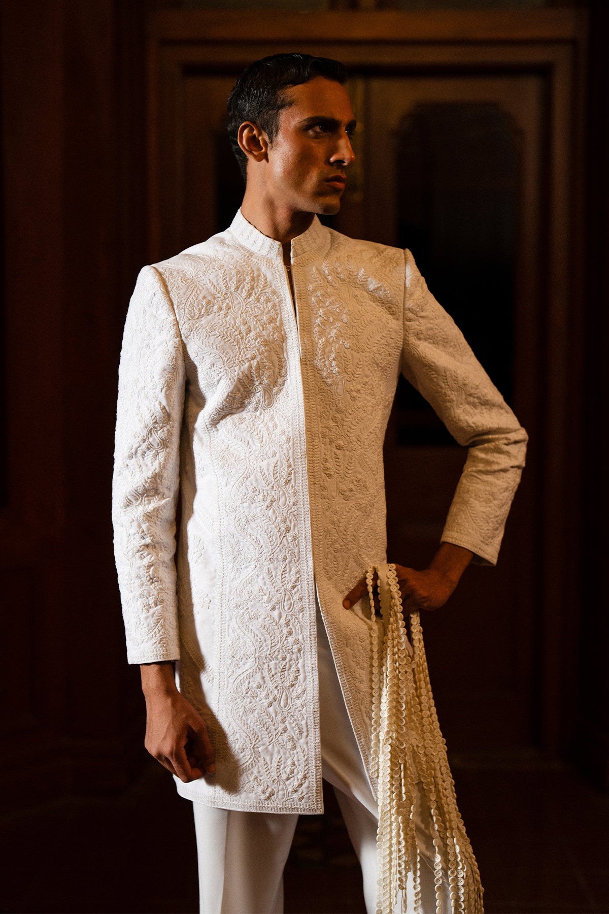 A classy white short sherwani featuring beautiful self-on-self hand doori work. Paired with matching white bootcut pants for a clean and elegant look — perfect for festive and formal occasions