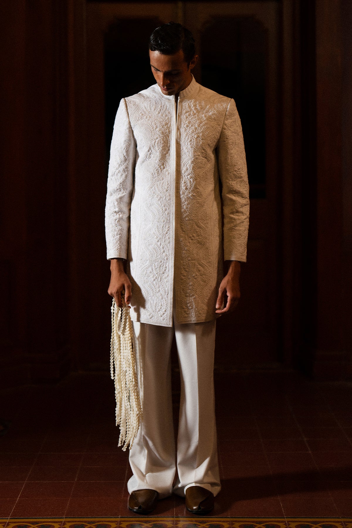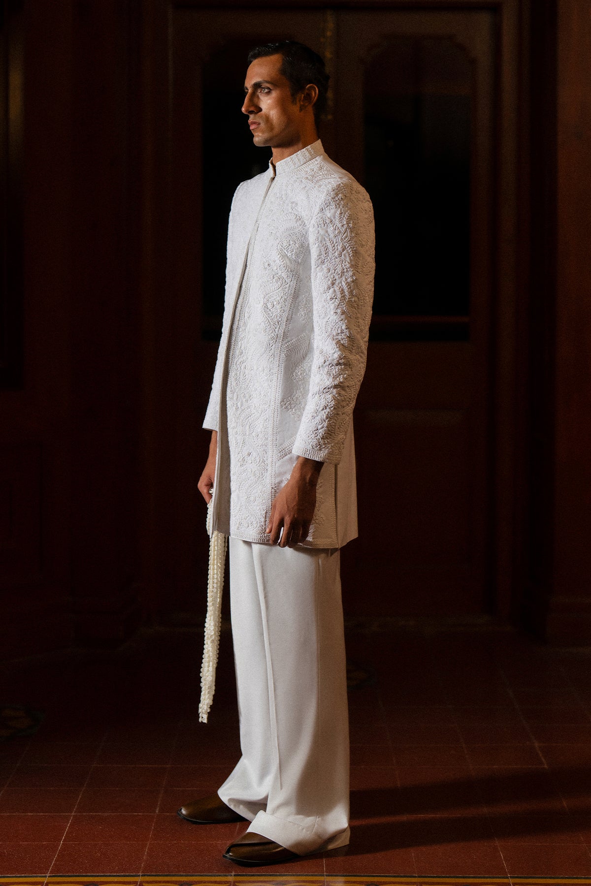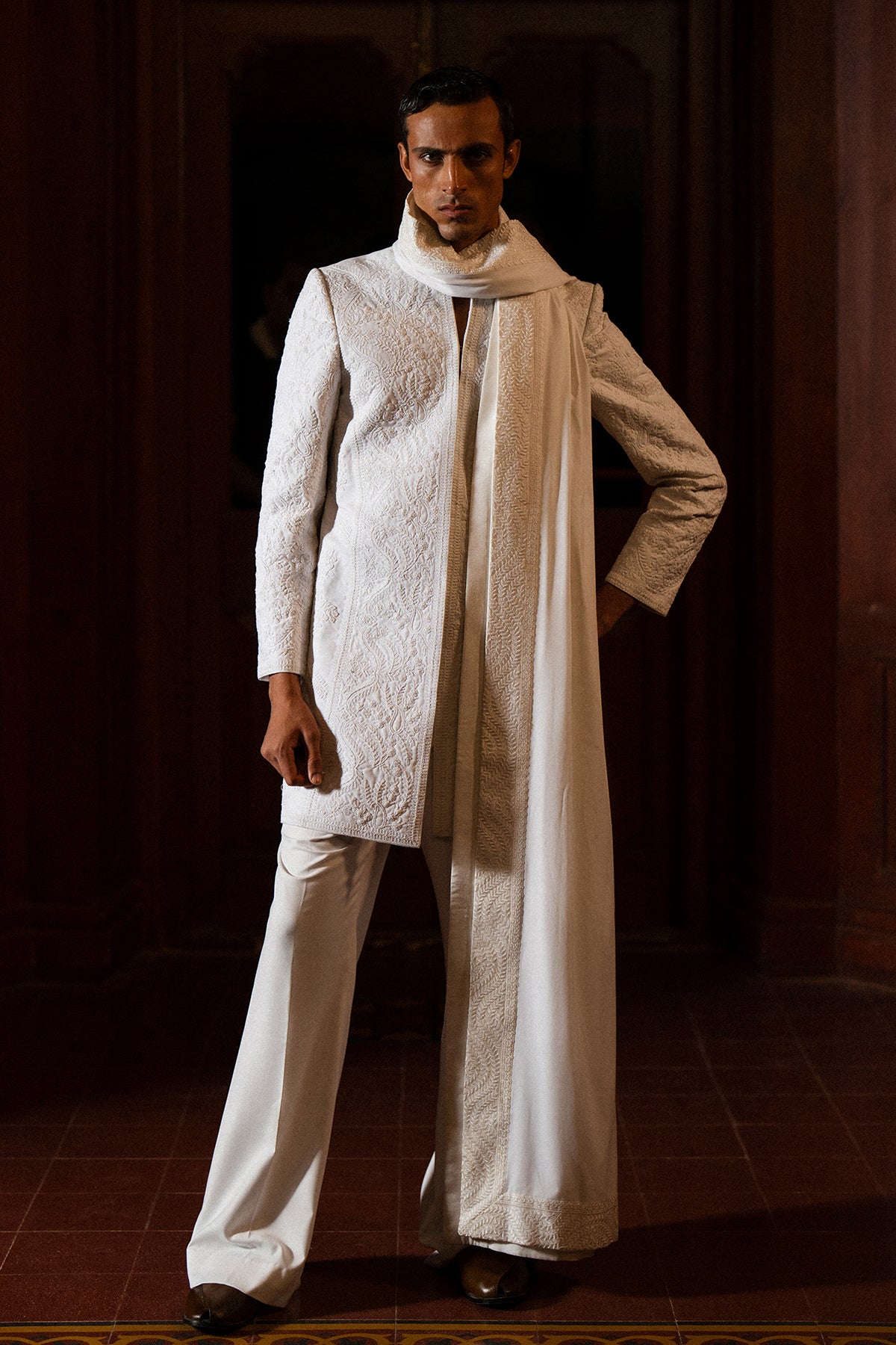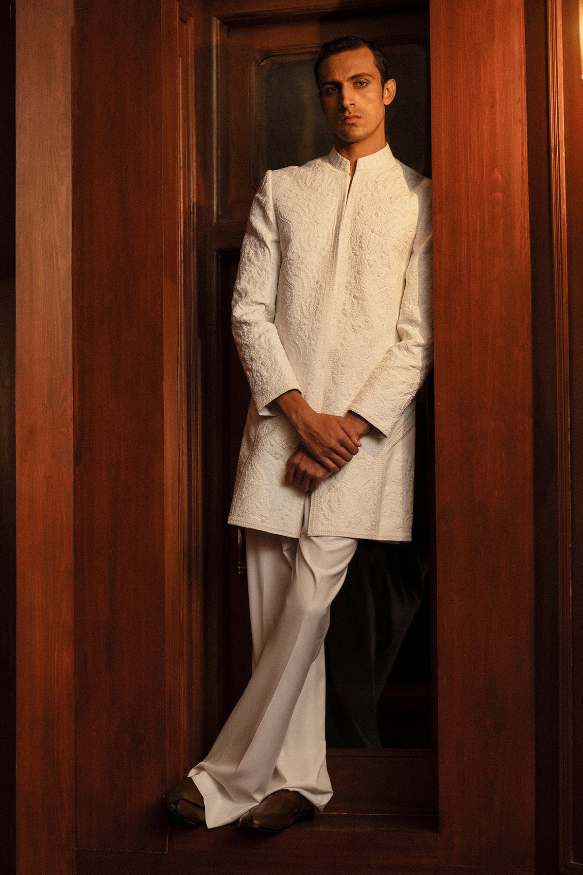 A classy white short sherwani featuring beautiful self-on-self hand doori work. Paired with matching white bootcut pants for a clean and elegant look — perfect for festive and formal occasions